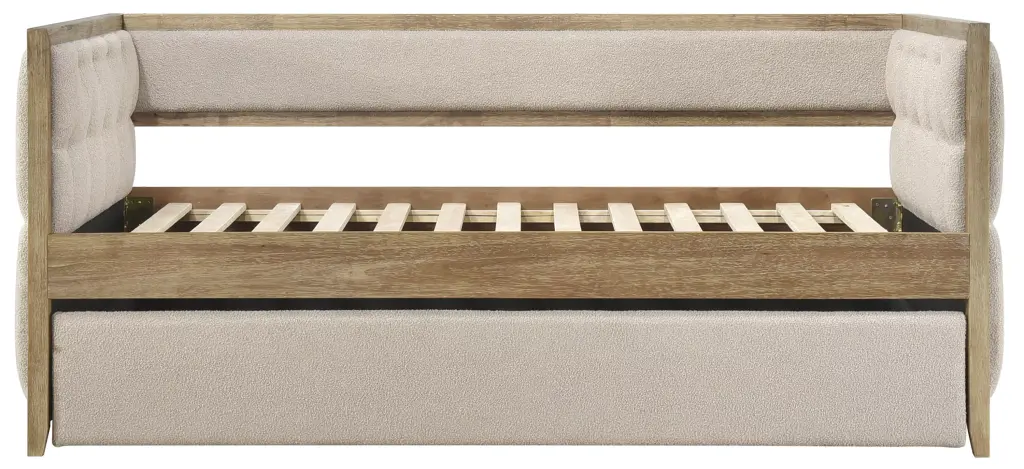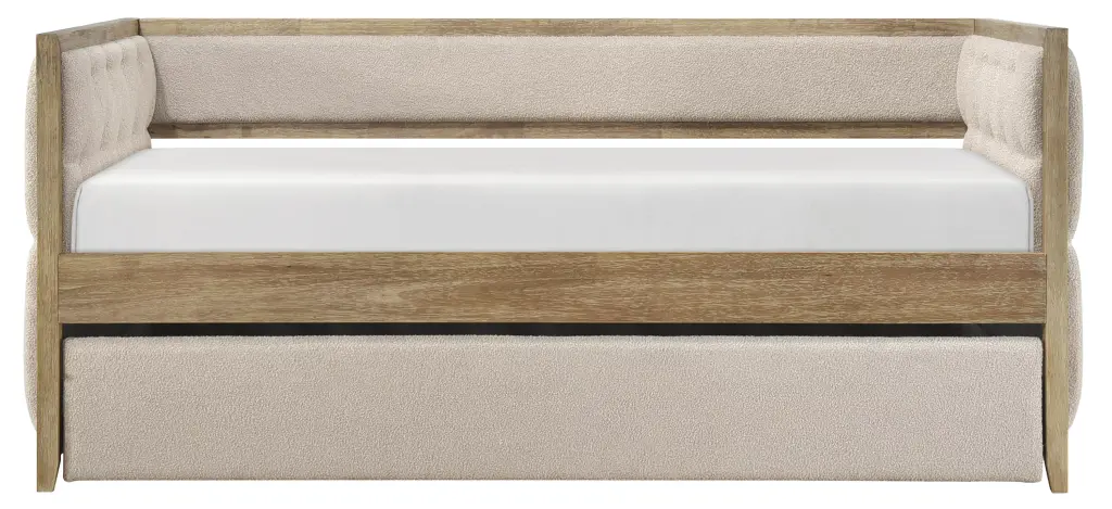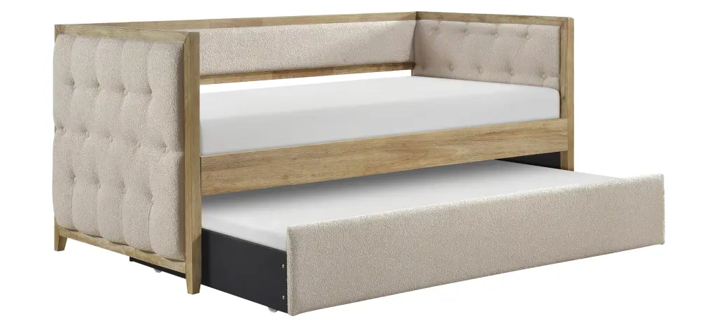 The transitional style of the Andes Collection is a visual delight with design's blending of textures creating a daybed to complement your home's need for a versatile sleep space. Beige boucle fabric upholstery covers the daybed and is accented with button tufting and a show-wood frame - its natural hue further complementing the bed's neutral fabric. Whether used for sleeping or relaxing, the daybed's design allows for placement in a number of room sizes and configurations, while the under-bed trundle pulls out to accommodate your additional sleep space needs.