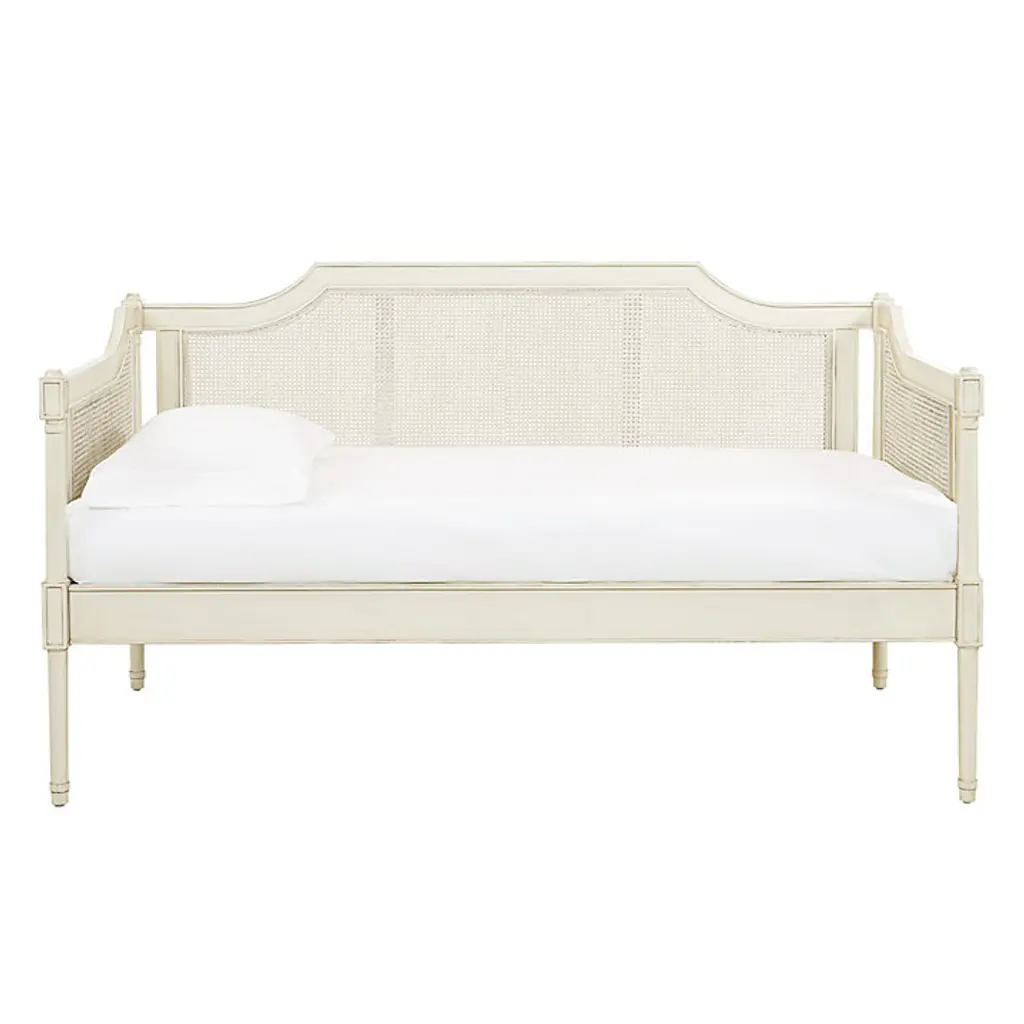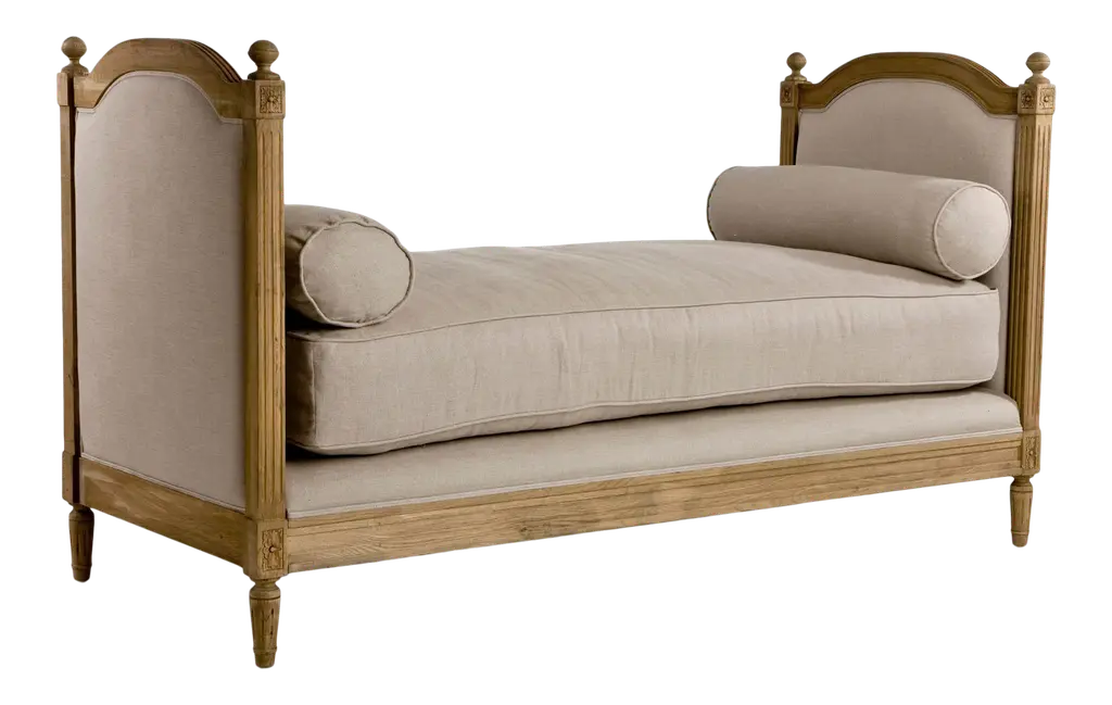 This elegantly constructed daybed by Zentique can be used as a fabulous decorative bench or for your overnight guest. The french traditional daybed has a beautiful grey birch finish and upholstered curved side panels. The cushion is a loose pillow top in natural linen with two neck roll accent pillows on each side. Designed with Zentique's signature natural linen, this European influenced daybed brings the support and comfort needed at any given time of day.