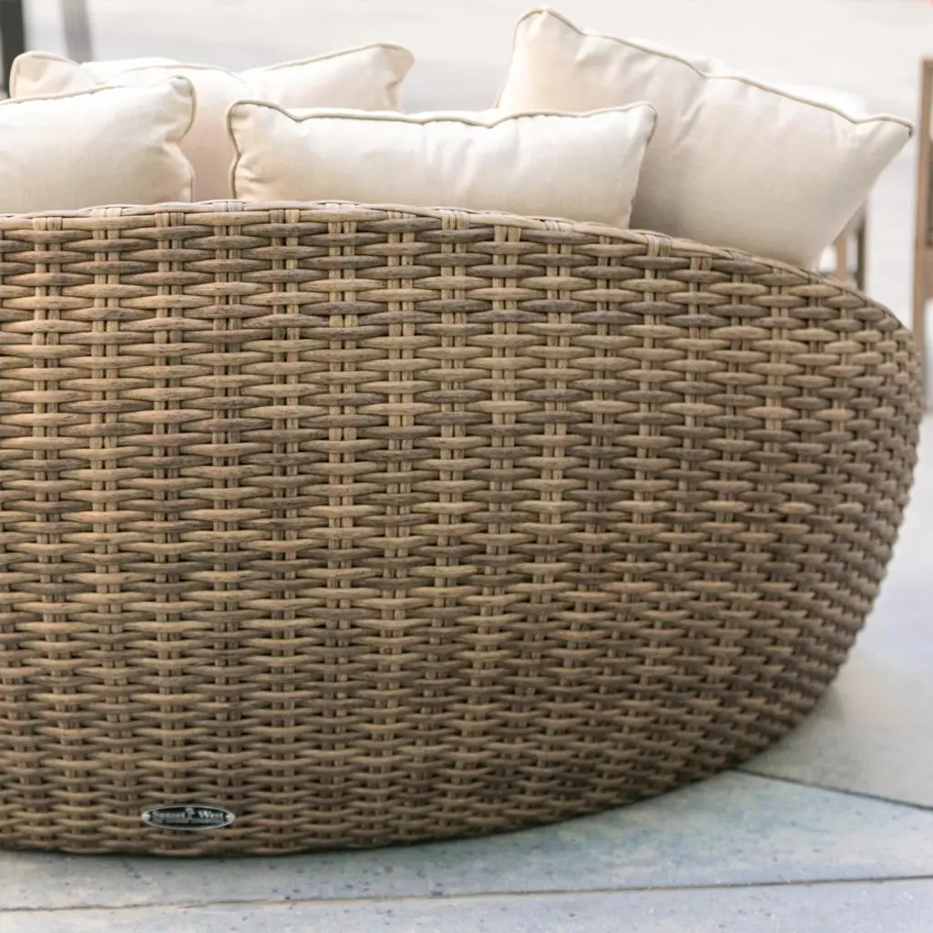 Allow yourself to enjoy the comfort and style of our Aria Coastal Beige Sunbrella Brown Aluminum Round Outdoor Daybed. This round outdoor daybed is upholstered in a soft, beige sunbrella fabric and crafted from a premium all-weather wicker. It will not only be able to withstand any outdoor elements but will be sure to upgrade your outdoor gatherings this summer!