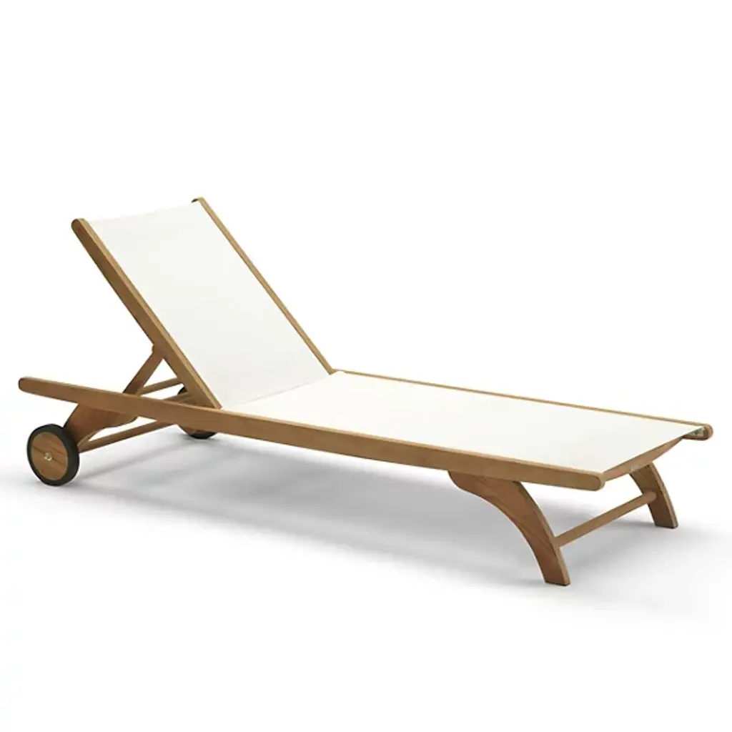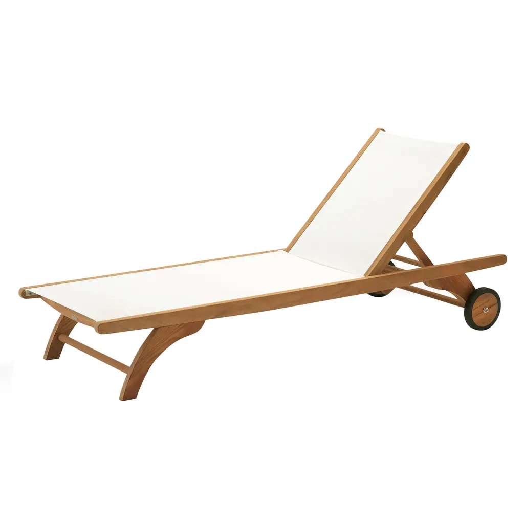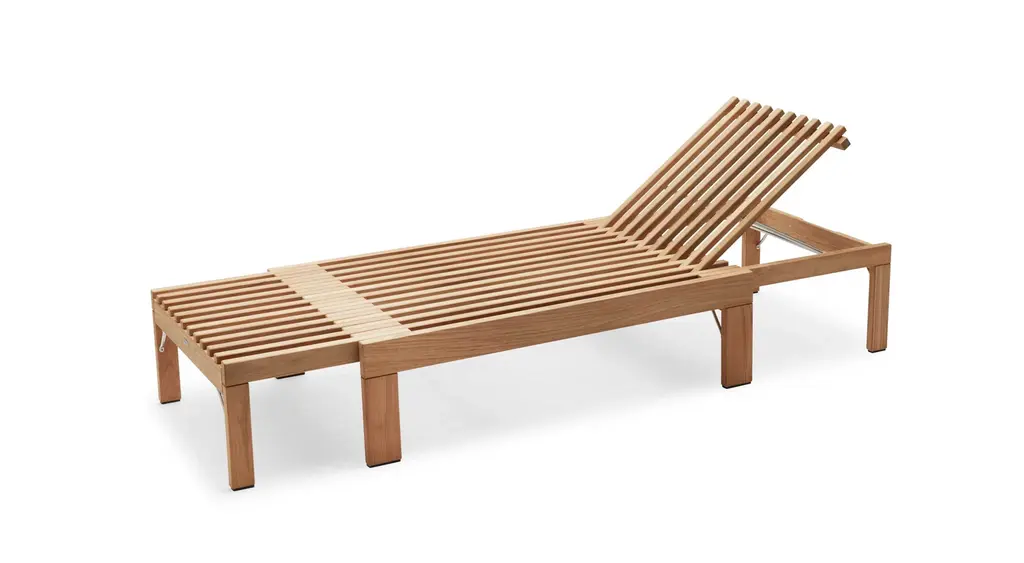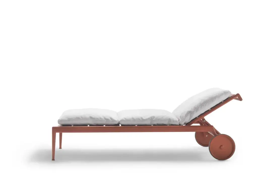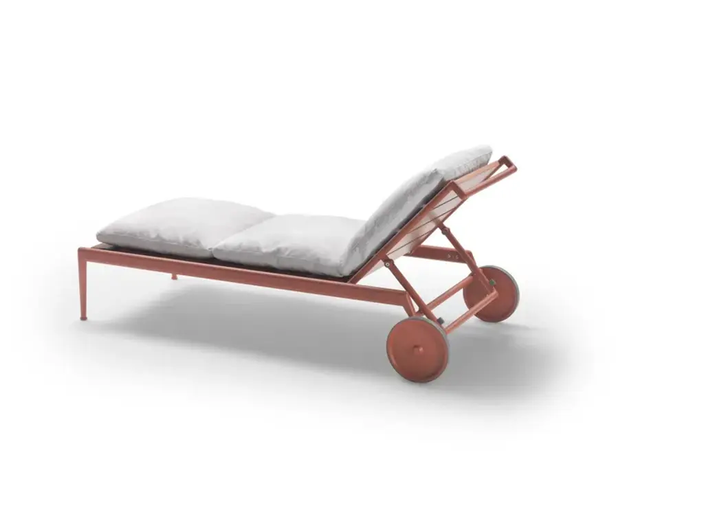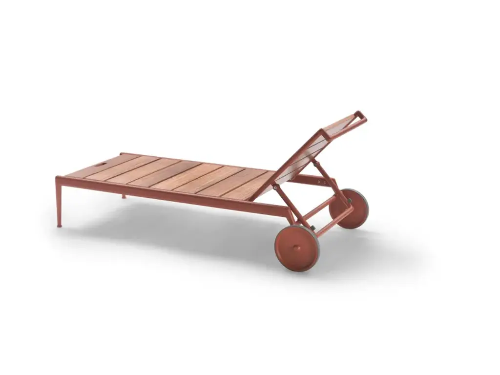 The Atlante Wood daybed offers an interesting combination of materials – the structure is made of aluminum with epoxy powder-coat finish in a palette of elegant colors, while the seat and backrest are made of hand-finished solid wood slats.The cast-aluminum backrest frame can be adjusted to several positions and is equipped with practical wheels for ease of positioning, making the Atlante Wood daybed the ideal complement poolside, in the backyard, or on a deck or terrace.The upholstered cushion is an optional accessory that ensures the Atlante Wood daybed is even more comfortable and inviting.The Atlante Wood daybeds are stackable and can be stored in a dry location during the winter months.If not in use for long periods of time, to maintain the Atlante Wood daybeds in good condition and as close as possible to their original state, protecting them with their respective waterproof covers is highly recommended.Features:Structure in cast aluminum, epoxy powder-coated in colors: white 100, wine red 405, khaki green 705, burnished, glossy grey 715; or, in embossed lacquered finish in white 300, sand 310, brick 320, sage green 330, terracotta 325, forest green 335, charcoal 350. Backrest recliner system with integrated bracket.Seat and backrest in solid iroko slats, natural finish, stained grey, stained brown, or lacquered white finish.Seat cushion in polyester fiber upholstered in water-repellent fabric. Upon request, with upcharge.Feet in cast aluminum with epoxy powder-coat finish in the same color as the structure. Feet rest on tips made of thermoplastic material.Wheels 26 cm diameter, in cast aluminum with epoxy powder-coat finish in the same color as the structure. With profile in grey thermoplastic material.Upholstery in removable fabric.Cover in waterproof material. Cover is upon request, with upcharge.Atlante, Italian for Atlas, the mythical Titan who bears the world on his shoulders, identifies an outdoor furnishing system that is a marriage of thoughtful aesthetic experimentation and extraordinary versatility in terms of personalization.Made up of stand-alone and sectional sofas as well as daybeds, the Atlante family is available in many types and finishes that invite great interpretive freedom in the design of outdoor spaces.