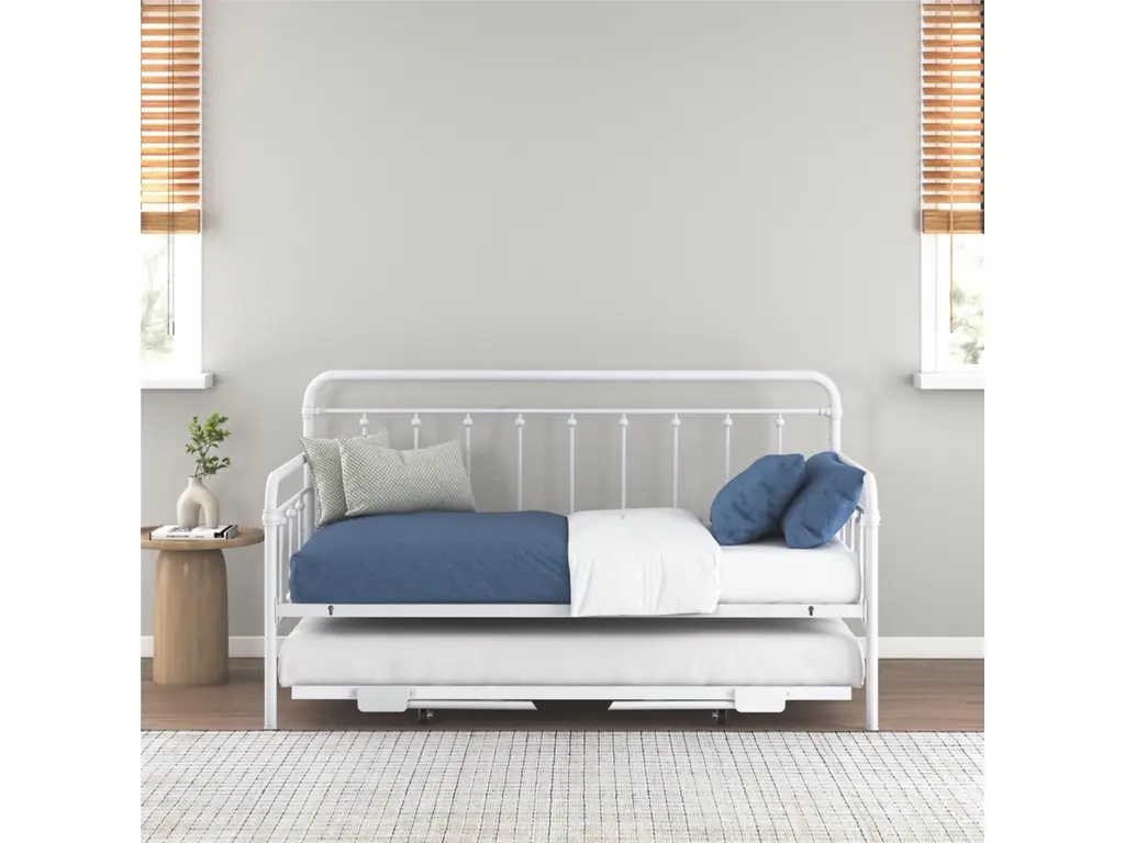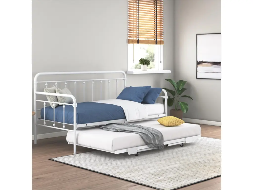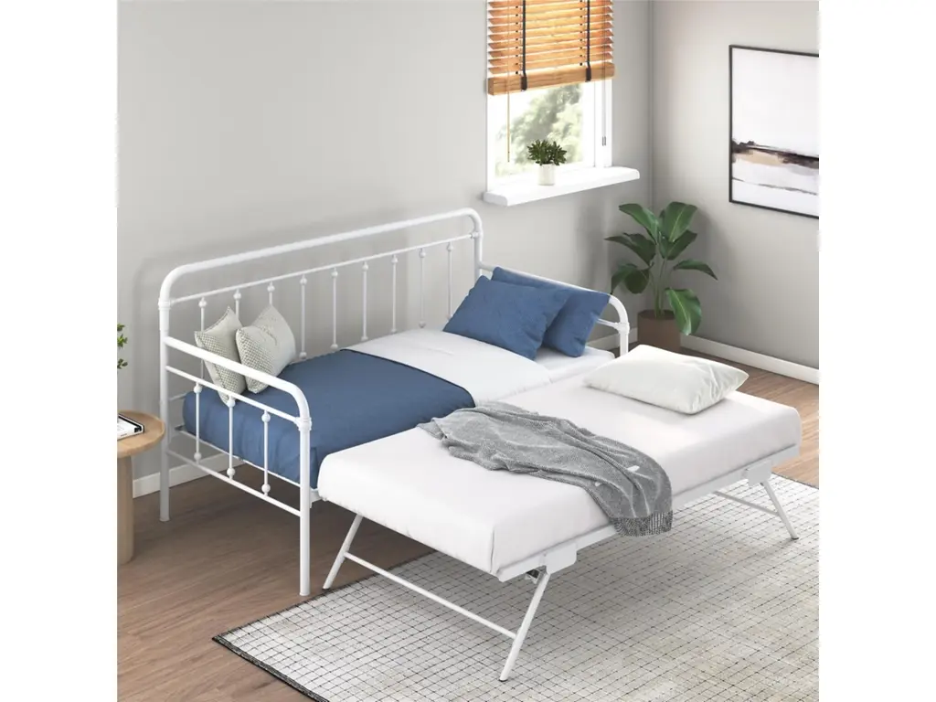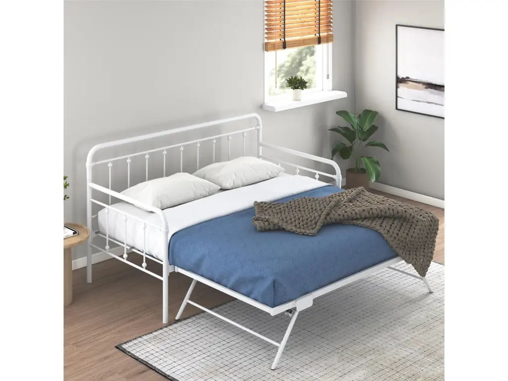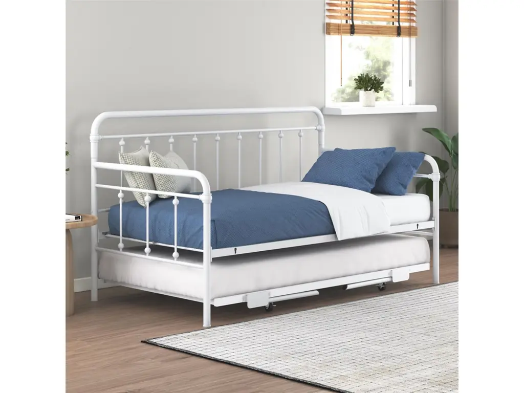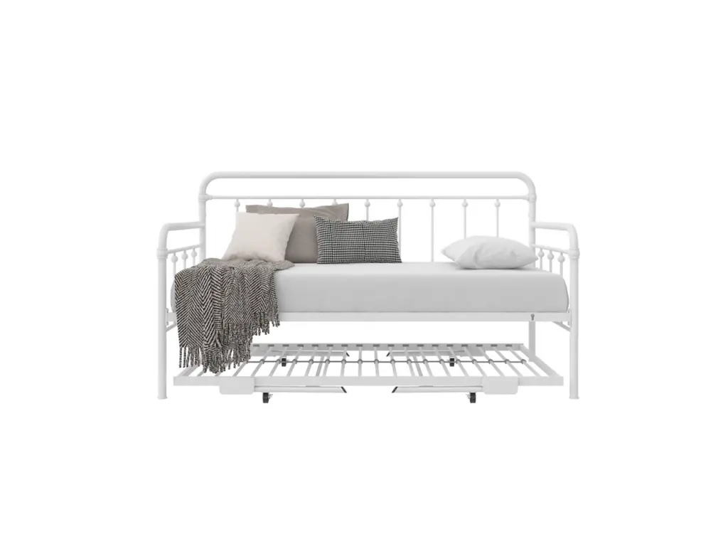 A step above, the modern living room Atwater Living Marcus Twin Metal Daybed includes a lift-up trundle that raises to even height with the couch using foldable legs to create a large locked in place sofa bed or separates as a standalone guest twin bed.