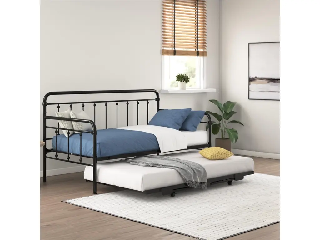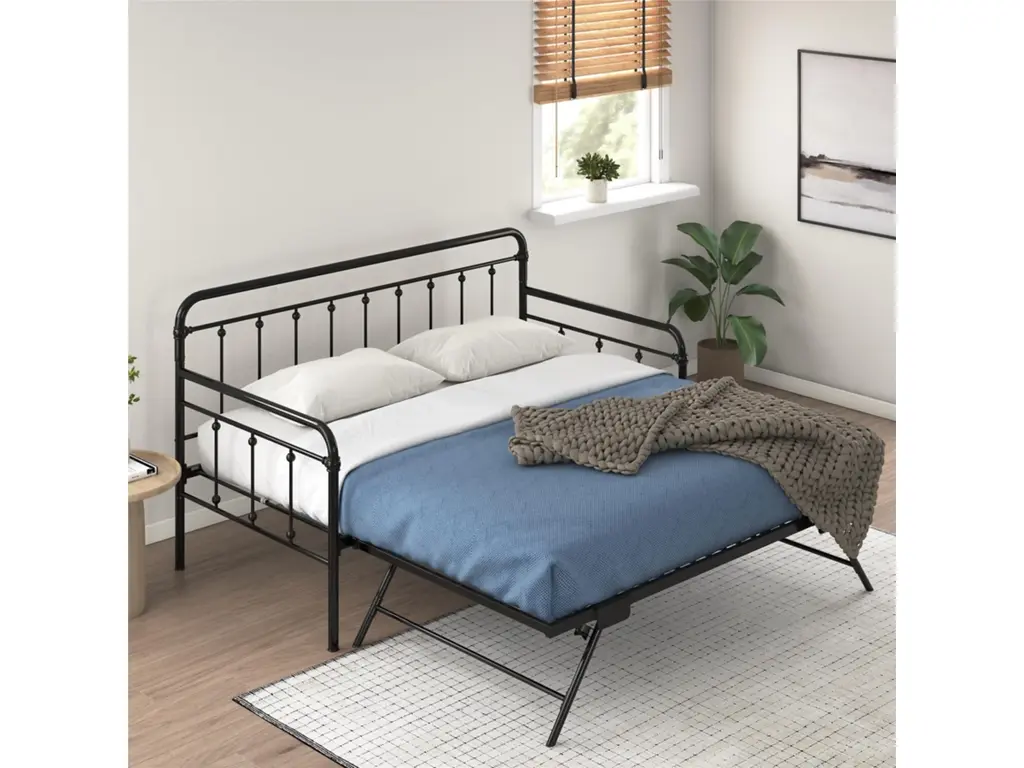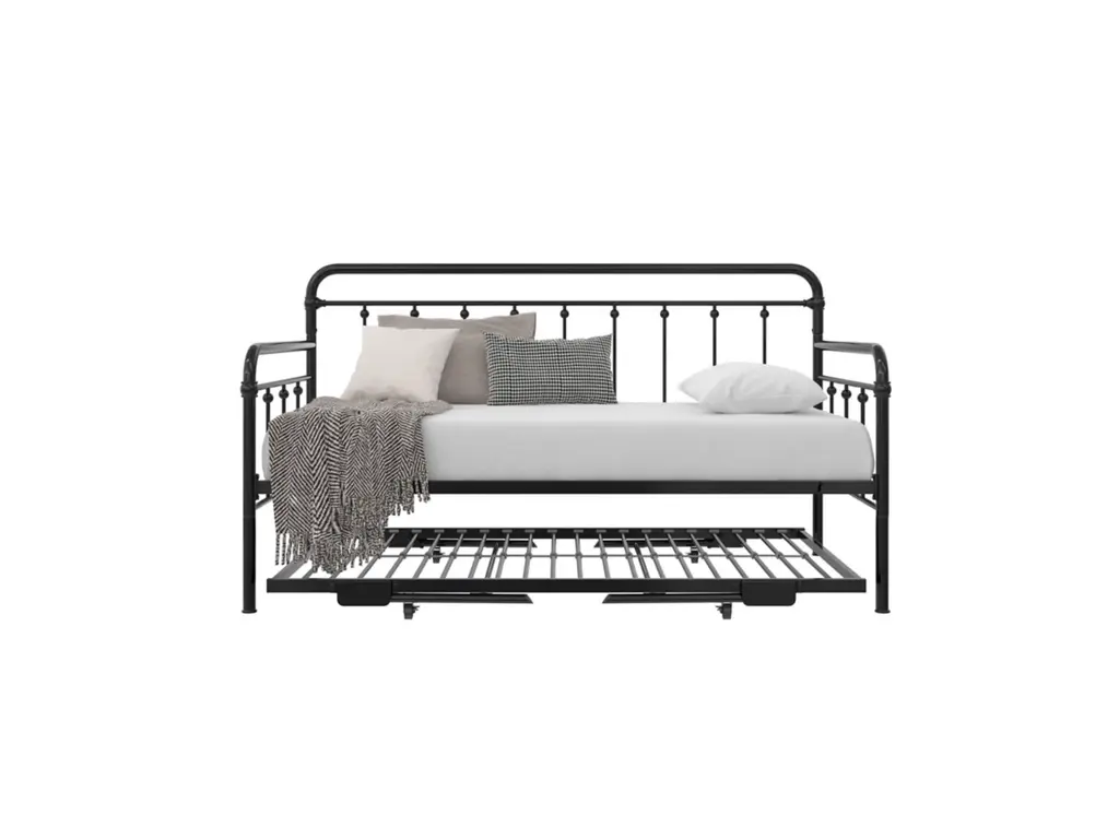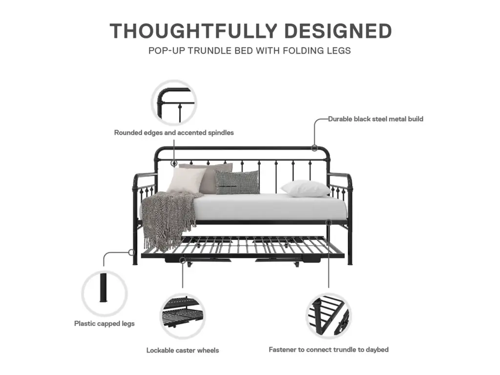 A step above, the modern living room Atwater Living Marcus Twin Metal Daybed includes a lift-up trundle that raises to even height with the couch using foldable legs to create a large locked in place sofa bed or separates as a standalone guest twin bed.