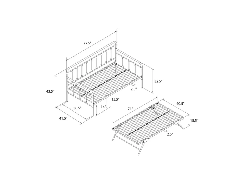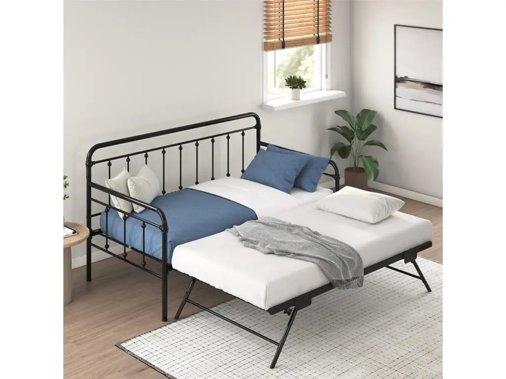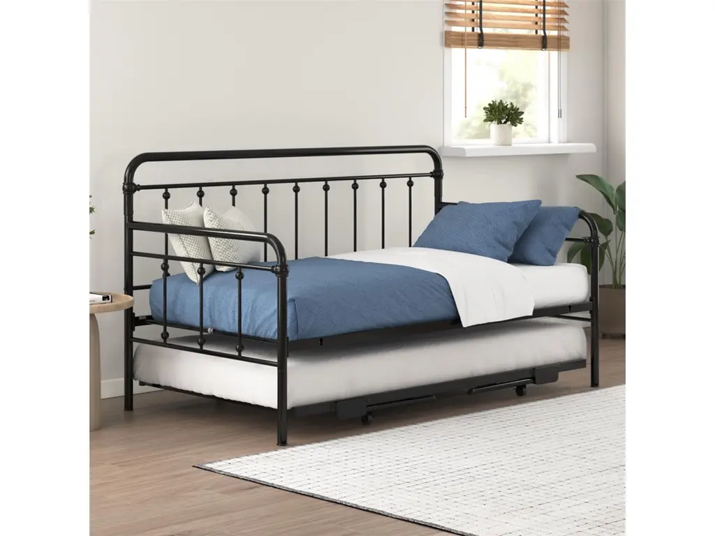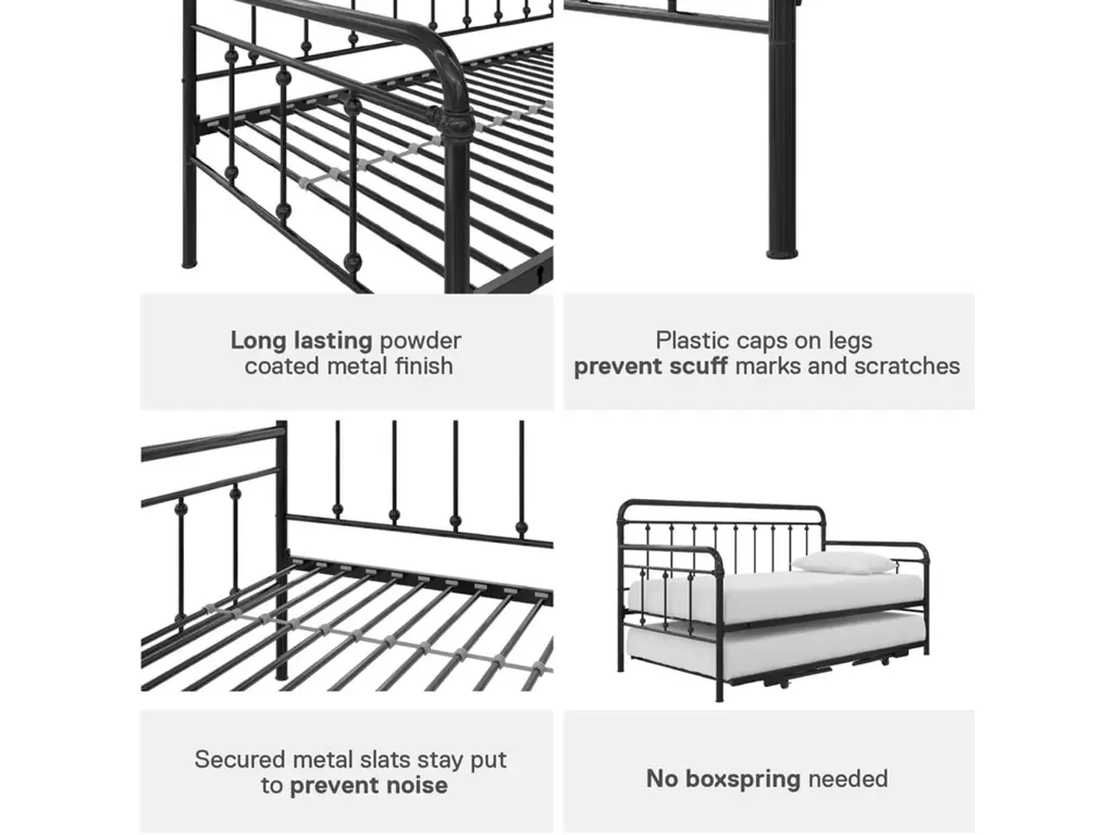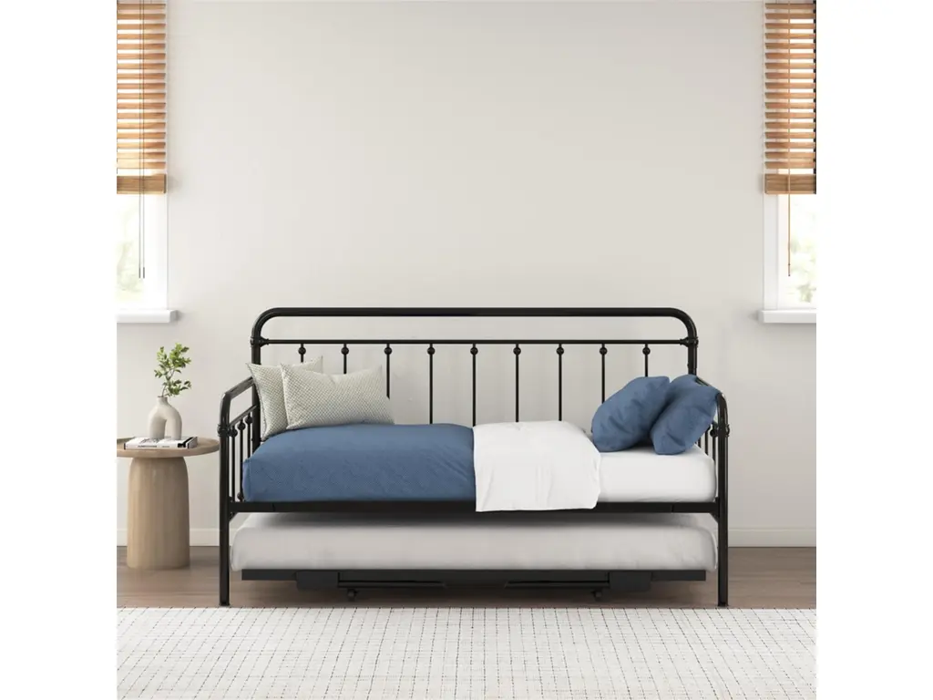 A step above, the modern living room Atwater Living Marcus Twin Metal Daybed includes a lift-up trundle that raises to even height with the couch using foldable legs to create a large locked in place sofa bed or separates as a standalone guest twin bed.
