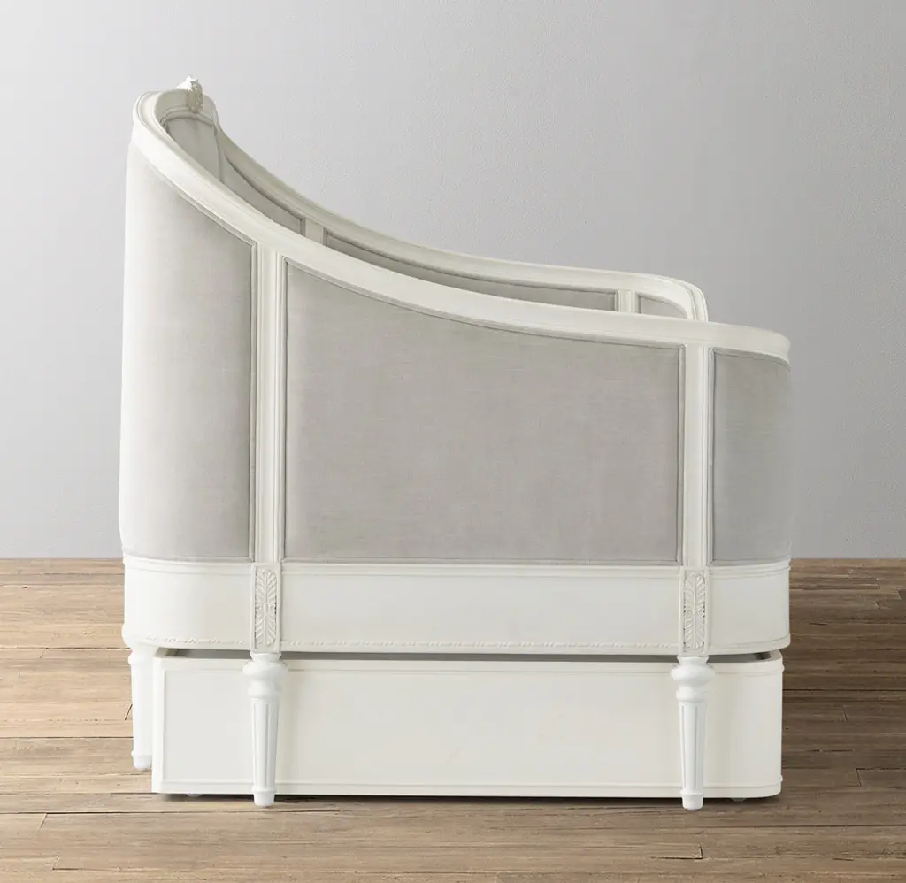 Elegantly upholstered panels transform Aveline's reserved shelter style. Carved molding accentuates its graceful lines, while a central rosette serves as a striking focal point. SHOP THE ENTIRE COLLECTION