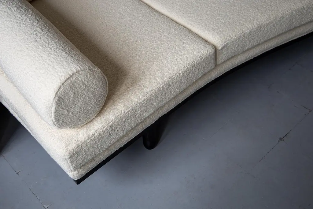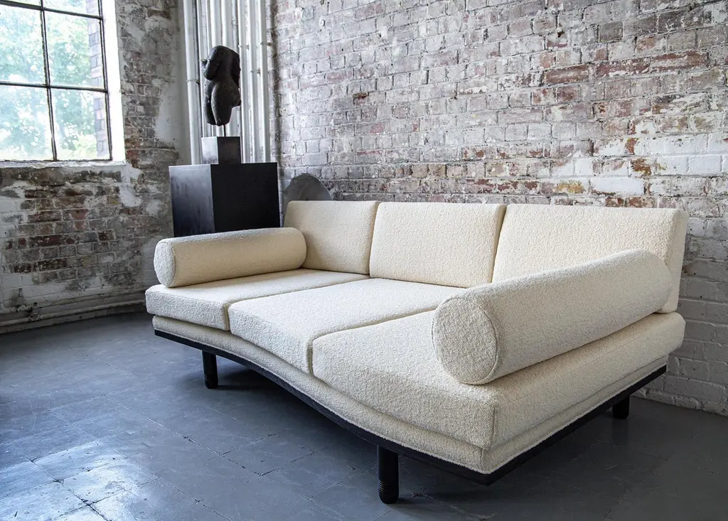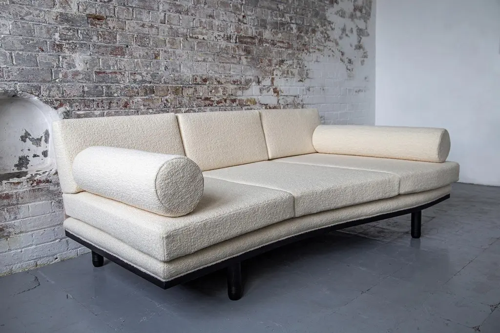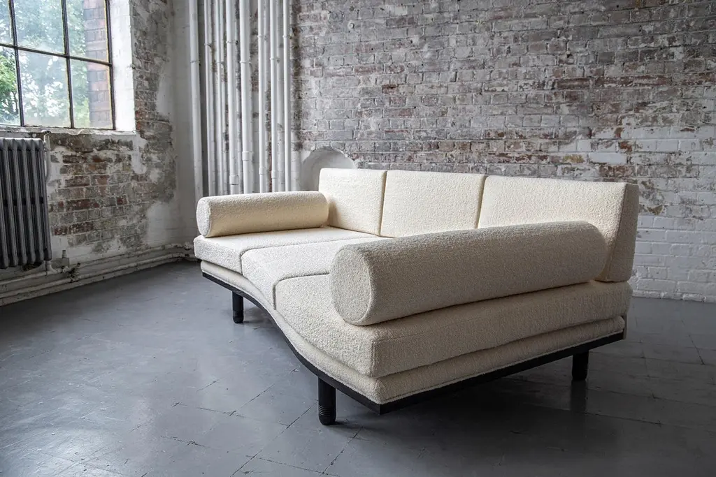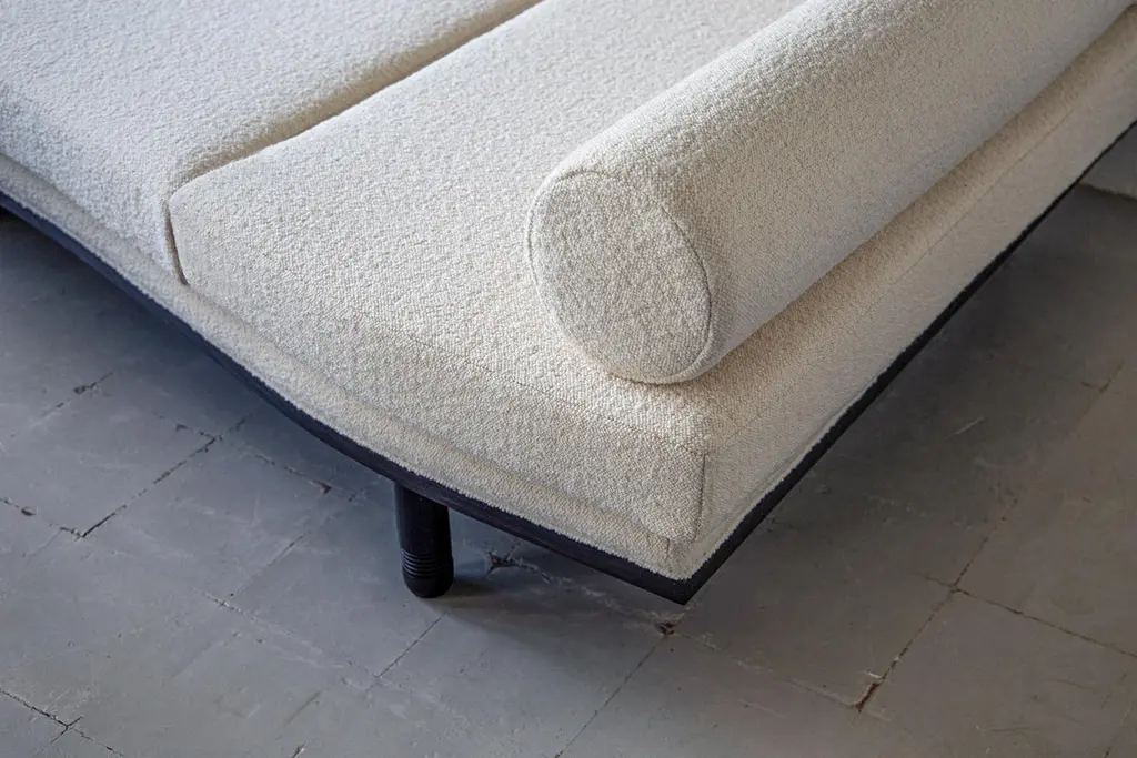 A decadent three-seat sofa daybed of sculptural trapezoidal form inspired by the fallen architectural ruins of the ancient city of Baalbek, a Levantine outpost on the Roman frontier. Featuring plinth bolsters, removable arched back support and deep sweeping curves. The frame is bespoke joinery in solid Ash wood and finished in a dead matte black.This item is priced excluding fabric, seen here upholstered in Dedar Milano Karandash bouclé. All cushion covers are made to be removable and fully fire retardant. Please contact us regarding your choice of fabric so that we can send you an additional quote for the material.Available to order in a fabric of your choice - NB: fabric not includedLead time - 12 weeks Dimensions as shown: L 214 cm x H 80 cm x D 94 cm / Max D 120 cm, seat H 40 cm.