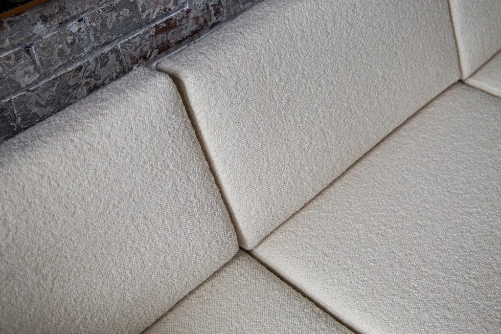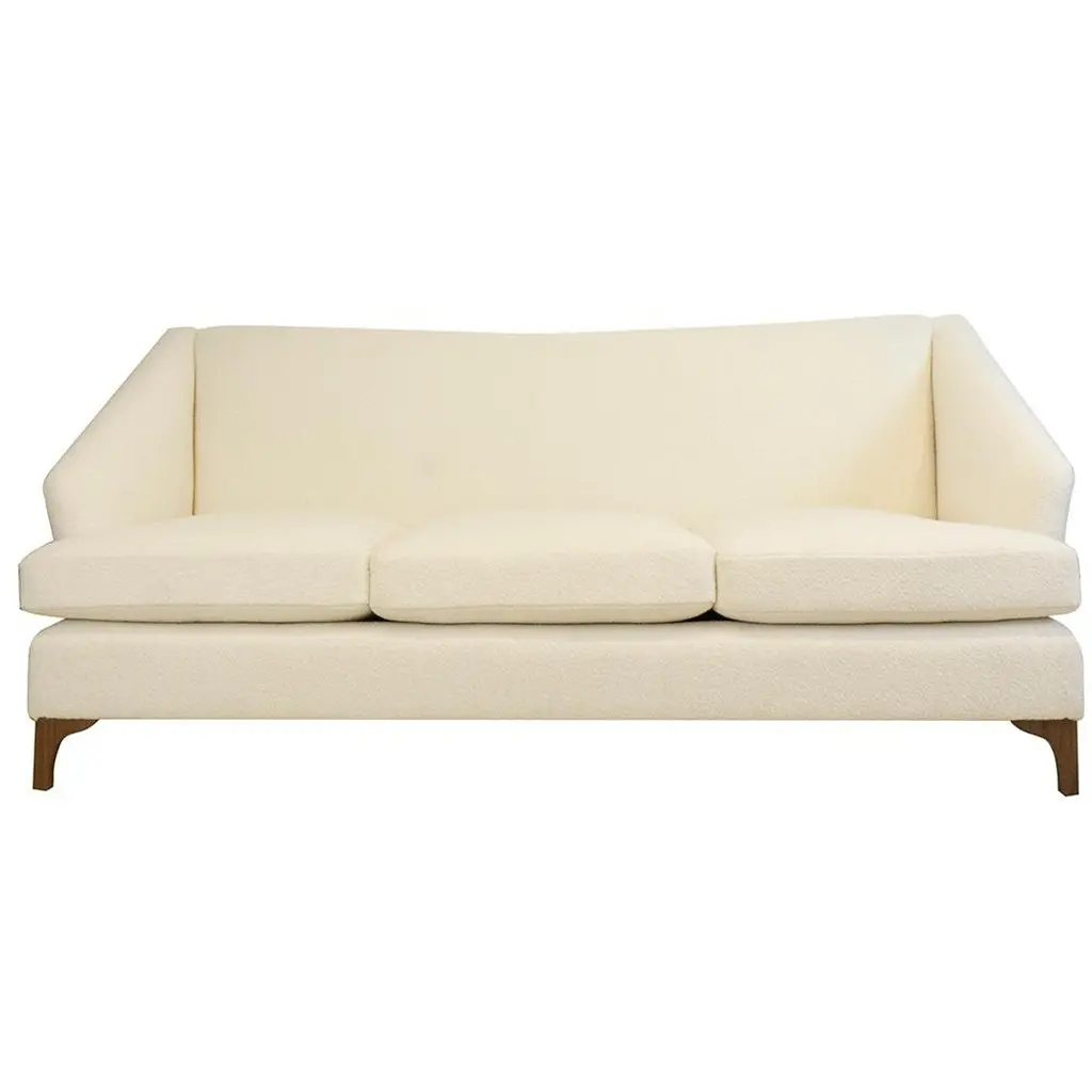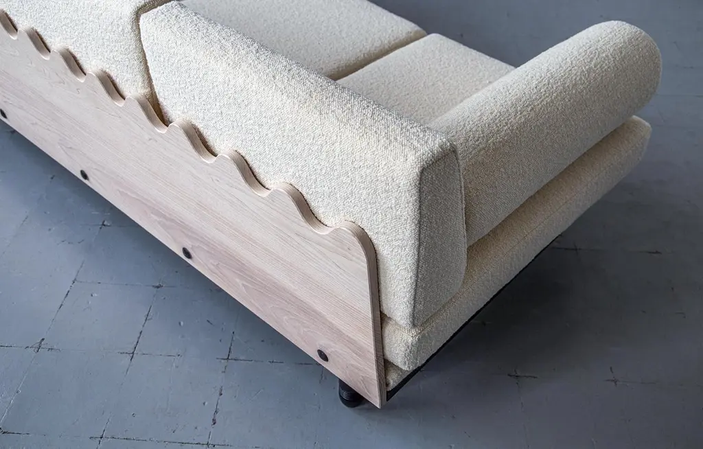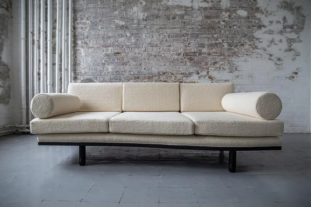 A decadent three-seat sofa daybed of sculptural trapezoidal form inspired by the fallen architectural ruins of the ancient city of Baalbek, a Levantine outpost on the Roman frontier. Featuring plinth bolsters, removable arched back support and deep sweeping curves. The frame is bespoke joinery in solid Ash wood and finished in a dead matte black.This item is priced excluding fabric, seen here upholstered in Dedar Milano Karandash bouclé. All cushion covers are made to be removable and fully fire retardant. Please contact us regarding your choice of fabric so that we can send you an additional quote for the material.Available to order in a fabric of your choice - NB: fabric not includedLead time - 12 weeks Dimensions as shown: L 214 cm x H 80 cm x D 94 cm / Max D 120 cm, seat H 40 cm.