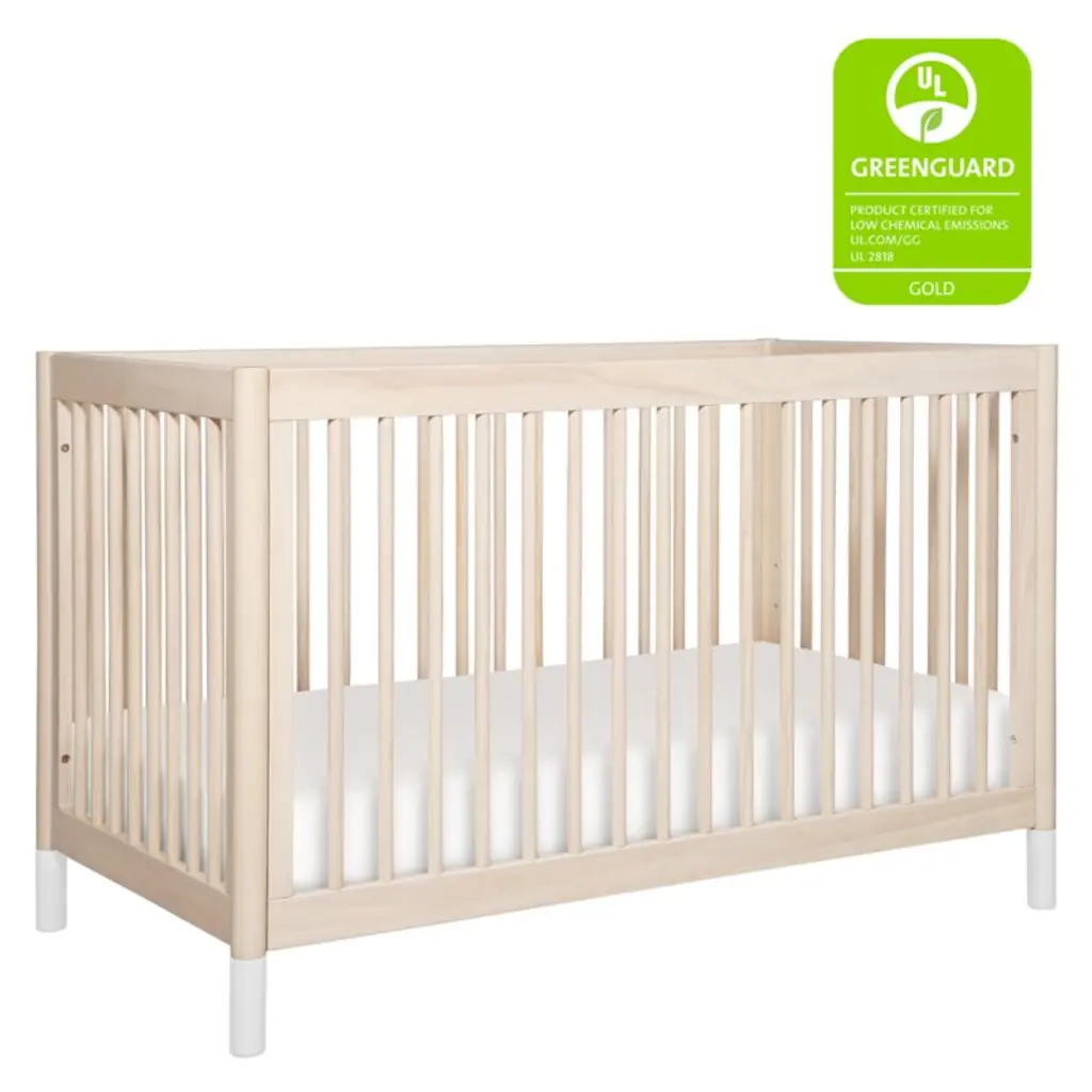 With its 4-in-1 design, the Babyletto Gelato Convertible Crib grows with your child from nursery to big-kid room. The included conversion kit transforms it from a crib, to a toddler bed, to a daybed. It features a simple, Scandinavian-inspired design and a beautiful white finish, plus stylish rounded spindles and washed natural wood feet for an eye-catching, two-toned look. Made of solid New Zealand pine, the crib is GREENGUARD Gold Certified.Learn how to choose a crib.
