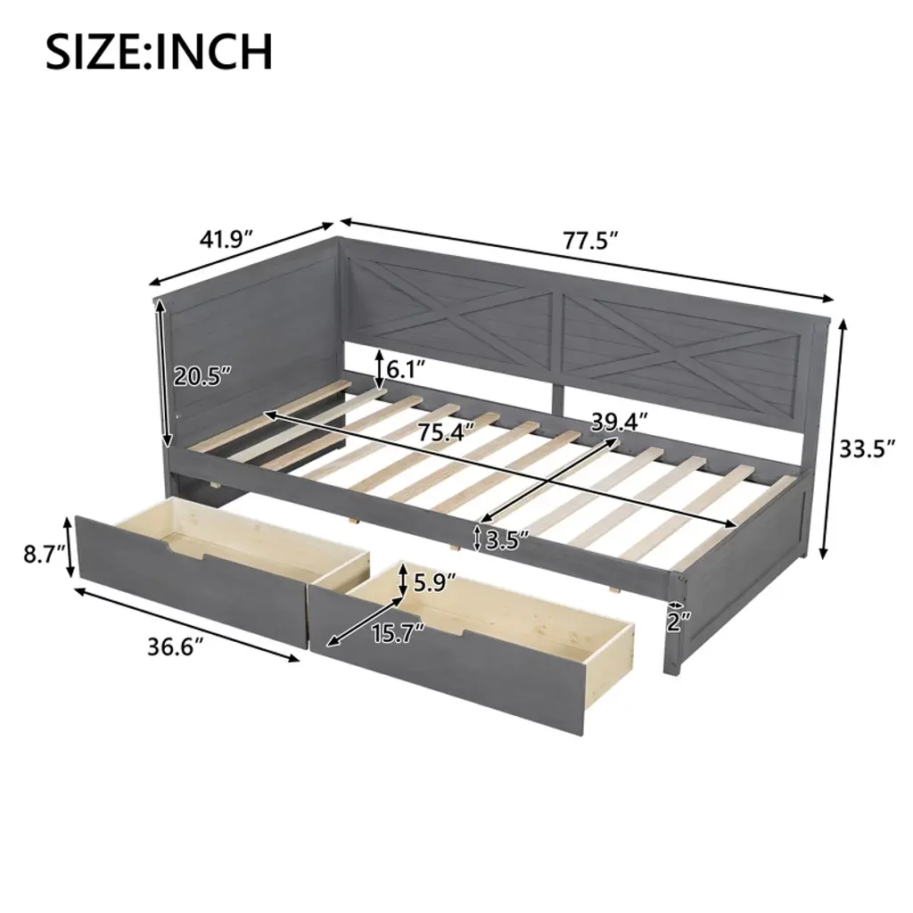 Bellemave Rustic Twin Size Daybed Frame With Storage Drawers, Wood Daybed Twin Size With Storage For Living Room,bedroom Guest Room,grey
