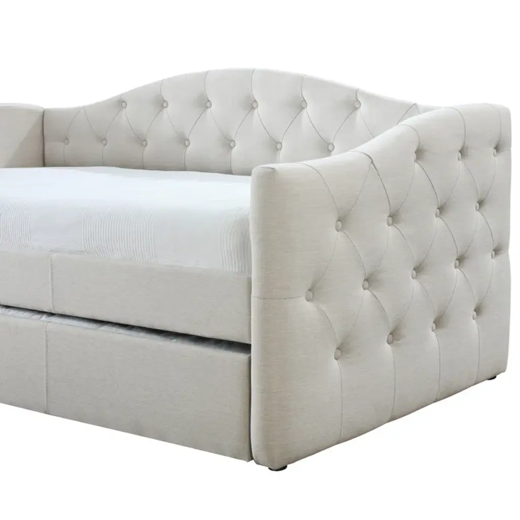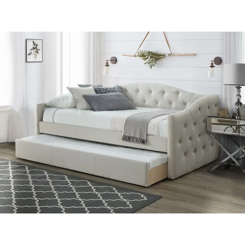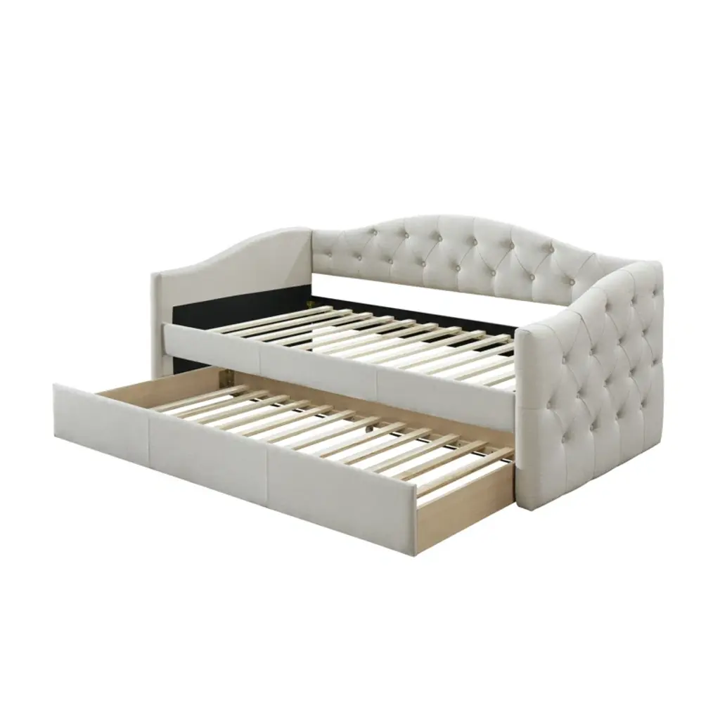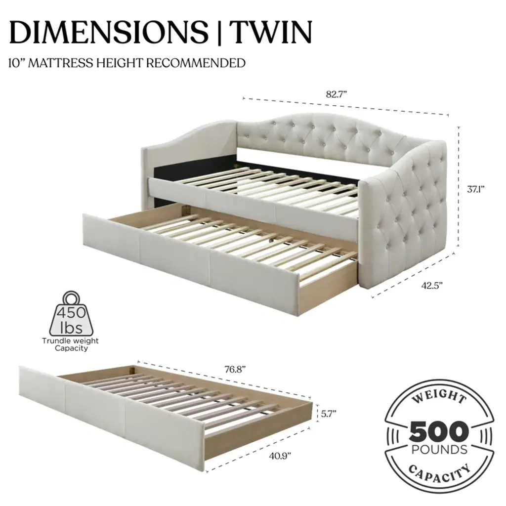 Looking for a piece of furniture that is as versatile as it is stylish? Look no further than our 3-in-1 bed! This traditional day bed can be used as a sofa, bed and guest bed, making it the perfect solution for small bedrooms, offices and homes that don’t have an extra guest room. Upholstered in a soft fabric with diamond button tufting, this daybed sofa is both stylish and comfortable. The pull-out trundle on casters makes it easy to open and close, and can accommodate two standard twin size mattresses (not included). Don’t miss out on this must-have piece.