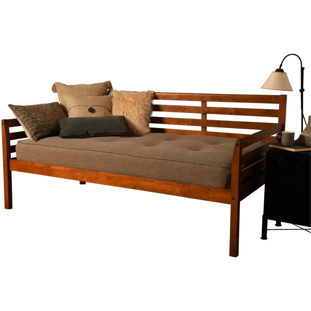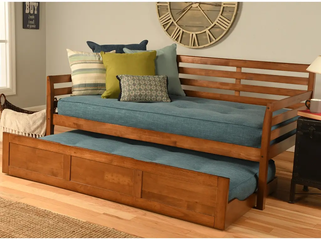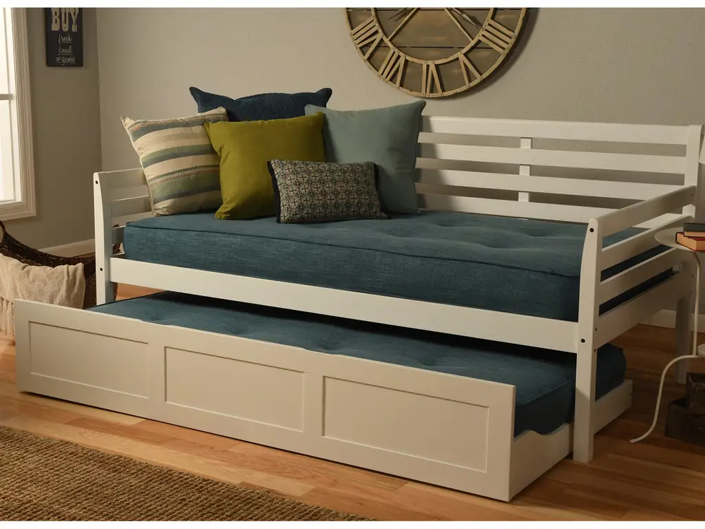 The Boho Daybed boasts clean lines and attractive angles. The trundle feature has sturdy casters that make the trundle easy to operate. The Barbados Medium Brown, Rustic Walnut, and White finishes will blend in with many color schemes in your home. The 2 included mattresses feature a tufted Linen Aqua upholstery grade fabric cover. The core of the mattress consists of 312 Bonnel Spring, Cotton and High Density Foam. Whether you’re using it every day, or just on occasion, this daybed will hold up to your lifestyle.