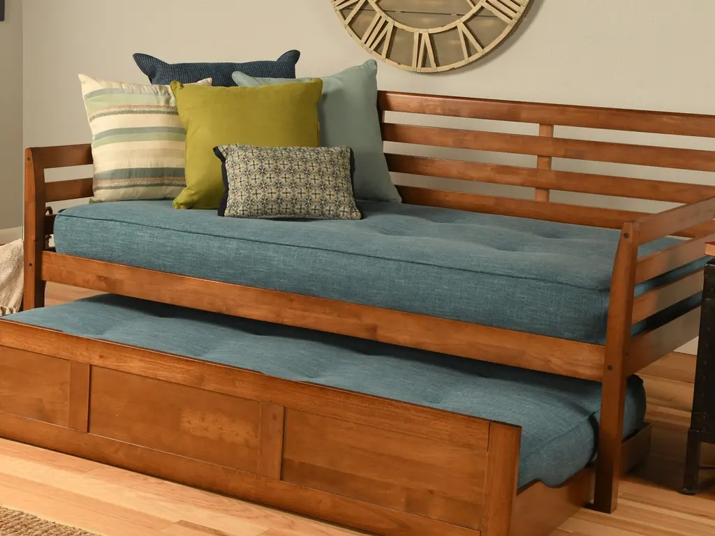 The Boho Daybed boasts clean lines and attractive angles. The trundle feature has sturdy casters that make the trundle easy to operate. The Barbados Medium Brown, Rustic Walnut, and White finishes will blend in with many color schemes in your home. The 2 included mattresses feature a tufted Linen Aqua upholstery grade fabric cover. The core of the mattress consists of 312 Bonnel Spring, Cotton and High Density Foam. Whether you’re using it every day, or just on occasion, this daybed will hold up to your lifestyle.