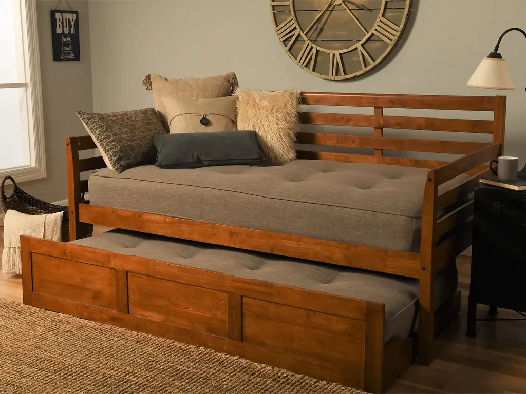 The Boho daybed with trundle gives you options day and night. Made of solid plantation-grown hardwood, this daybed serves as a cozy seating area by day and a sleeping surface by night. A separate trundle under the daybed pulls out for extra sleeping accommodations. Both daybed and trundle mattresses are included. It's a great option for a first apartment, spare room, office, or anywhere—and it complements almost any décor.