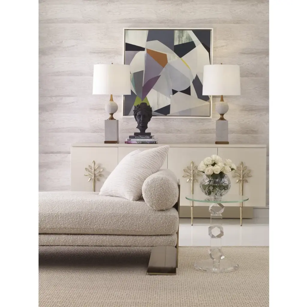 Raised on brass-finished bracket legs, this daybed includes a bench seat cushion, two bolsters, and two throw pillows.