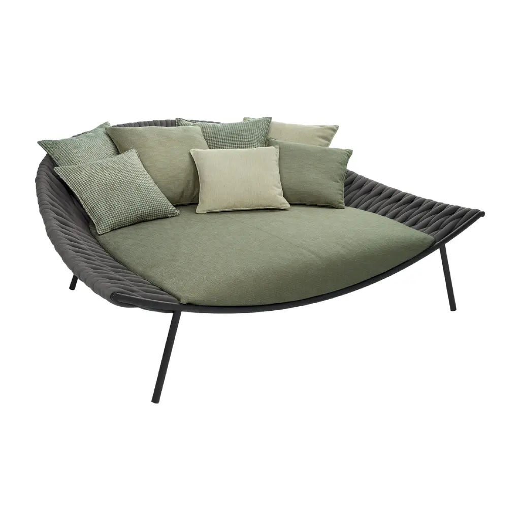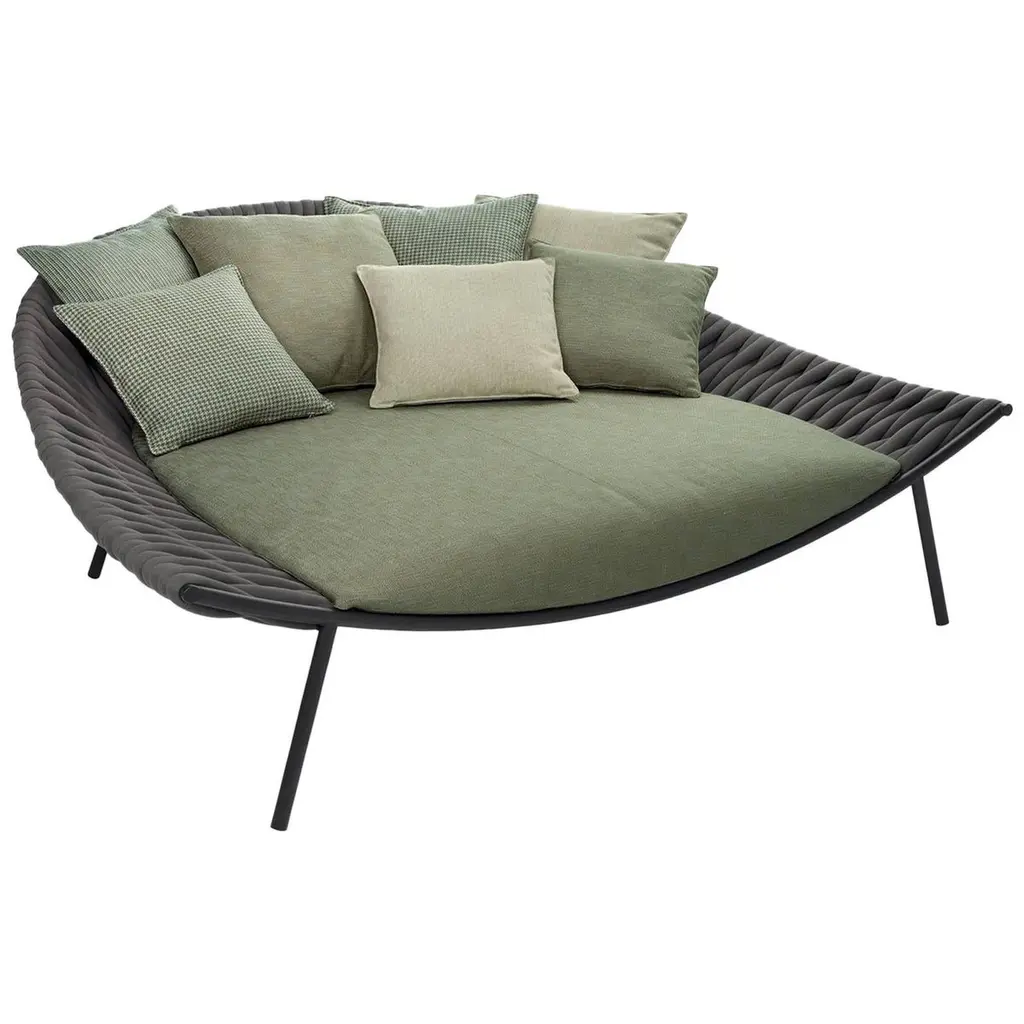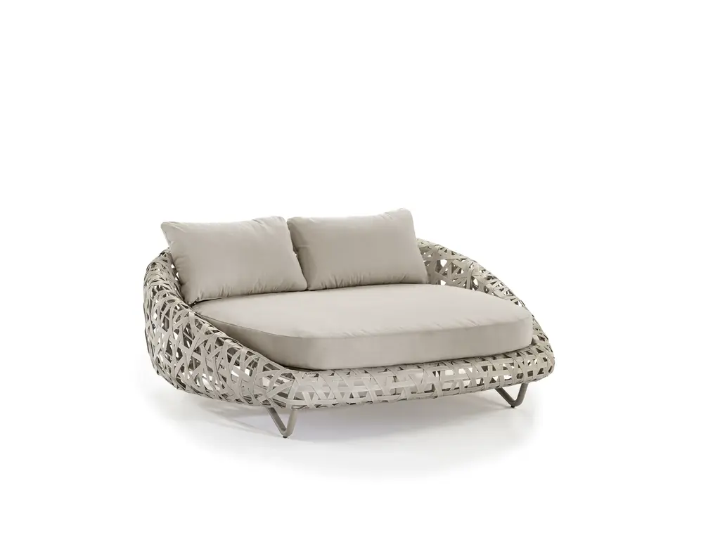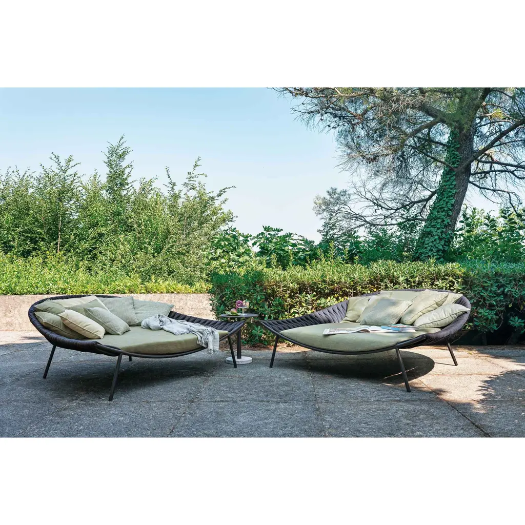 Introducing the ARENA braided outdoor daybed by RODA - a luxurious blend of garden lounger and designer outdoor sofa. Designed by Gordon Guillaumier, this "eye catcher" boasts both stunning visuals and unbeatable comfort. Perfect for relaxing, sunbathing, or reading, it's a unique and versatile addition to any garden or poolside setting.