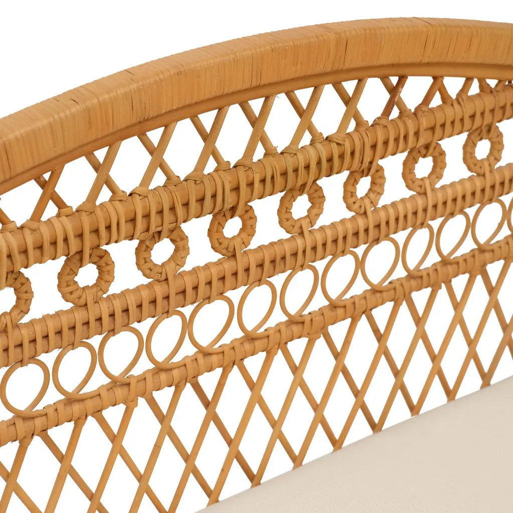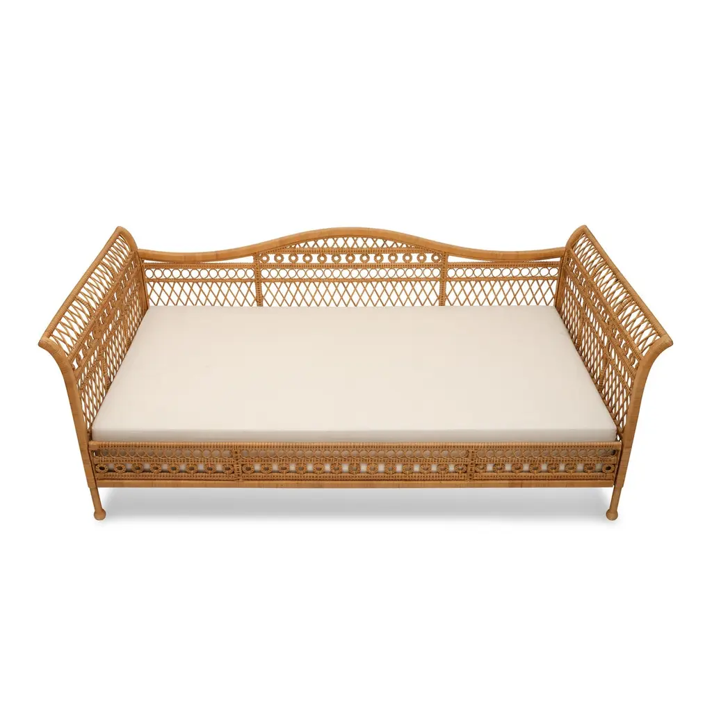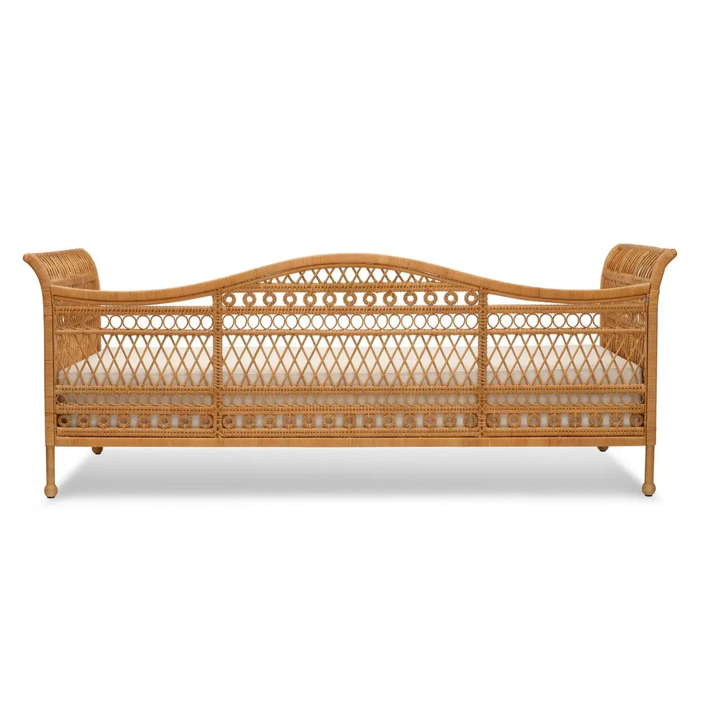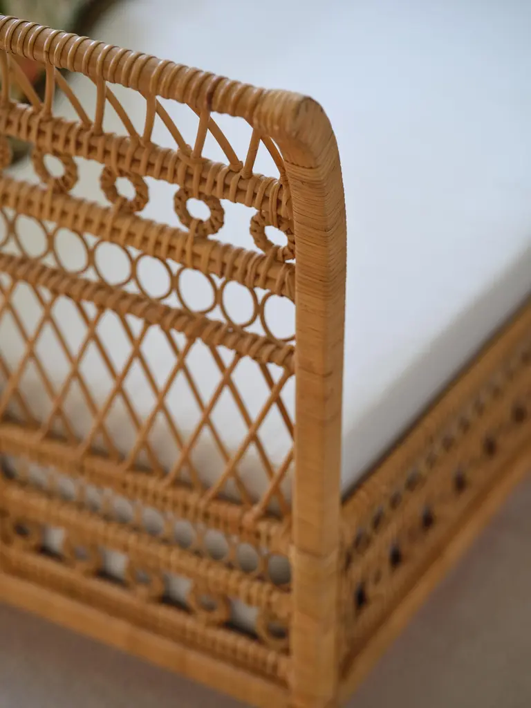 Our new Annabel Daybed is perfectly suited to living rooms and guest rooms alike. Made with the natural fibers of the rattan palm, its graceful, simple frame is complemented by a variety of decorative wickerwork: tight loops run along the aprons, with airier open meanders on the upper levels with circular medallions, too.