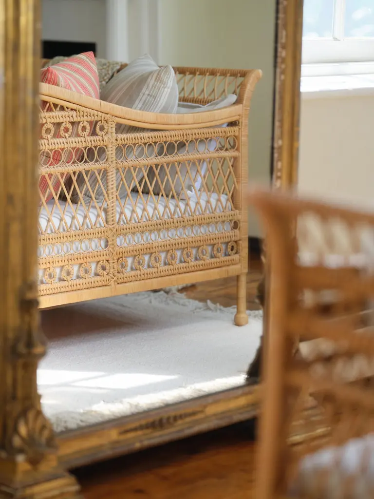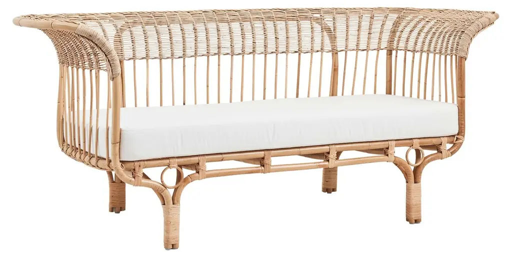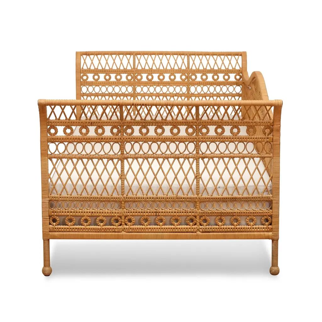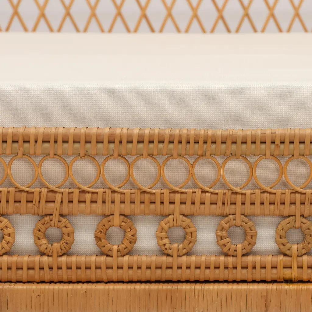 Our new Annabel Daybed is perfectly suited to living rooms and guest rooms alike. Made with the natural fibers of the rattan palm, its graceful, simple frame is complemented by a variety of decorative wickerwork: tight loops run along the aprons, with airier open meanders on the upper levels with circular medallions, too.