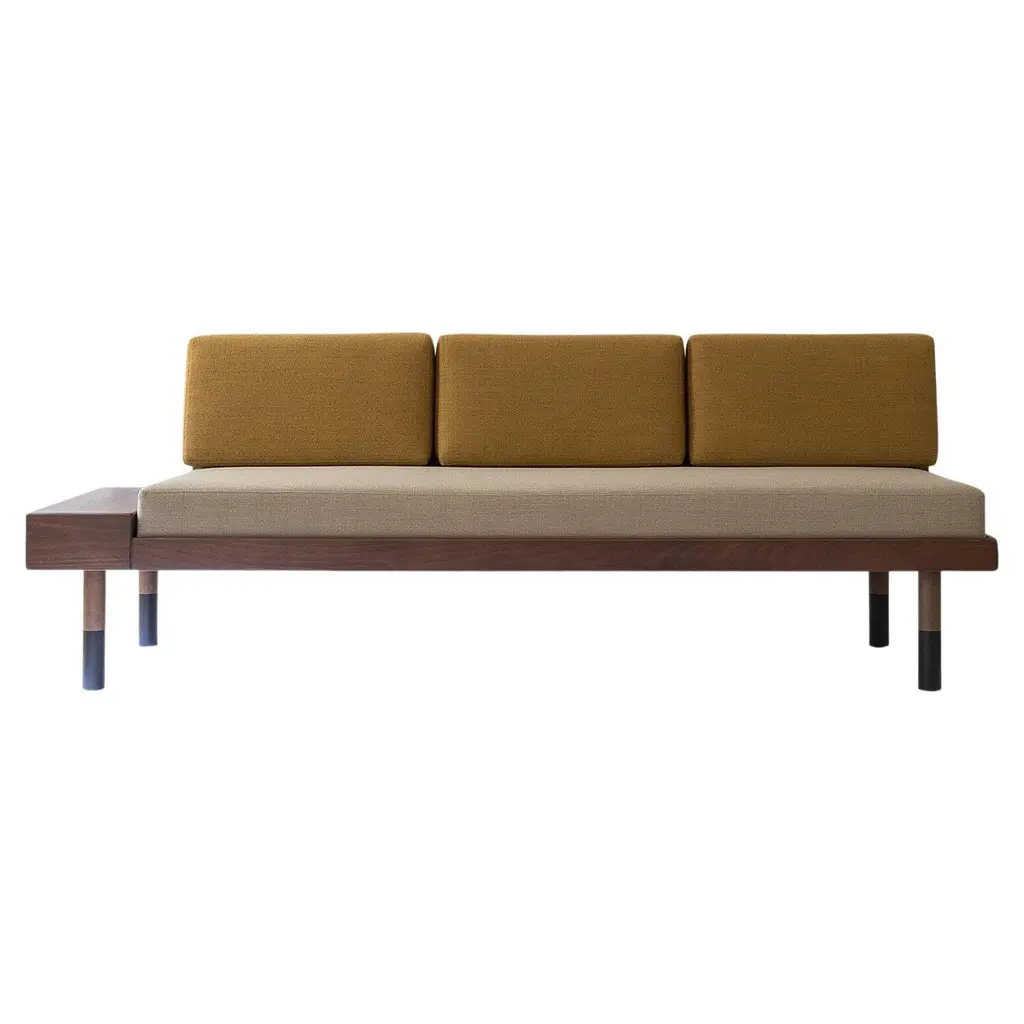 Burgundy mid sofa by kann design dimensions: d 70 x w 200 x h 74 cm. Materials: solid wood, steel, wood veneer, hr foam, fabric upholstery kvadrat sunniva 373 (58% wool, 25% viscose, 8% linen, 5% nylon, 4% polyester). Available in other fabrics. designed by meghedi simonian, the lines of the mid straight sofa are straight and clear. Its particularity is the walnut seat that extends to one of its ends, perfect to set a lamp, a book, or perhaps a vase on\. Highly customizable, the design of the daybed offers a broad choice of woolen fabric.