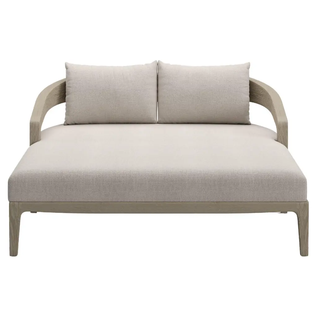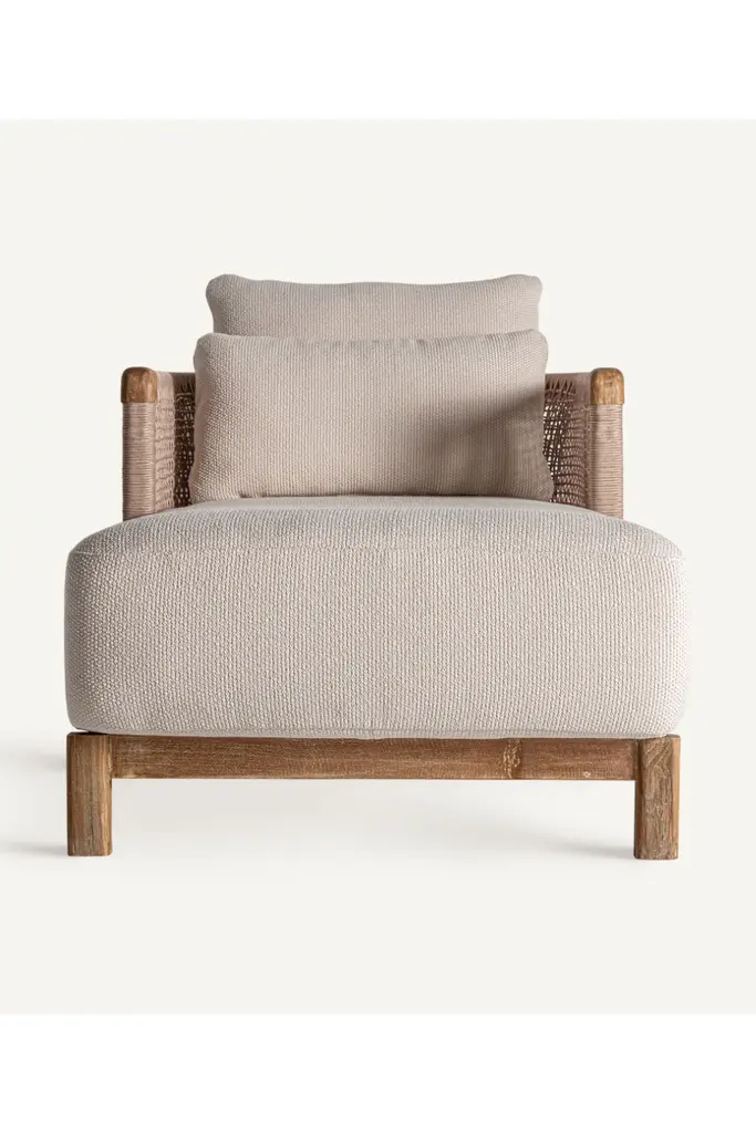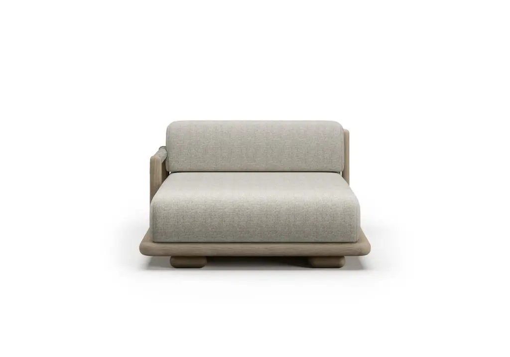 Caleo-Ash Teak Wood, Rope And Ethereal Fabric Left Modular Daybed by SNOCDimensions: D 150 x W 125 x H 65 cm. SH: 42 cm.Materials: Teak wood, rope, and Ethereal fabric. The Caleo Collection embodies understated luxury, blending contemporary form with timeless materials. Designed for both outdoor settings, this modular lounge series prioritizes comfort and adaptability, offering sleek, minimalist lines that define the space while providing unmatched flexibility. Crafted with a refined Ash and Natural Teak wood frame, the collection’s modularity invites creative configurations, allowing each piece to seamlessly adapt to different environments. Upholstered in soft, durable fabrics, the seating offers a tactile warmth that contrasts beautifully with the solid structure, making it a perfect blend of softness and strength.SnocSince their foundation in 2004, SNOC’s history has been interwoven with that of international design. Each chapter written with care, each product reflecting its passion. The company understands that a real story exists behind each object and behind that story, a real person desiring something more. Their ever-developing methodology focuses on defining the core of a brand and utilizing those characteristics to help nurture its soul, aiding in forging real connections. This approach , results in their unique “work in progress” style: original, versatile solutions that in their signature blend of sound, vision and design best-suit every environment and situation, arousing a range of emotions on a daily basis as well as standing the test of time.Driven by functional research, an inclusive project and product culture, and deep care for the environment, we exist as the timeless yet present essence of outdoor furniture design elevating private and public space a like with thoughtfully presented, endlessly adaptive creations.