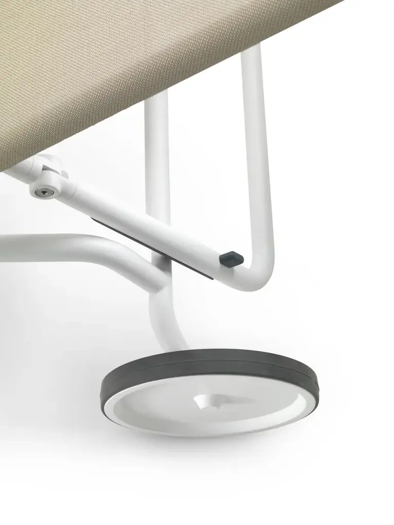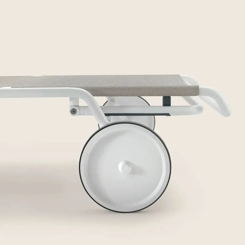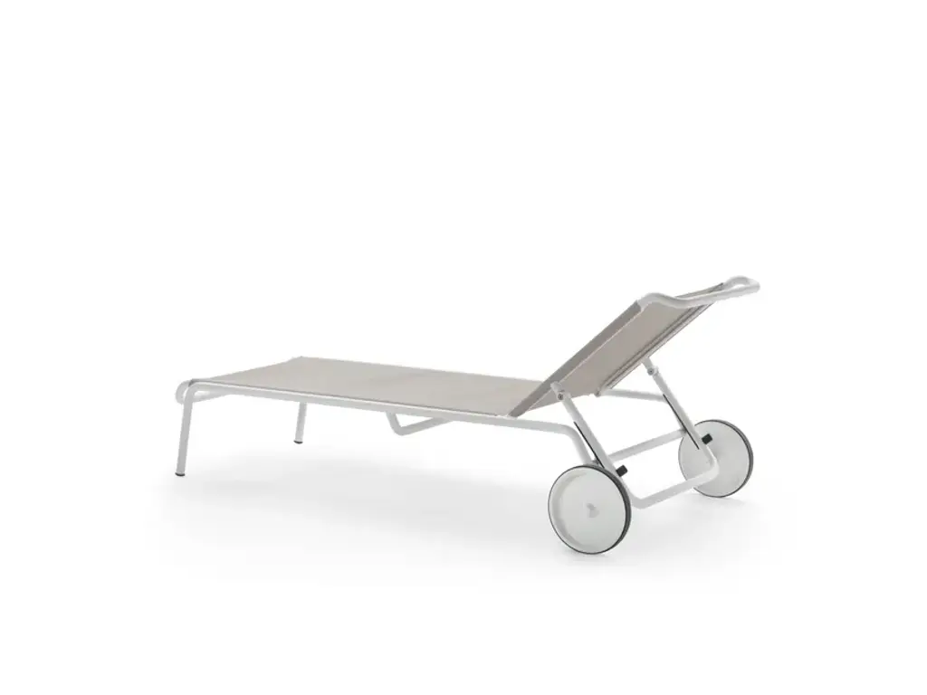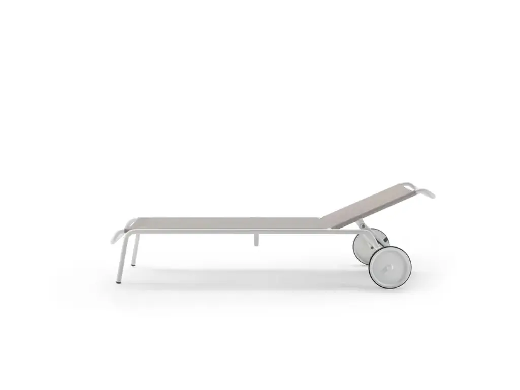 CALIPSO is a sun lounger made of painted metal and Batyline®.FeaturesStructure: Made of tubular stainless steel, oven-painted with epoxy powders in textured colors: white 300, sand 310, sage green 330, terracotta 325. The backrest adjustment system features a rack made of stamped thermoplastic material.Mesh: Made of Batyline® fabric, Category A in colors: chalk 9607, walnut 9615, bark 9685; Category B in colors: caramel 9520, ivy 9550.Feet: Supported on ground with thermoplastic material tips.Wheels: 26 cm diameter, made of die-cast aluminum, oven-painted with epoxy powders in the same color as the structure. They feature a gray thermoplastic material profile.The Calipso loungers are inspired by the principles of "good design," characterized by a clean and essential design, intentionally simple.The sinuous structure is made of epoxy powder-coated metal, while the seat and backrest are made from a mesh of synthetic fibers, ensuring durability over time and resistance to weather conditions.The lounger features a functional mechanism that allows the backrest to be reclined. There is also a version with rear wheels made of die-cast aluminum, which allows for easy movement.These loungers are ideally placed by the poolside and are perfect for decorating terraces and gardens with a touch of understated elegance.The Calipso Cord version is characterized by an interesting contrast between the simplicity of the epoxy powder-coated metal structure and the sophistication of the hand-woven polypropylene cord seat and backrest, both available in a variety of refined colors.This lounger also features a functional mechanism to recline the backrest, and there is a variant with rear wheels made of die-cast aluminum for easy movement.They are ideally suited for poolside placement and are perfect for furnishing terraces and gardens with a refined elegance.