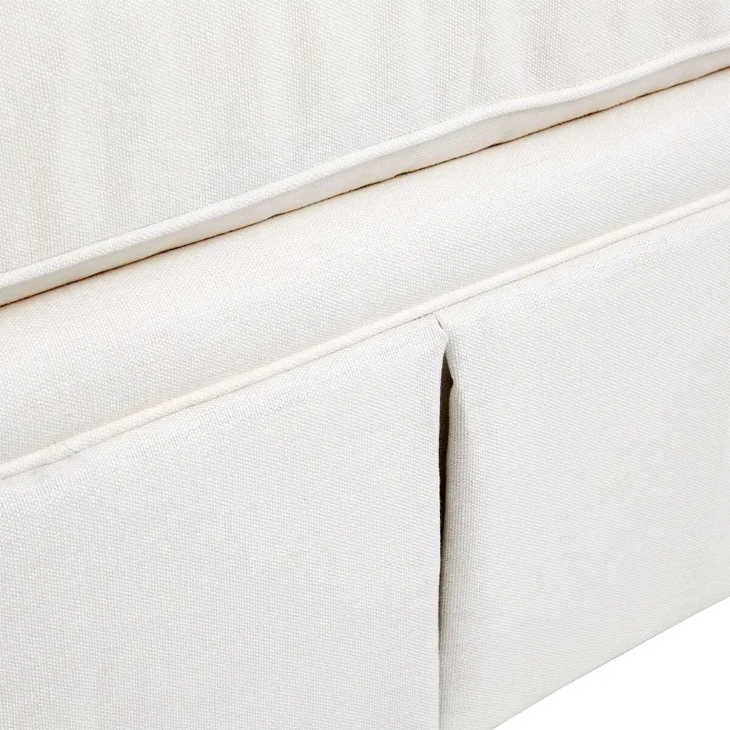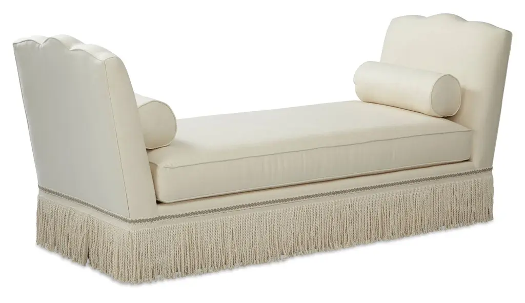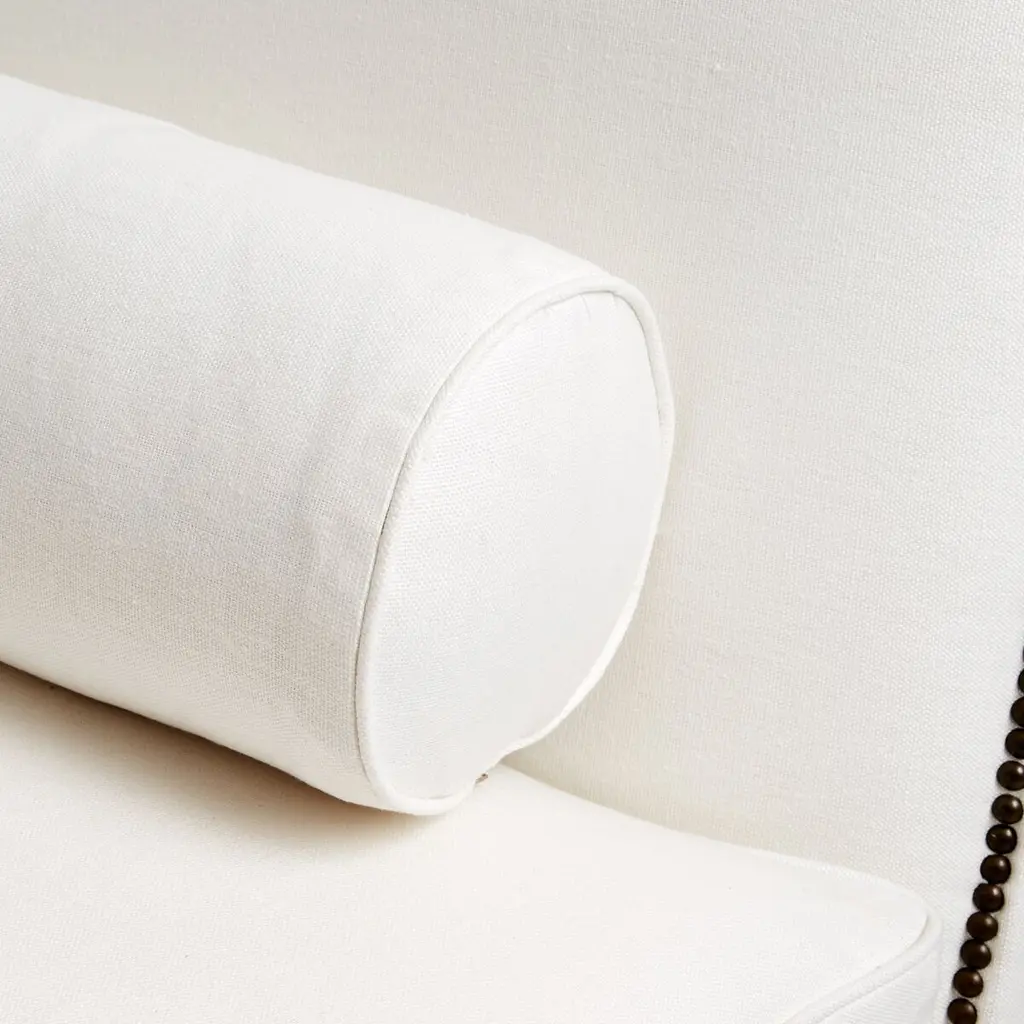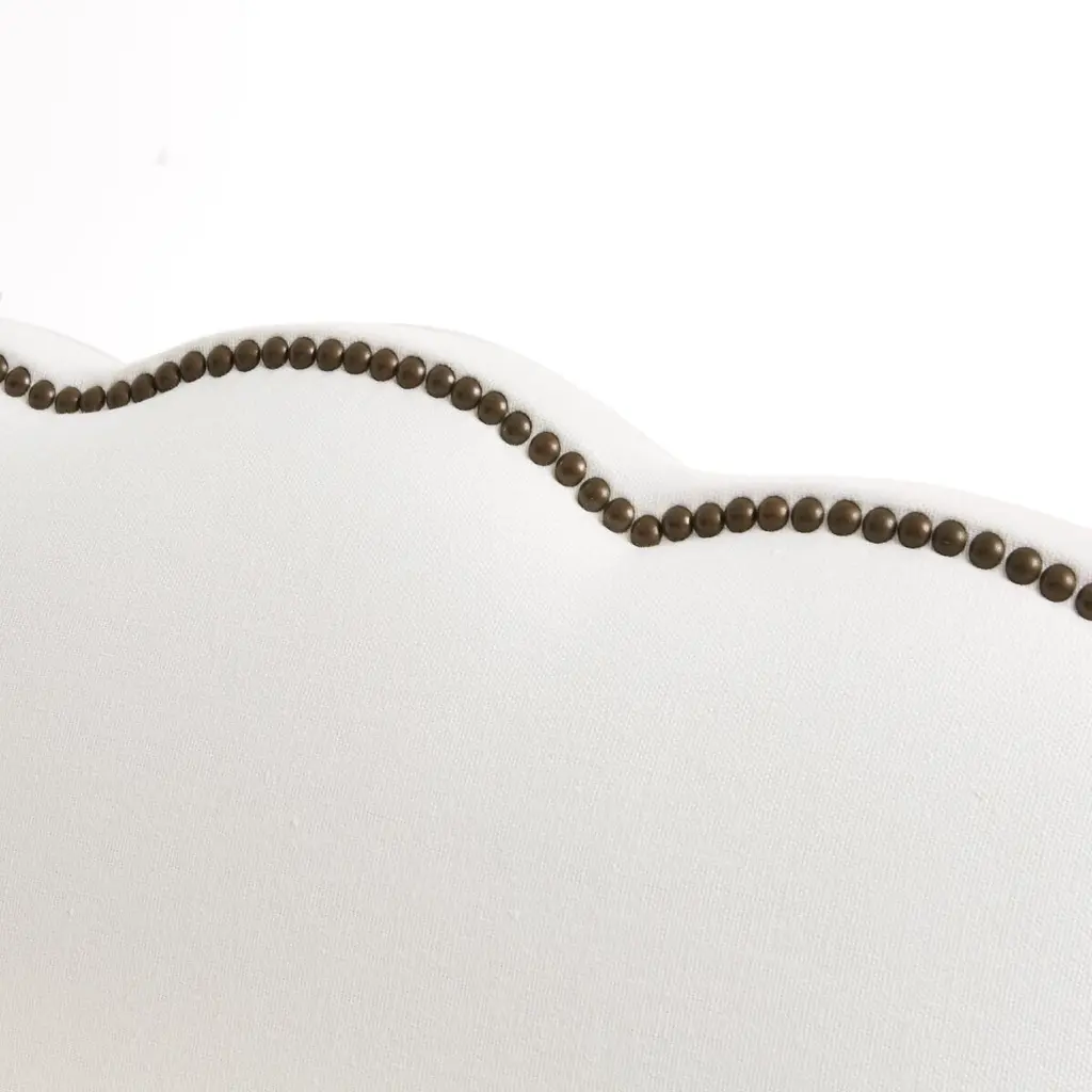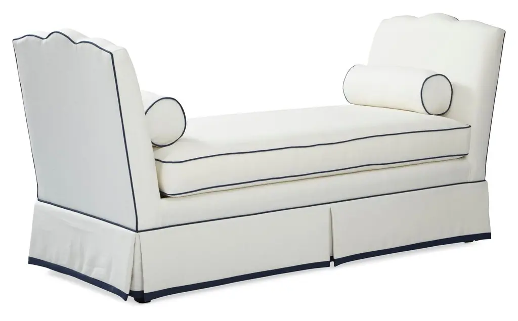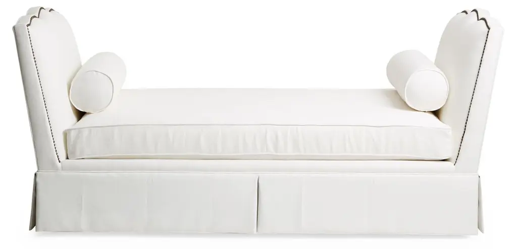 Designed by us and available only at One Kings Lane: This skirted daybed is upholstered in snowy-white linen and generously filled with down-wrapped foam for lasting comfort and support. A carefully applied nailhead trim adds detail and contrast while drawing attention to the lines of its contoured sides. Two matching bolster cushions provide additional comfort, while scalloped arms and a wrap-around skirt finish the look in style. Made in the USA.