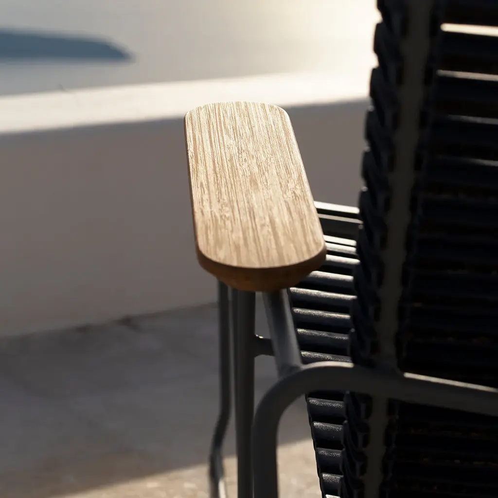 The HOUE Click Outdoor Sunlounger, designed by Henrik Pedersen, masterfully combines Scandinavian aesthetics with innovative materials to create a versatile lounger that's both visually striking and remarkably practical. This contemporary piece reimagines outdoor relaxation through thoughtful engineering and sustainable material choices. The lounger's distinctive profile emerges from its ergonomically curved backrest, which offers multiple adjustment positions to accommodate various lounging preferences. The frame, crafted from powder-coated gray steel, provides a robust foundation while maintaining a sleek, architectural presence. The seating surface combines durability with comfort through precisely spaced plastic lamellas, engineered to withstand outdoor conditions while allowing for optimal airflow and water drainage. Adding a natural touch to the modern design, bamboo armrests provide both tactile warmth and environmental consciousness. This sustainable material choice not only enhances the lounger's aesthetic appeal but also offers comfortable support that won't overheat in direct sunlight. The combination of materials results in a chair that's both weather-resistant and environmentally mindful. Perfect for pool areas, garden spaces, or contemporary patios, the Click Sunlounger demonstrates HOUE's commitment to creating outdoor furniture that balances form, function, and sustainability. Its sculptural presence makes it an attractive addition to any outdoor setting, while its durable construction ensures it will maintain its appeal through multiple seasons of use. Assembly required.