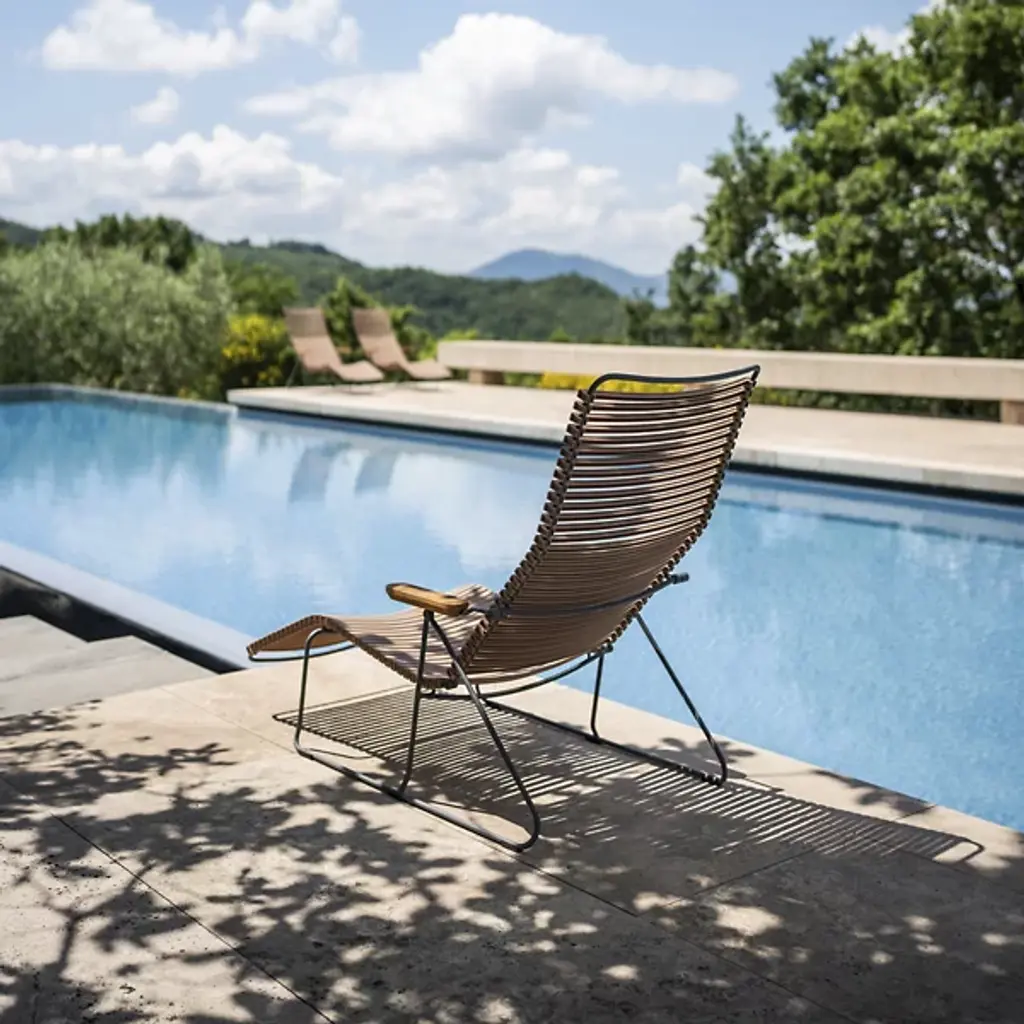 The Click Sunlounger from Houe epitomizes comfort and sculptural elegance. Its adjustable backrest is artfully shaped to cradle your body in every position, inviting you to sit down, find your perfect spot, and relish the moment. The meticulously crafted lamellas offer exceptional cushion-free comfort, and their click-on-and-off feature allows easy customization of the chair's look by changing or mixing different lamella colors. The Click Sunlounger promises a colorful, relaxing escape.