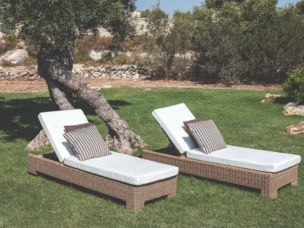 Comforting balance and soft lines remake the house into a cozy home. Cloe collection is rich in components for outdoor spaces, from living areas to dining spaces and pool-side ones. Single, and double sun loungers and shell daybeds recall a real inviting love nest. The collection shines for its powder-coated aluminum frame and the natural round cross-section fiber which make the braid produce the characteristic woodcarving effect both in the look and in the slightly irregular touch.