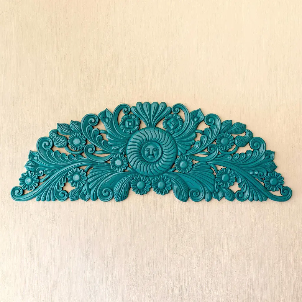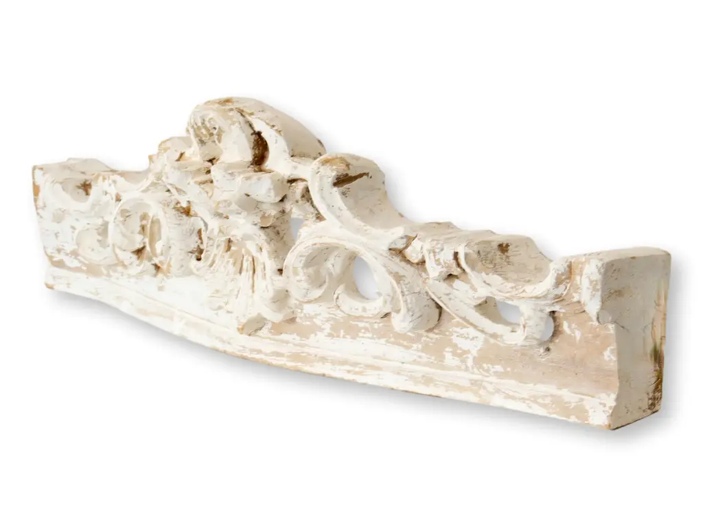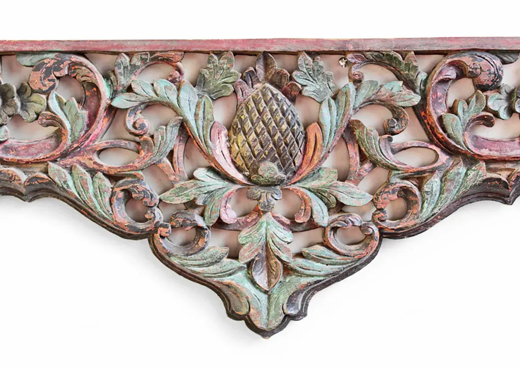 Consigned original vintage Javanese carved architectural panel. Traditional decorative floral carvings with beautiful aged red and green painted patina. This type of piece was originally built into doorways, daybeds, or other architectural features.Condition: Great, with signs of age and useOrigin: IndonesiaEra: Mid 1900''s