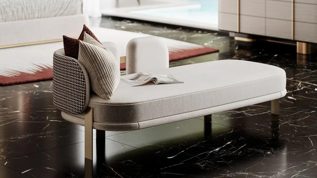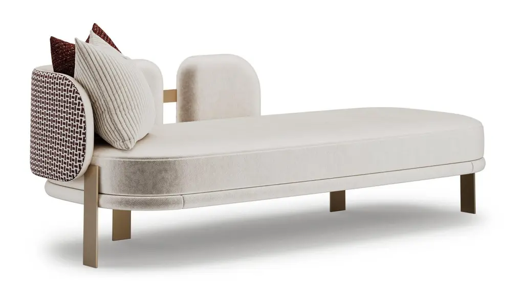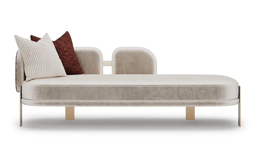 Lunara Daybed is an invitation to linger, marrying sculptural poise with cloud‑like comfort. Its elongated, low‑profile silhouette appears to glide above the floor on slender, hand‑polished brass legs that catch the light like jewelry—an elegant contrast to the daybed’s softly textured, light‑hued upholstery. Crafted to command attention while remaining effortlessly refined, Lunara’s generous single‑cushion seat is perfectly proportioned for resting, reading, or conversational lounging. Subtle top‑stitch detailing traces clean, architectural lines, underscoring the piece’s contemporary character without disrupting its tranquil aesthetic.
