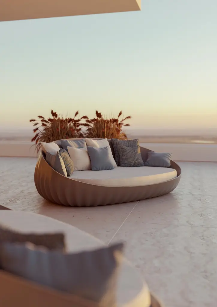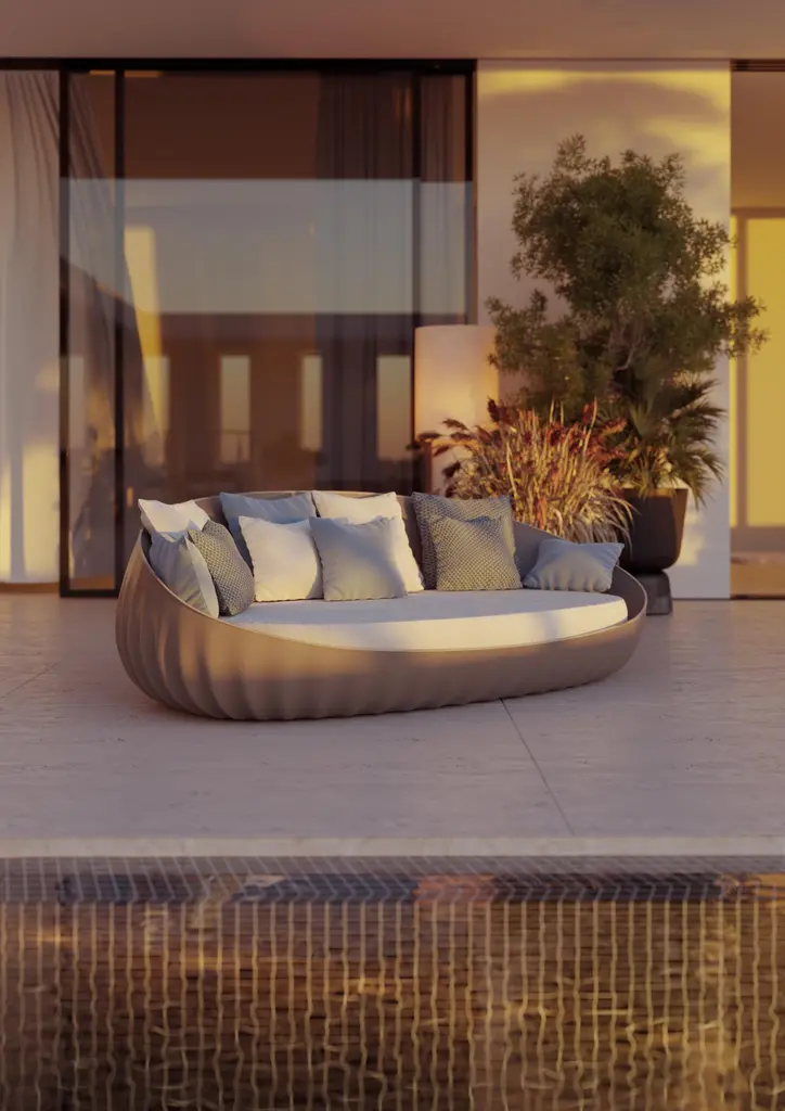Pearl - Outdoor sofaThe Pearl Sofa combines a fiberglass structure with a distinctive shell-shaped design and high-performance outdoor cushions, ensuring exceptional comfort and support. Perfect for lounge areas or poolside settings, it is the ideal centerpiece that blends design and comfort with outstanding performance in any outdoor environment.Luxurious outdoor sofa made with structure: White matte fiberglass structure shell, Upholstery: Acrylic fabricWith its distinctive design, its weather-resistant pillows, and outdoor upholstery, the Pearl Sofa adds both comfort and luxury to every terrace or patio set, taking your relaxing outdoor moments to a whole other level.