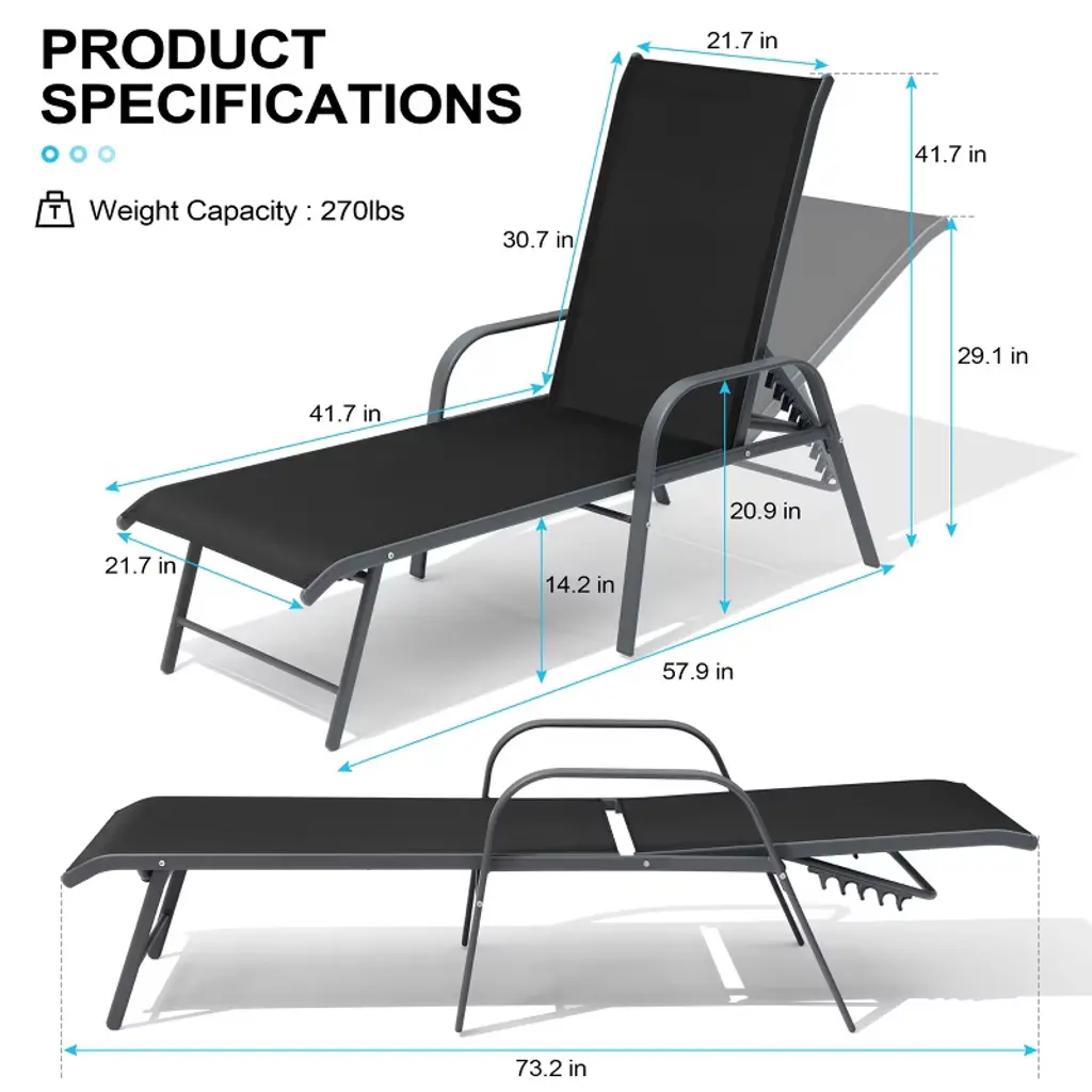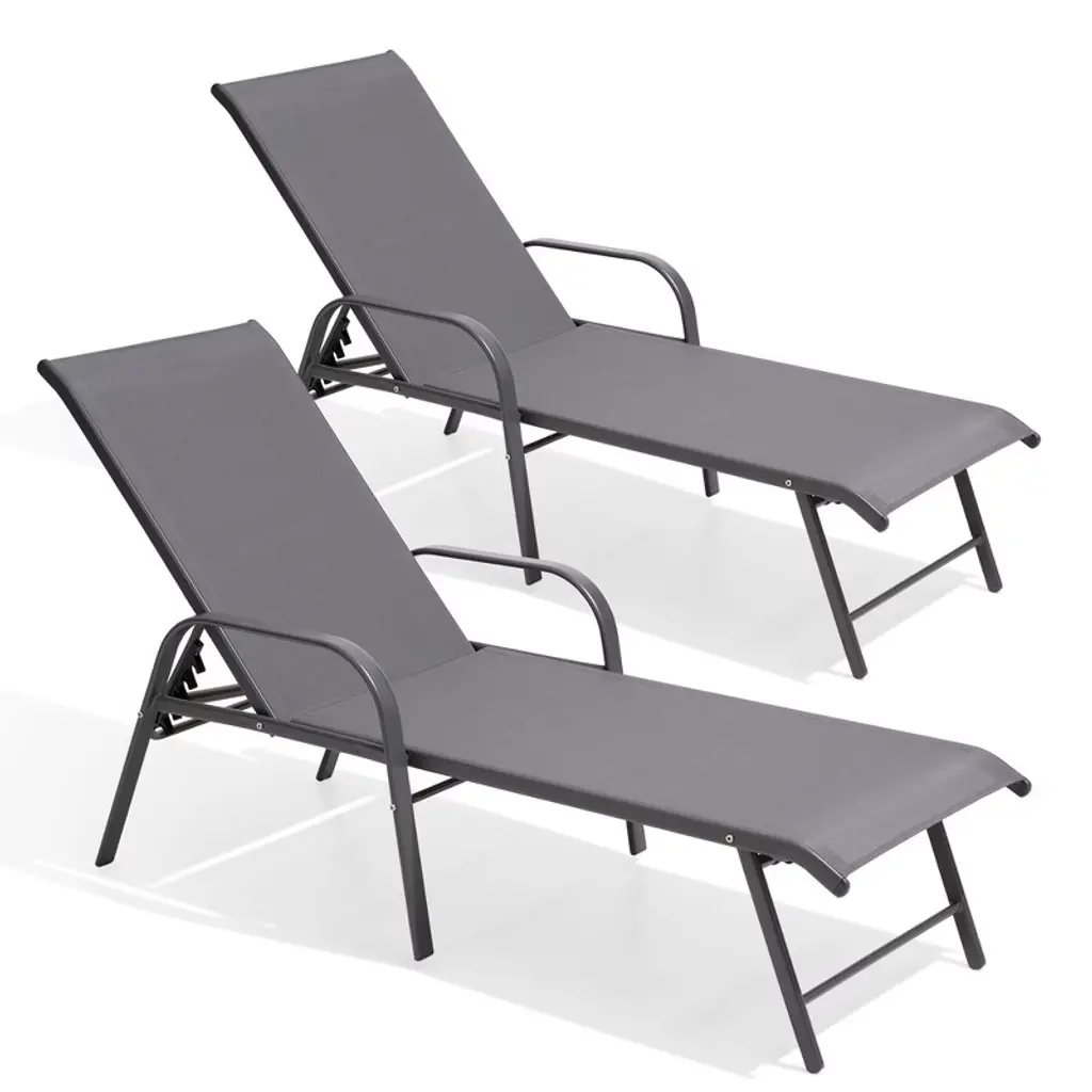 Relax in your patio or poolside space with this Set of Two Modern Exquisite Patio Chaise Lounges by Crestlive Products.The metal frames are durable yet lightweight, and the textilene sling is breathable. Multiple colors to suit your lounging needs.Features: Includes 2 (two) pcs lounge chairs Made of metal frame with powder coated, sturdy, rustproof and lightweight Main frame is aluminum, few frames are made of steel for increased strength Made of UV-resistant breathable Textilene sling Ergonomic sling seat supplies maximum comfort With adjustable back (5 positions and lay flat) The curved armrests for getting up easily Exquisite design Use for indoors and outdoors Comfortable sunbathing lounge chair Easy to assemble Multiple color options Dimensions: Overall length after flattening: 73.2 iches The height of the backrest when tilting: 29.1 - 41.7 inches Seat size: 41.7" D x 21.7" W Backrest size: 30.7" L x 21.7" W Seat height: 14.2" H Armrest height: 20.9" H Weight Capacity: 270 lbs Warm Tips: The middle leg, which is suspended, is normal and has been designed for better balance. Once you sit on it, the middle leg touches the ground, so please don't have to worry. Upgraded Patio Lounge Chair- Say Goodbye to Rust and Bulkiness, Enjoy a Comfortable Experience!