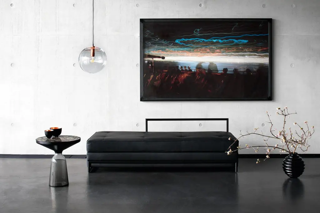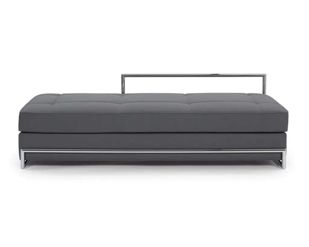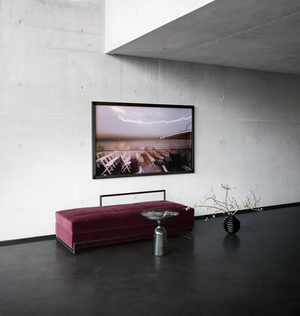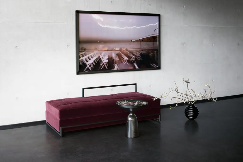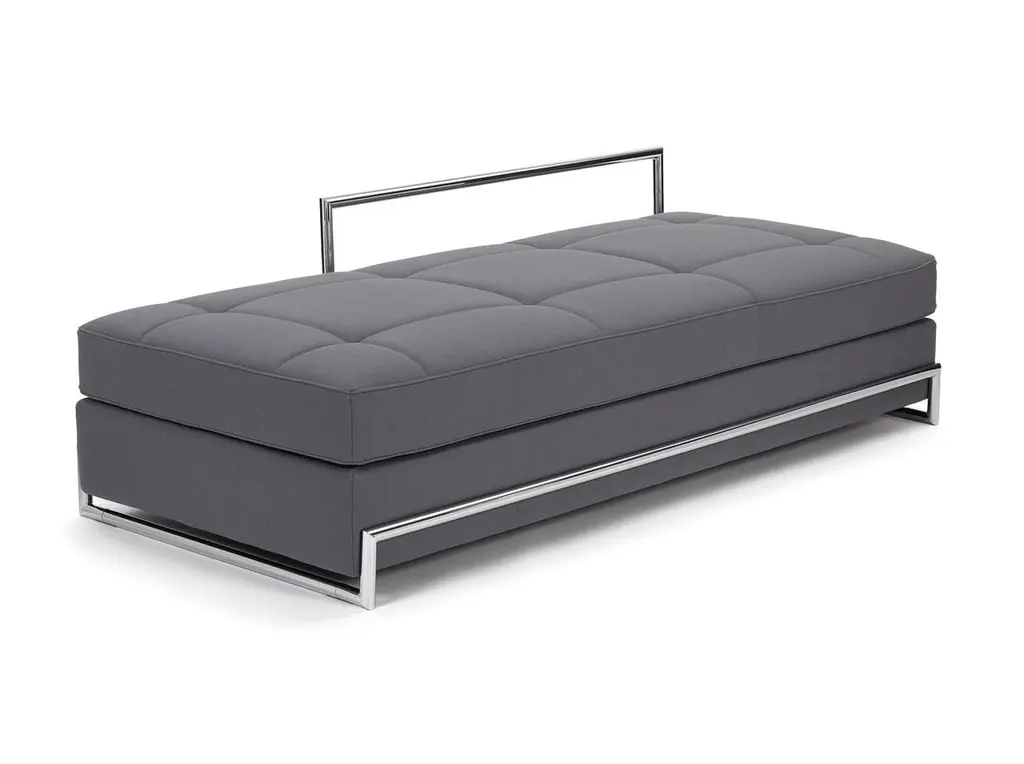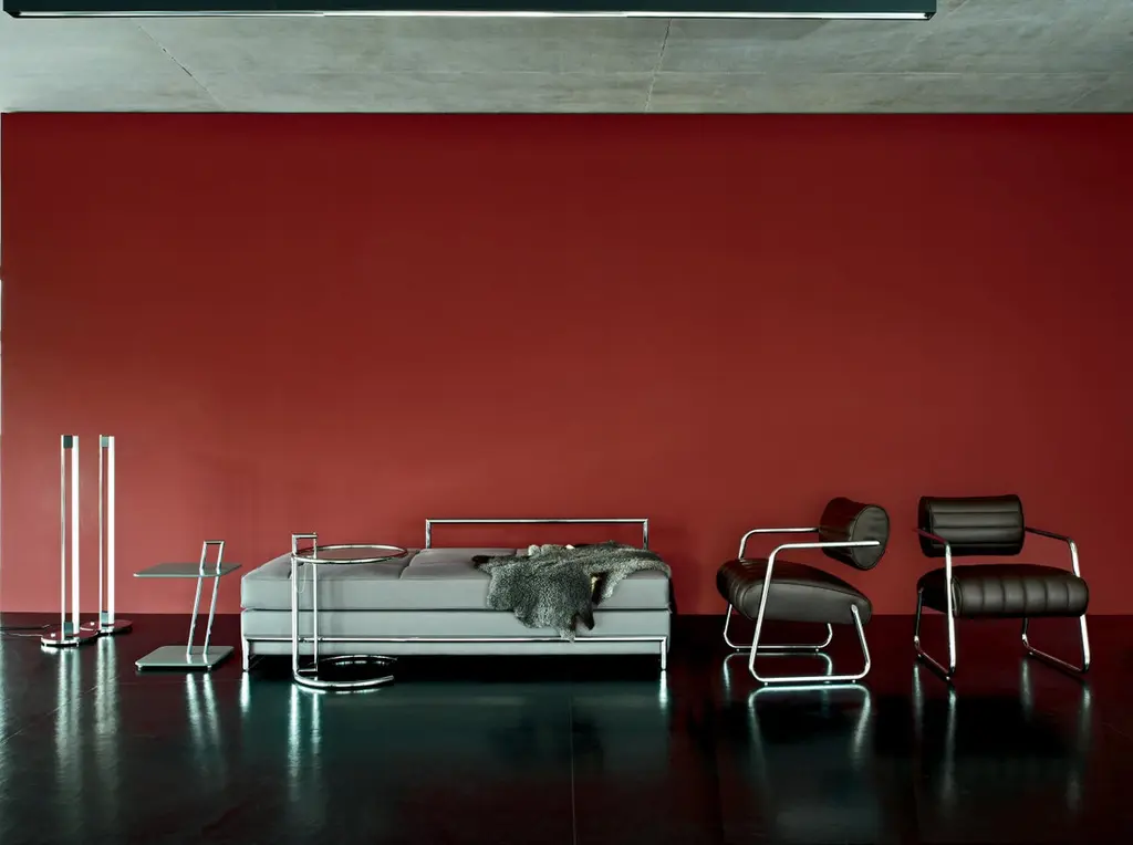 The daybed is rightly counted among Eileen Gray’s most famous designs. The lounge "offers pleasant and comfortable seating and is, moreover, particularly suited to relaxing". What she in her own modesty conceals is the fact that the daybed is enchantingly beautiful, accessible from all sides and a pleasing sight from every perspective. It is the ideal showpiece to be placed freely in a spacious room.Frame tubular steel, chrome plated. Beech frame with rubber webbing. Loose mattress. Upholstery polyurethane with polyester fiber. Cover in fabric or leather. Plastic gliders in black. Dimensions: W 200 cm, D 90 cm.