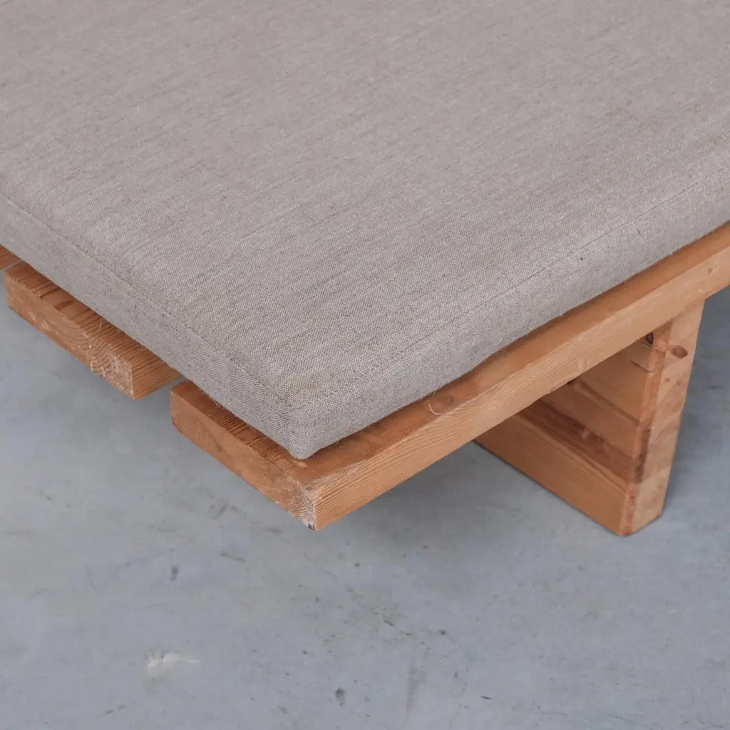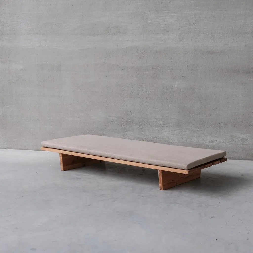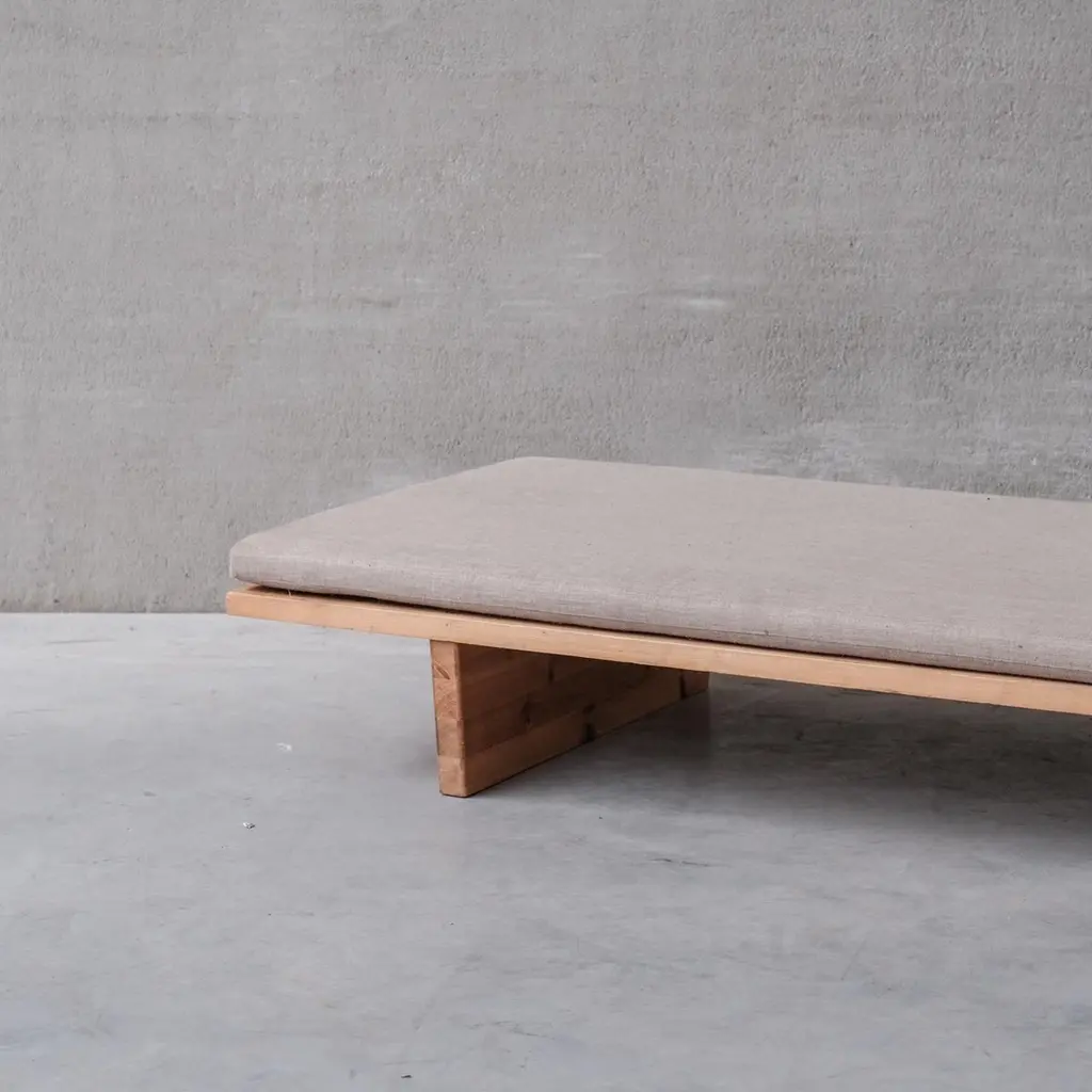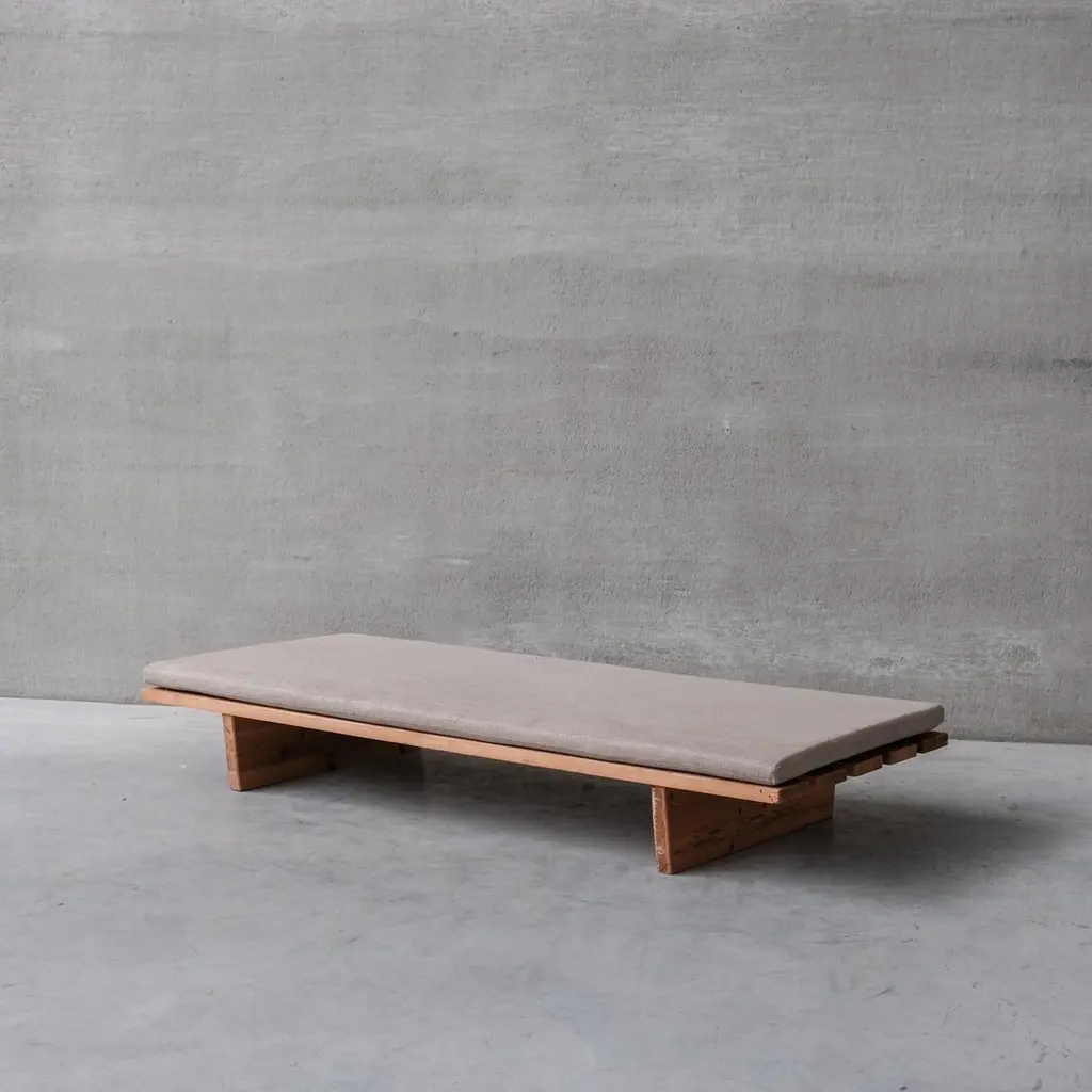Low slatted pine day beds, two available, sold individually. Denmark, circa 1970s. Pine construction with thin mattress in a neutral grey fabric. Original condition, good condition generally, some wear and patina commensurate with age. Priced and sold individually.Location: Belgium Gallery. Dimensions: 25 H x 58 D x 200 W in cm. Delivery: POAWe can ship around the world. Can be transferred to our London or Belgium Gallery.