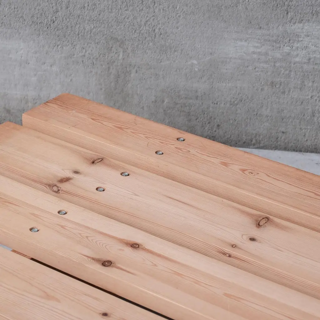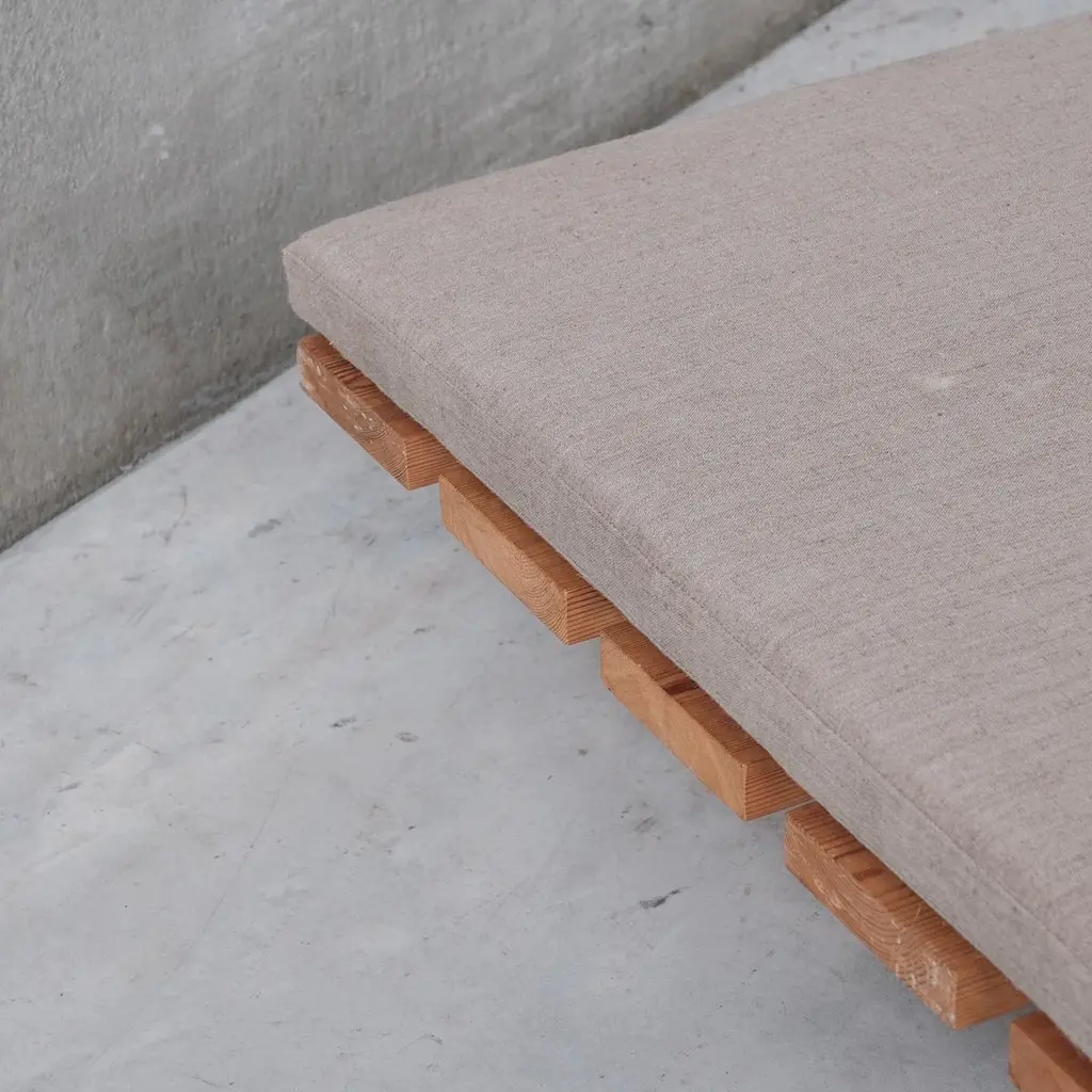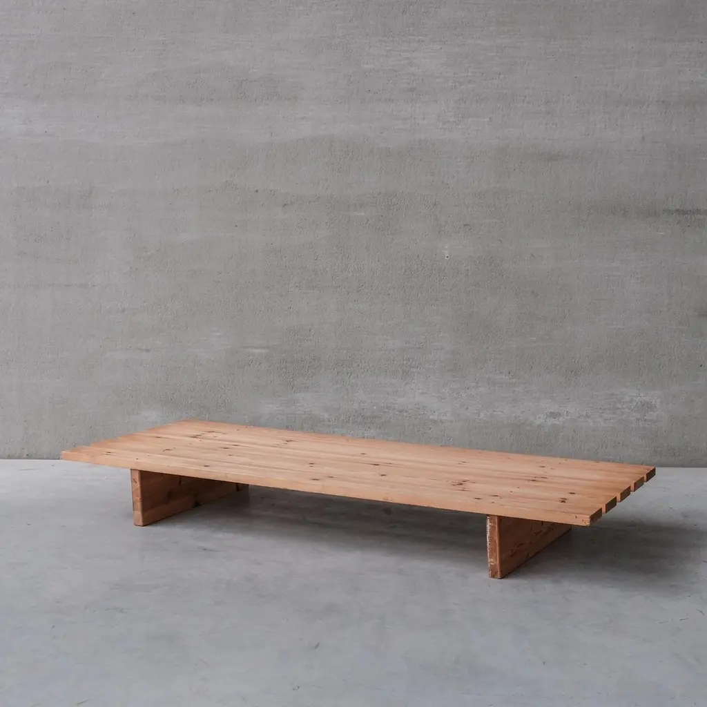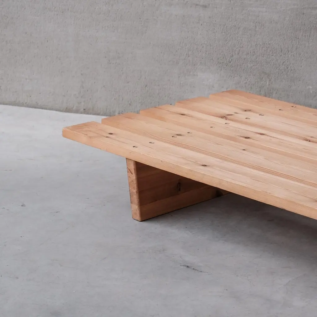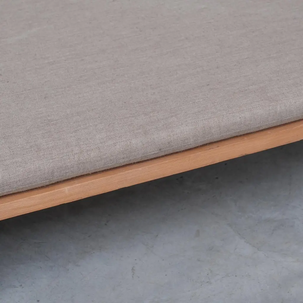 Low slatted pine day beds, two available, sold individually. Denmark, circa 1970s. Pine construction with thin mattress in a neutral grey fabric. Original condition, good condition generally, some wear and patina commensurate with age. Priced and sold individually.Location: Belgium Gallery. Dimensions: 25 H x 58 D x 200 W in cm. Delivery: POAWe can ship around the world. Can be transferred to our London or Belgium Gallery.