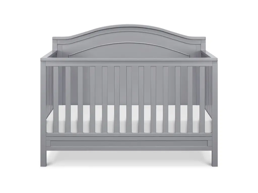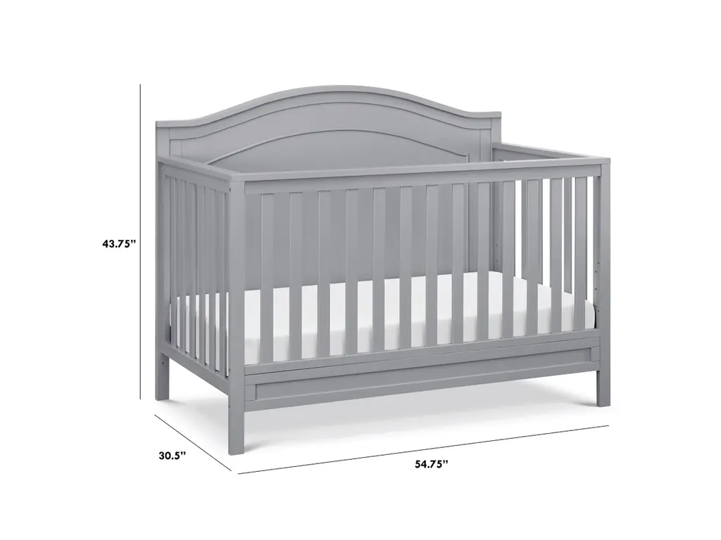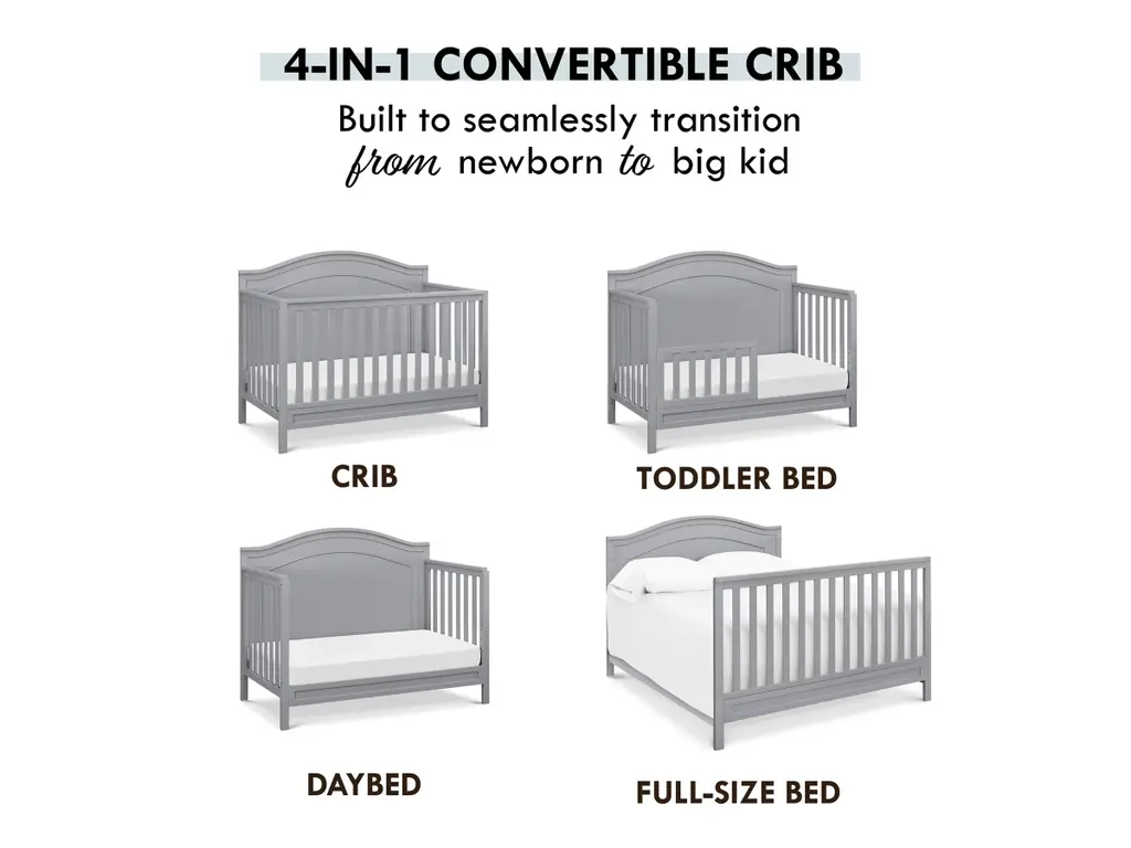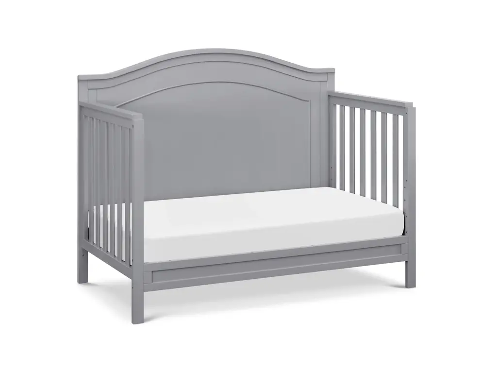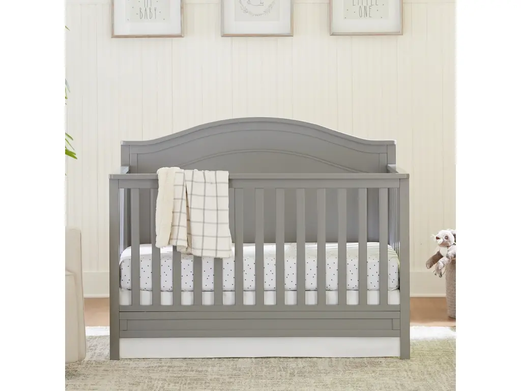 The polished Charlie 4-in-1 Crib features a graceful arched headboard with delicately carved molding and slim feet. The crib easily converts from crib to toddler bed, daybed and full-size bed.