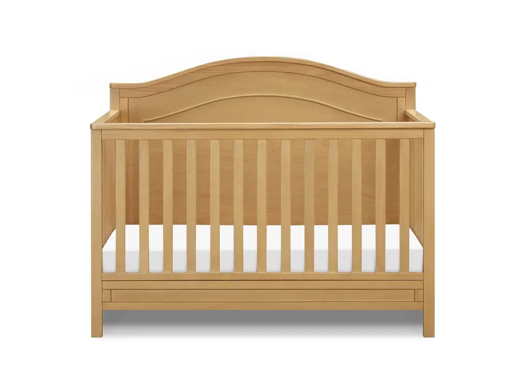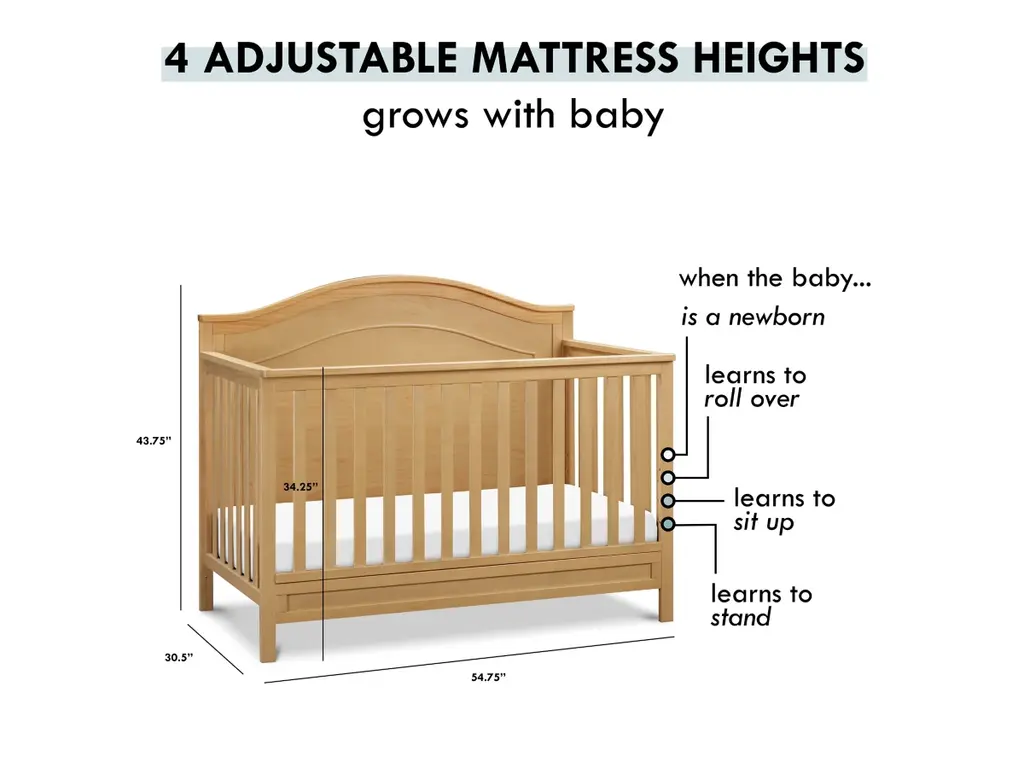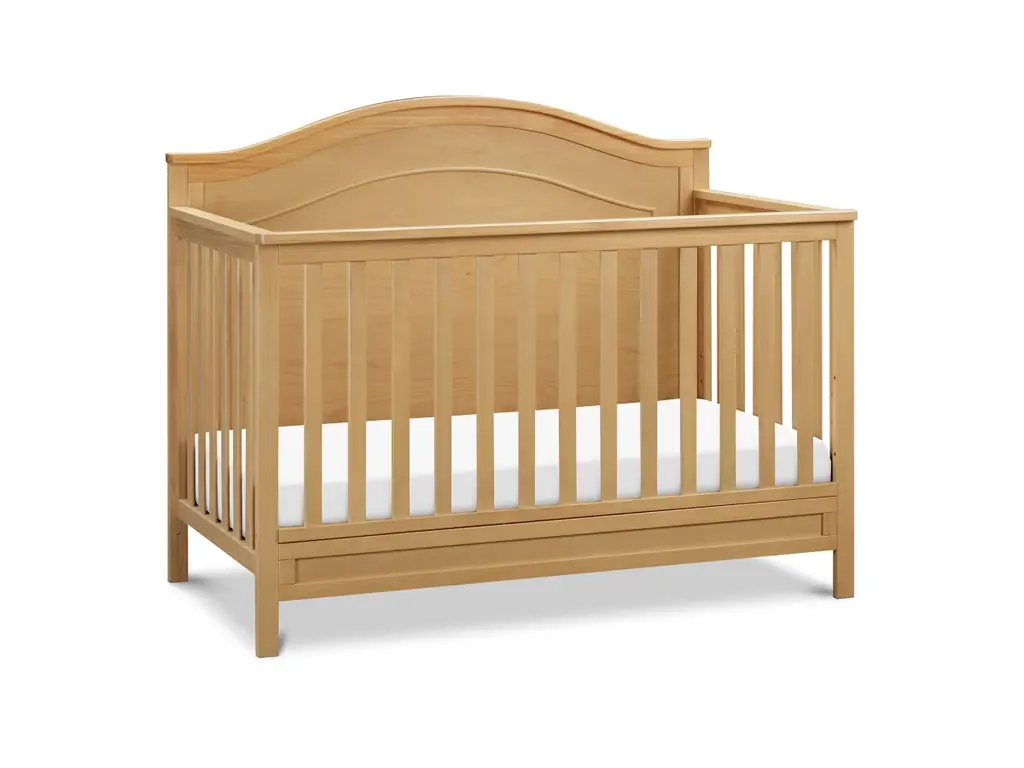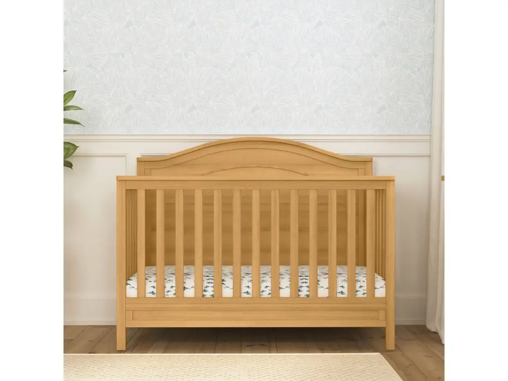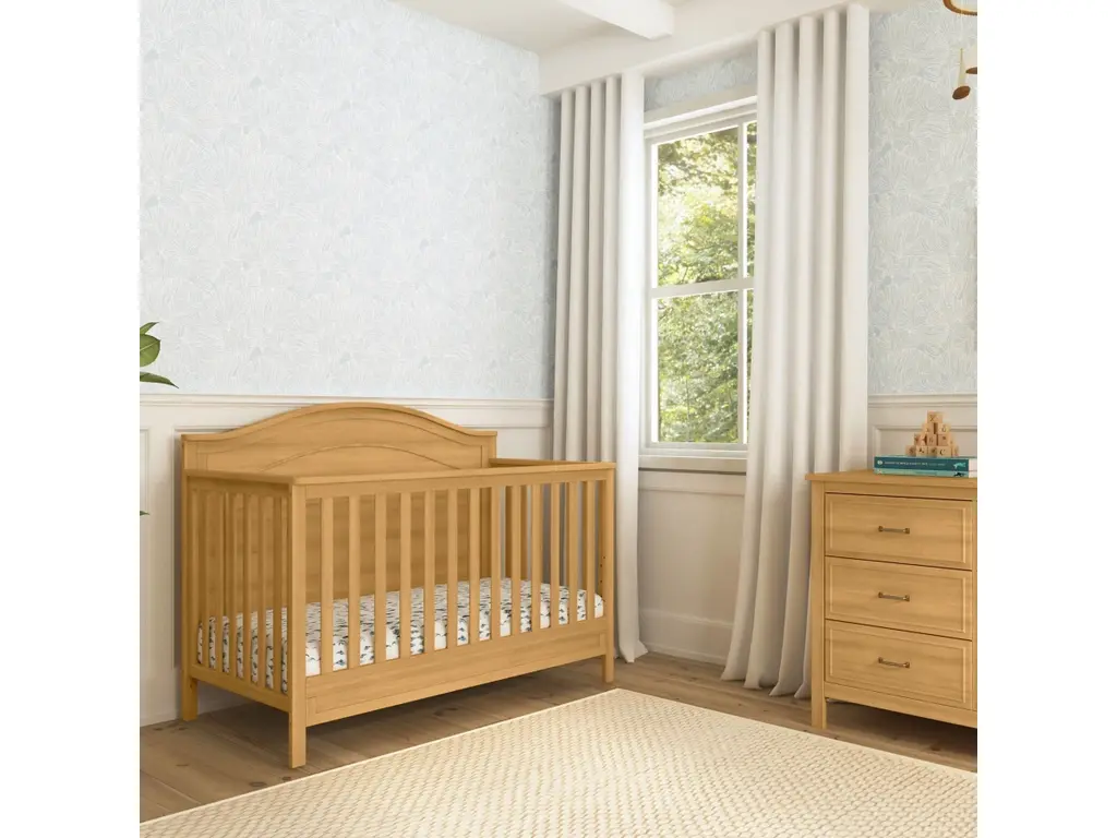 The polished Charlie four-in-one crib features a graceful arched headboard with delicately carved molding and slim feet. The crib easily converts from crib to toddler bed, daybed and full-size bed.