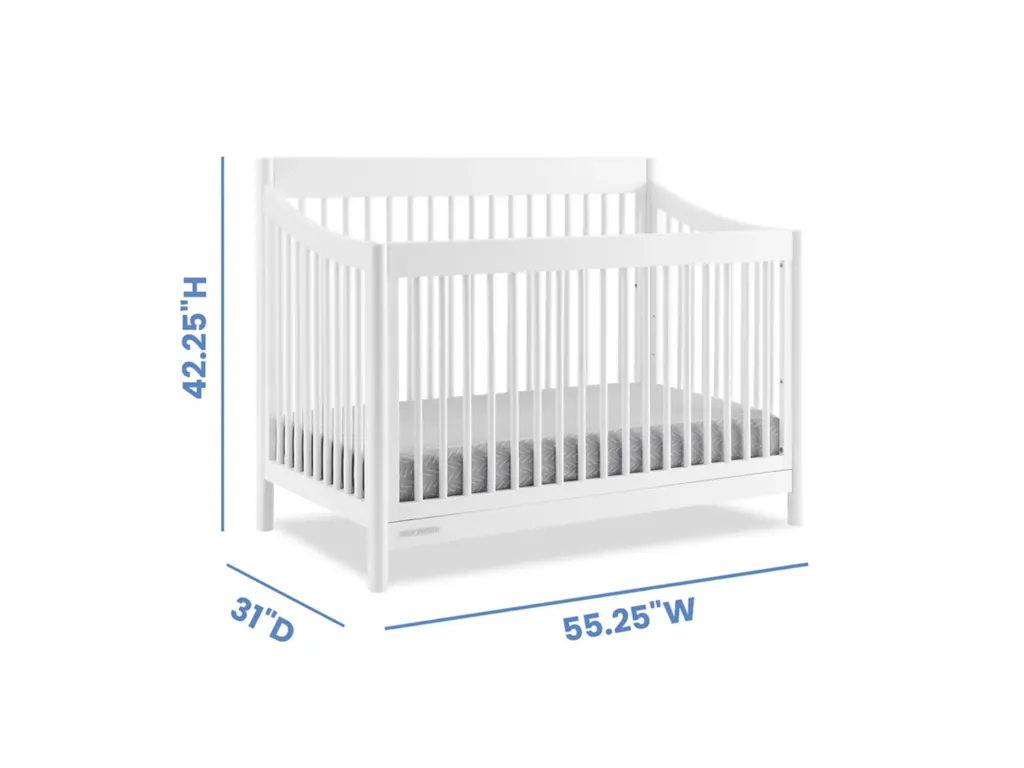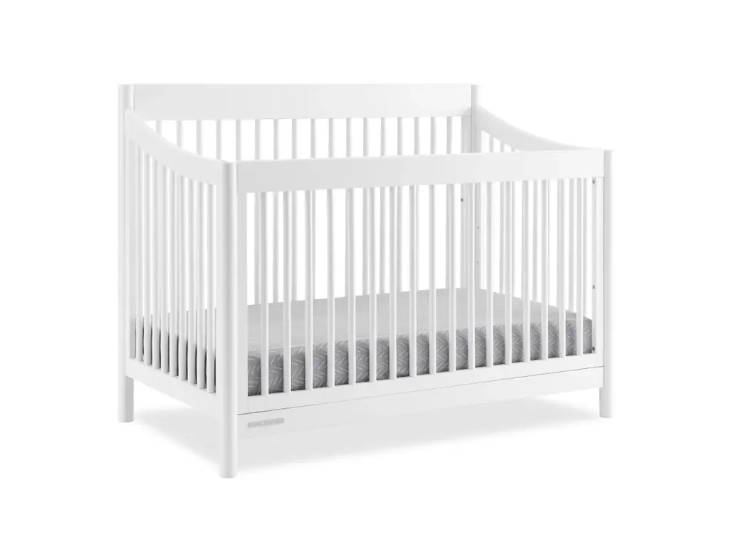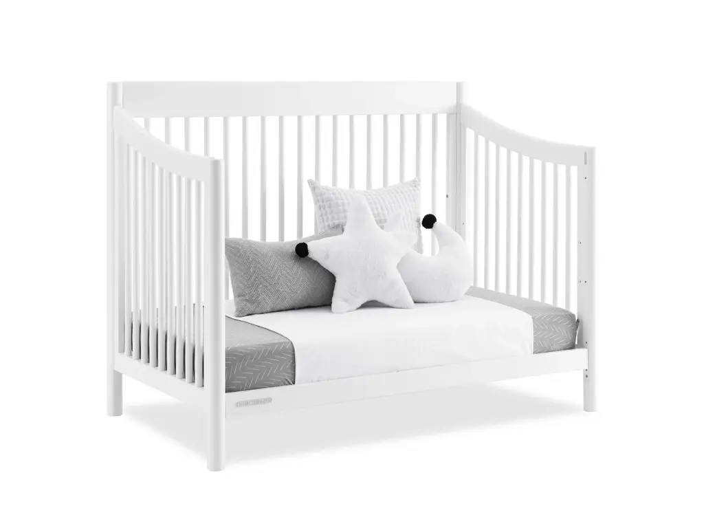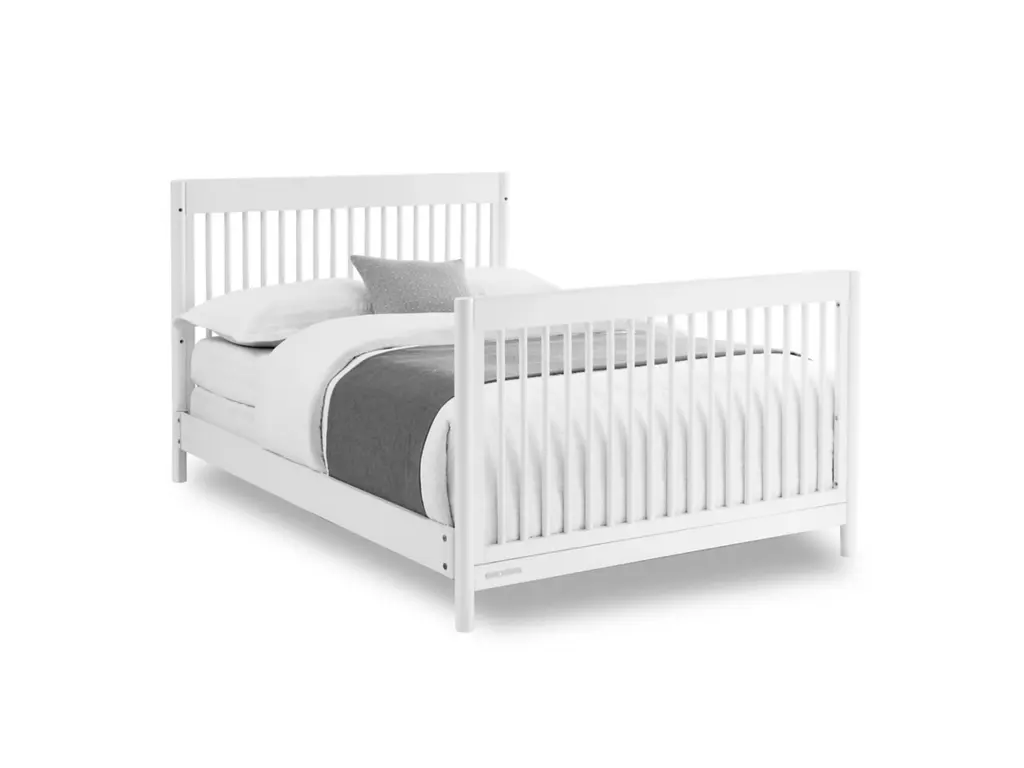 The mid-century design of the Brooks 6-in-1 Convertible Crib by Delta Children will anchor any nursery with welcoming and timeless style. Modern spindles on all four sides, swooping angles and circular posts complete the look of this must-have crib. Tailored to cater to your growing baby needs, this adaptable crib features an adjustable mattress support that can be lowered as your little one begins to sit or stand. And, when your child is ready, this crib can convert into a cozy toddler bed, daybed, sofa and a full size bed with or without a footboard (conversion rails sold separately). Plus, it's GREENGUARD Gold Certified, which means it built to contribute to cleaner air for a healthy home. Available in Bianca White and Midnight Grey. Finish your nursery with coordinating pieces from the Brooks Collection.