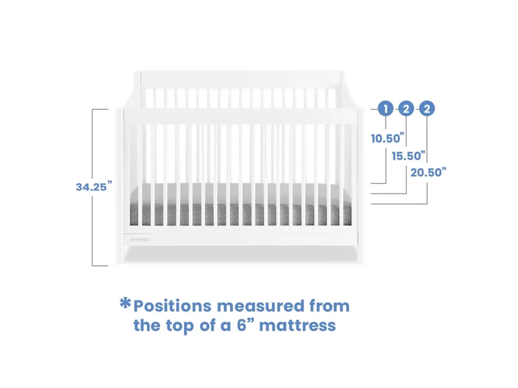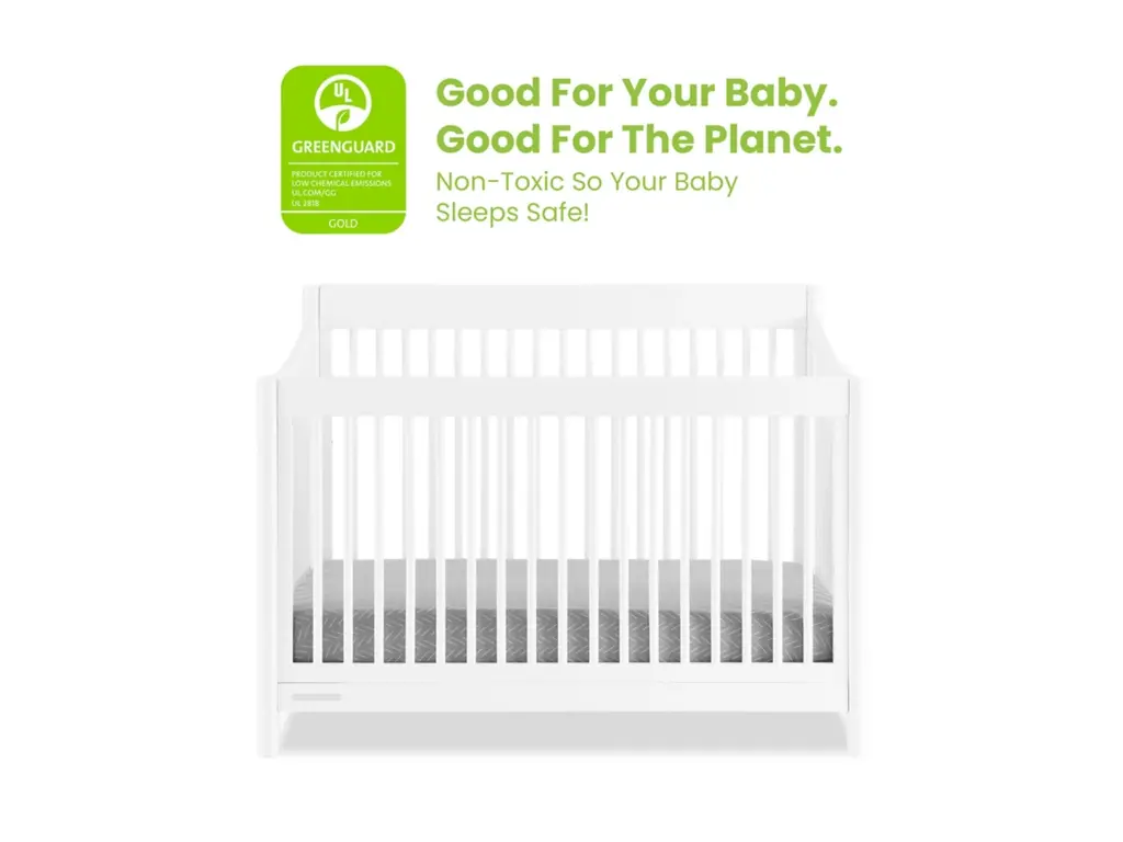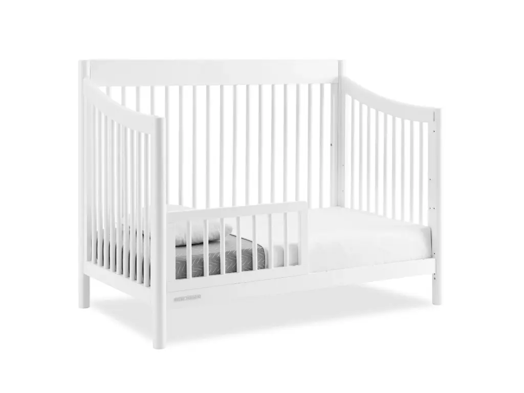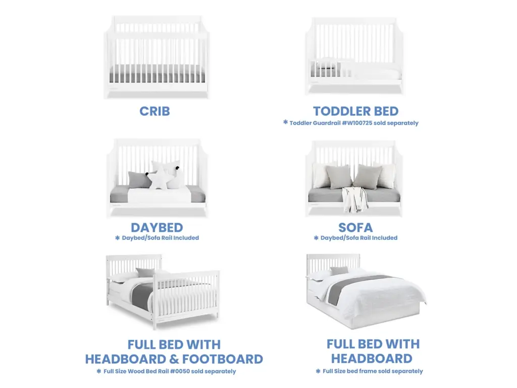 The mid-century design of the Brooks 6-in-1 Convertible Crib by Delta Children will anchor any nursery with welcoming and timeless style. Modern spindles on all four sides, swooping angles and circular posts complete the look of this must-have crib. Tailored to cater to your growing baby needs, this adaptable crib features an adjustable mattress support that can be lowered as your little one begins to sit or stand. And, when your child is ready, this crib can convert into a cozy toddler bed, daybed, sofa and a full size bed with or without a footboard (conversion rails sold separately). Plus, it's GREENGUARD Gold Certified, which means it built to contribute to cleaner air for a healthy home. Available in Bianca White and Midnight Grey. Finish your nursery with coordinating pieces from the Brooks Collection.