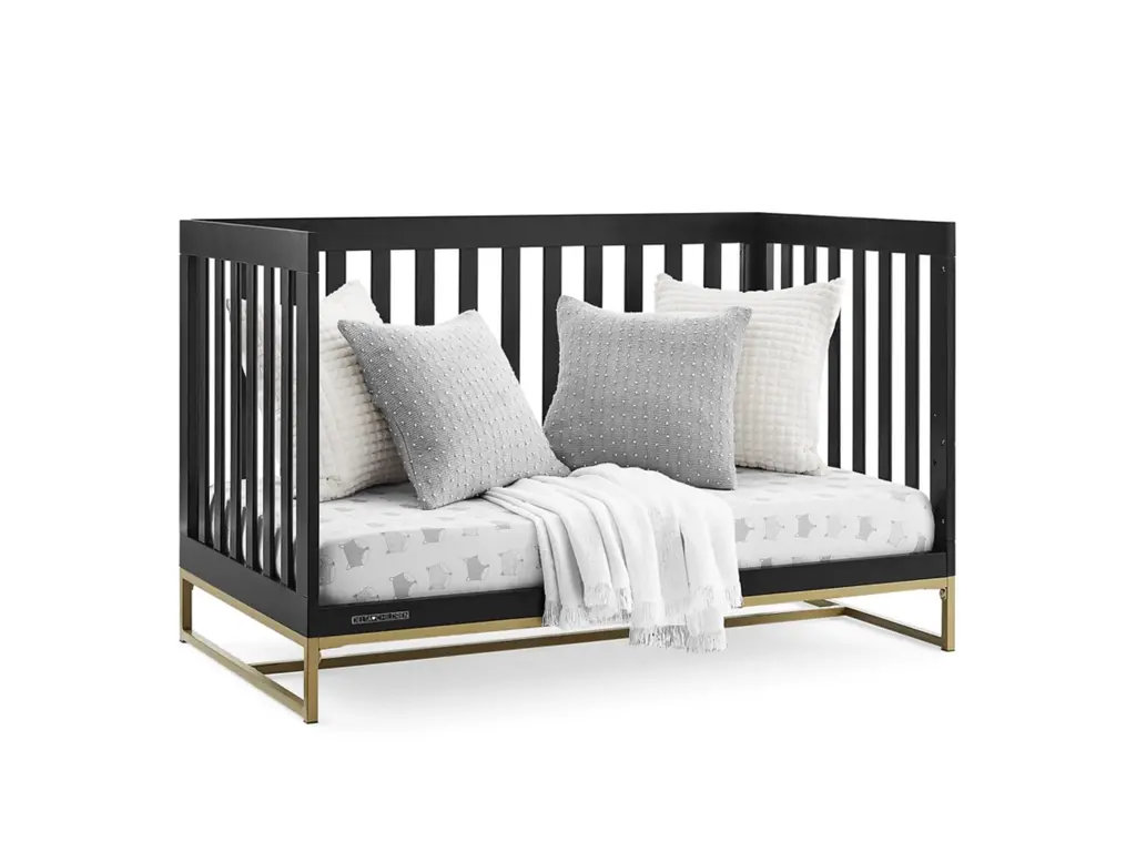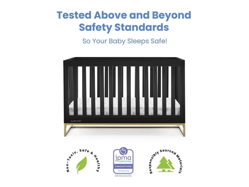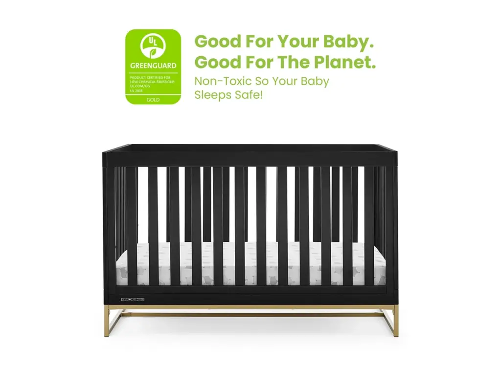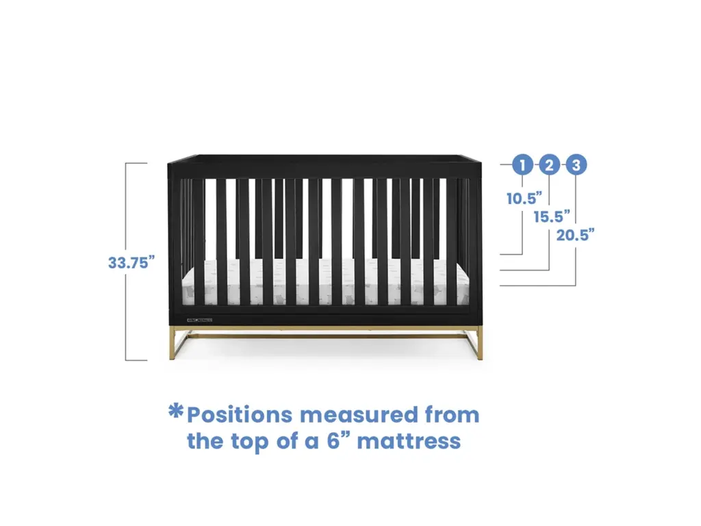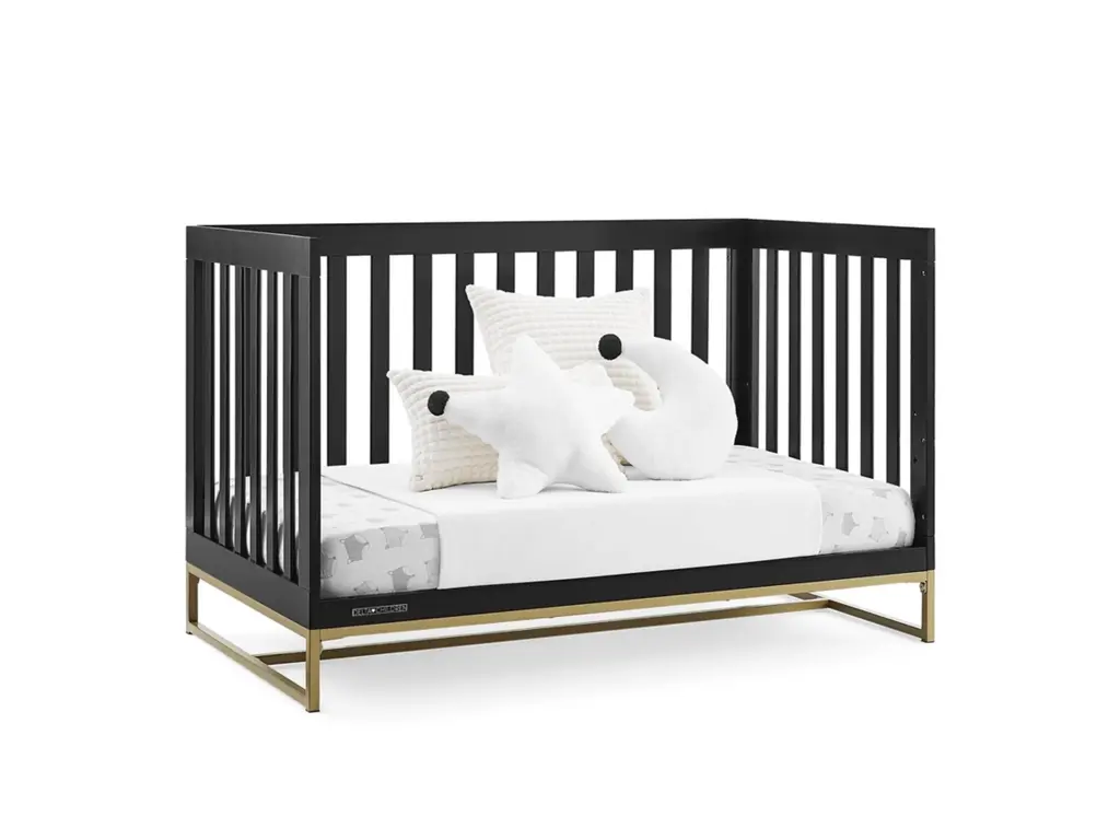 The Jade 4-in-1 Convertible Crib by Delta Children is the new gold standard for modern nurseries with its gorgeous bronze metal base. Stylish and safe, it GREENGUARD Gold Certified, which means it built to contribute to cleaner air for a healthy home. A standout piece for years to come, this crib features an adjustable mattress support that allows you to lower the mattress height as your baby grows. When your child is ready, its versatile design easily adapts from crib to a cozy toddler bed, daybed and sofa (Daybed/Sofa Rail included; Toddler Guardrail #0094 sold separately). The Jade 4-in-1 Convertible Crib by Delta Children is available in Bianca White and Ebony. Coordinates with the Jade Changing Table (sold separately).