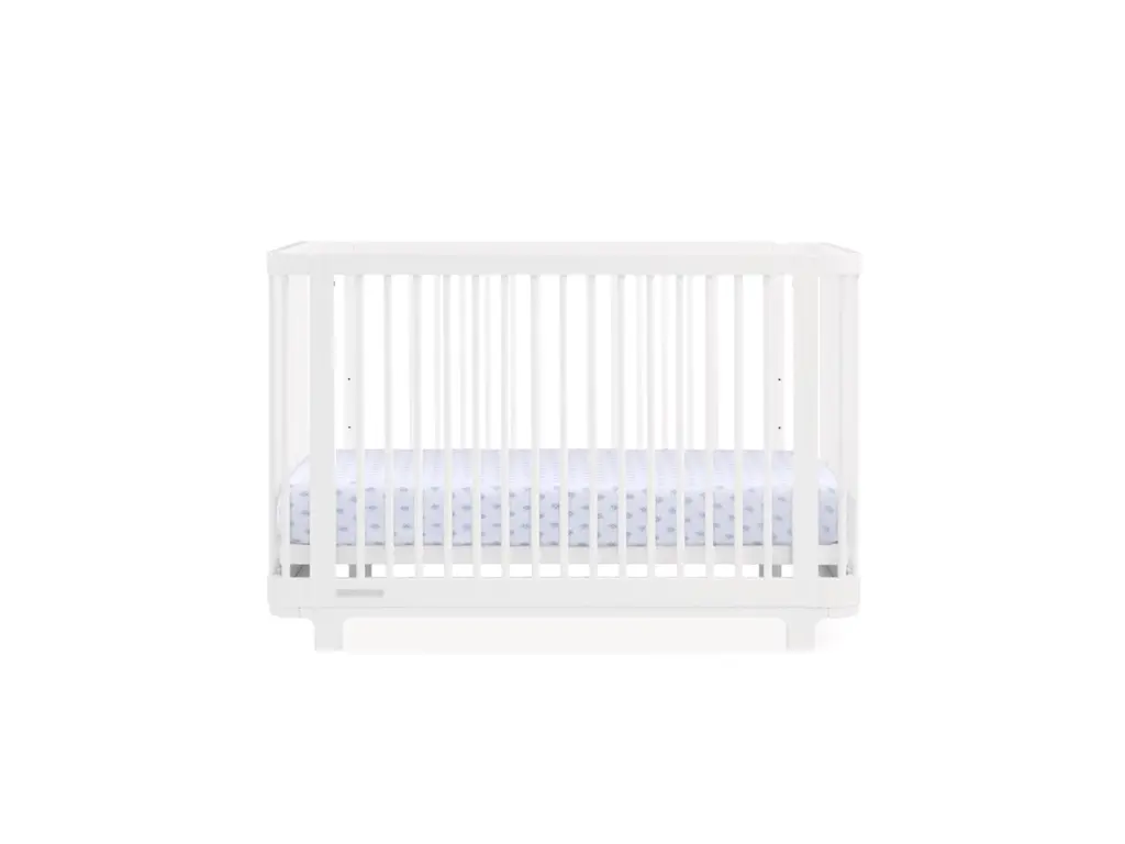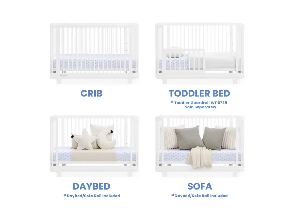 The Nest 4-in-1 Convertible Crib by Delta Children is the perfect sanctuary for your baby. Its gently curved corners, stylish rounded spindles and playfully arched feet turn your nursery into a modern oasis. With a unique 4-in-1 design, the Nest 4-in-1 Convertible Crib can grow right alongside your little one. Watch it transform from a crib with three adjustable mattress heights, to a toddler bed, a daybed, and finally to a sofa (Daybed/Sofa Rail included, Toddler Guardrail sold separately). Crafted from premium wood and sustainably sourced, non-toxic materials, this crib is a safe and healthy choice for your nursery. Available in Bianca White, Acorn and Light Sage.