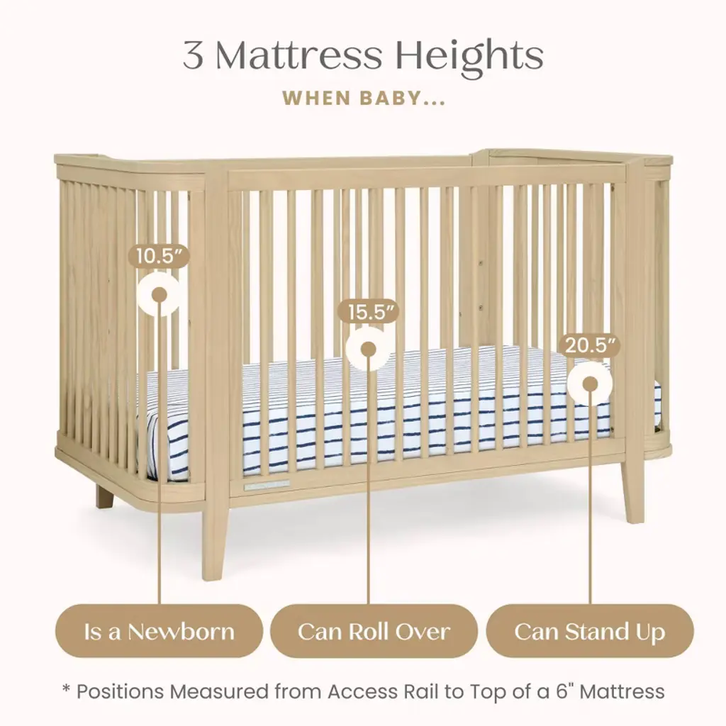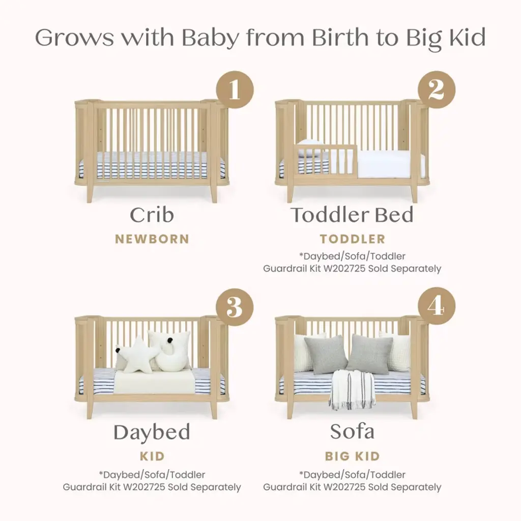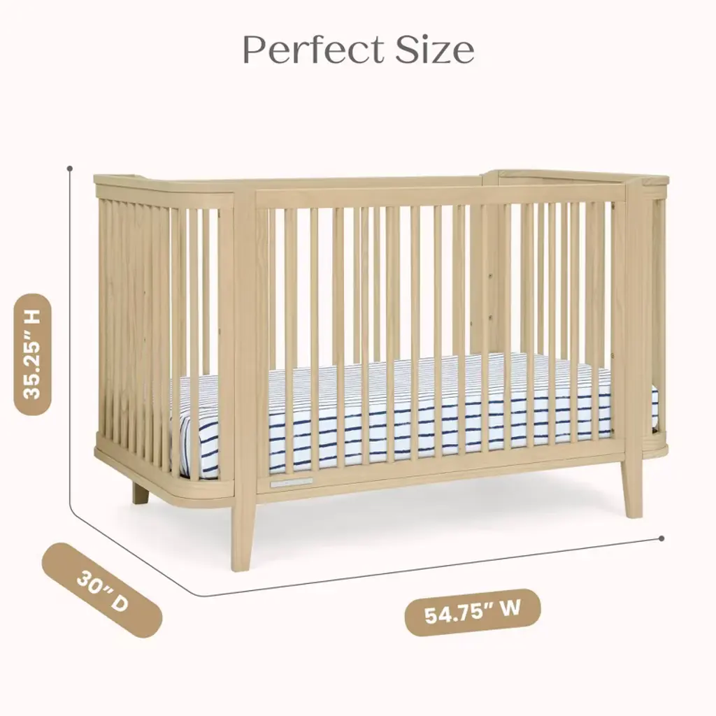 A timeless crib with a modern twist, the Noah 4-in-1 Convertible Crib by Delta Children boasts an organically shaped design with rounded corners, spindles and tapered legs. Crafted to last, it features solid pine construction for support and durability. Plus, it can grow with your little one—simply convert this crib into toddler bed, daybed or sofa when your child is ready (Daybed/Sofa/Toddler Guardrail #W202725 sold separately). With three mattress positions that easily lower as your baby begins to sit, pull up and stand, you can find the height that’s best for them at every stage. Plus, it’s GREENGUARD Gold Certified, which means it’s built to contribute to cleaner air for a healthy home. Crib mattress sold separately.