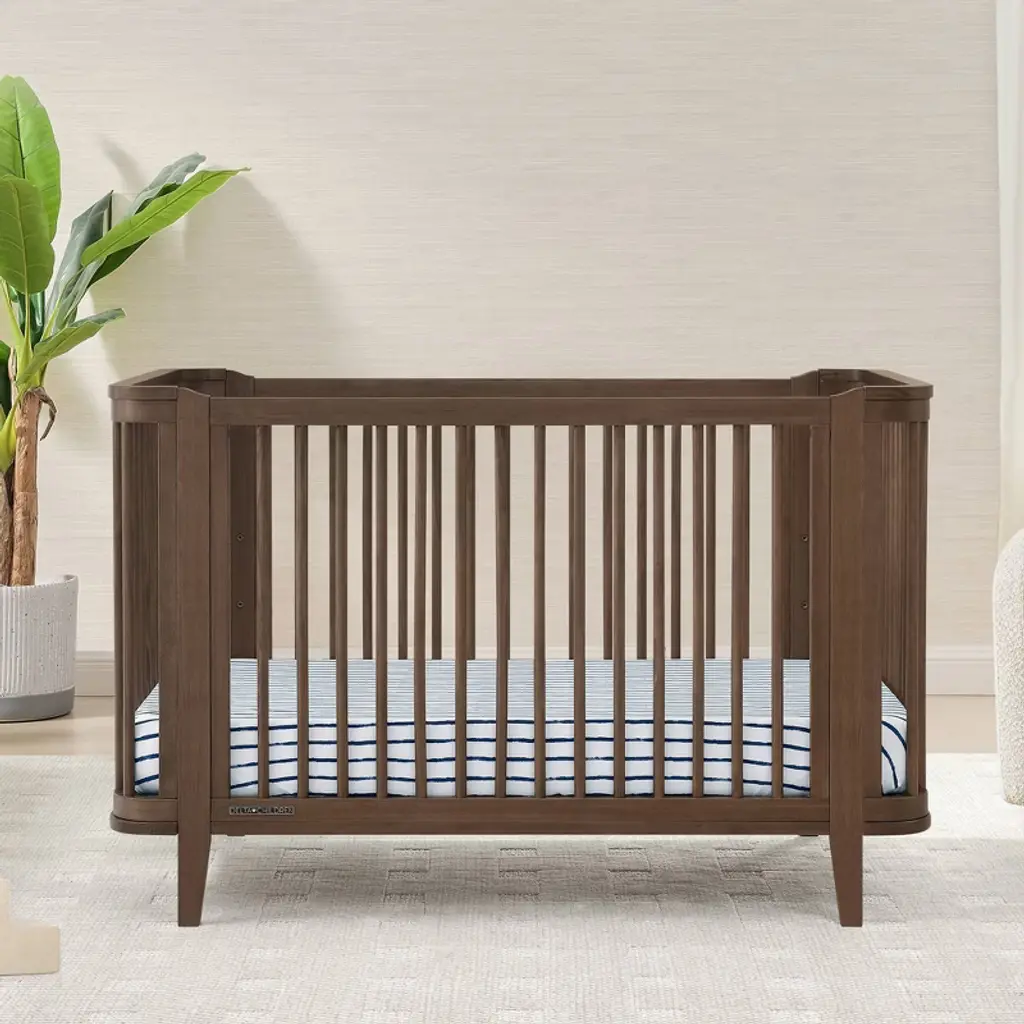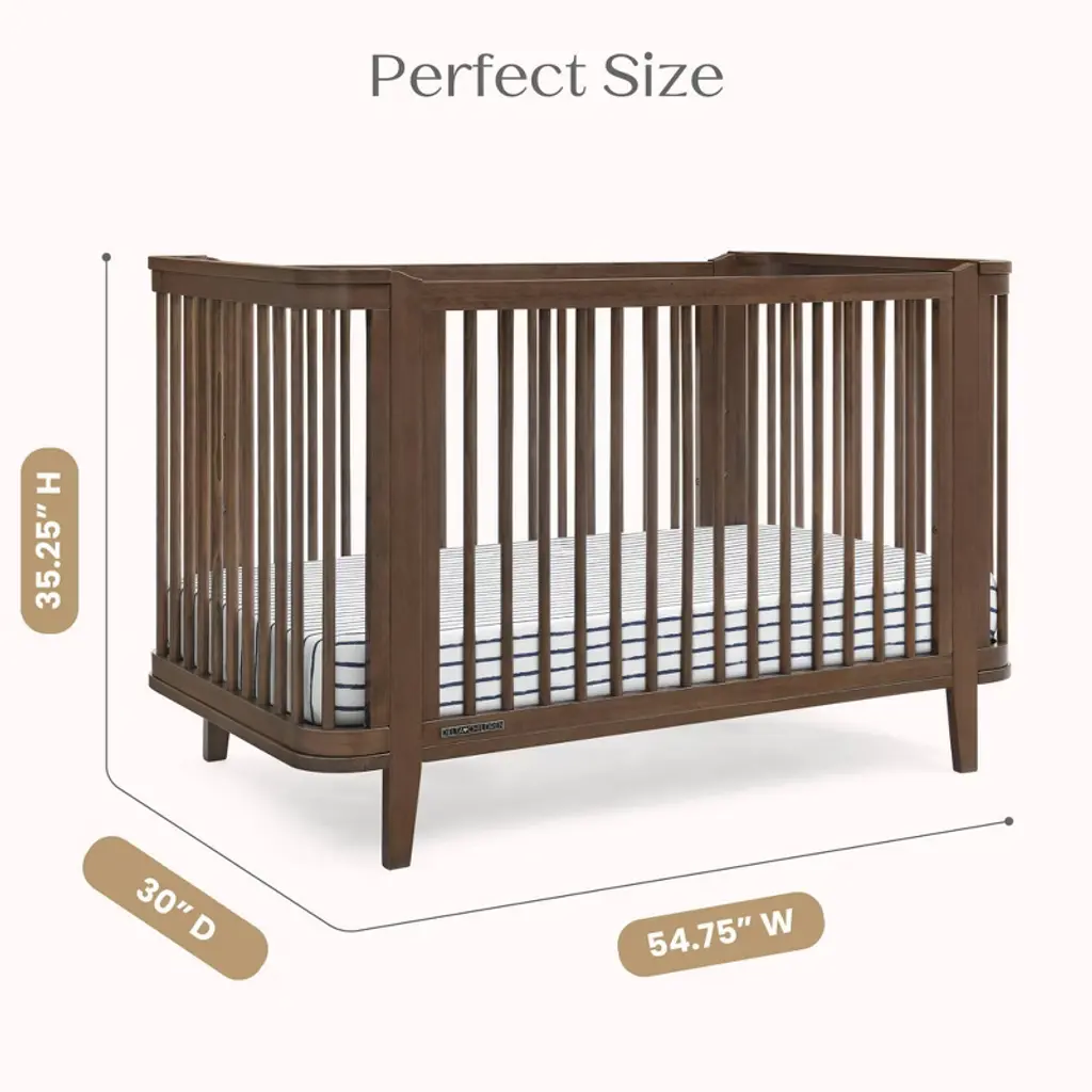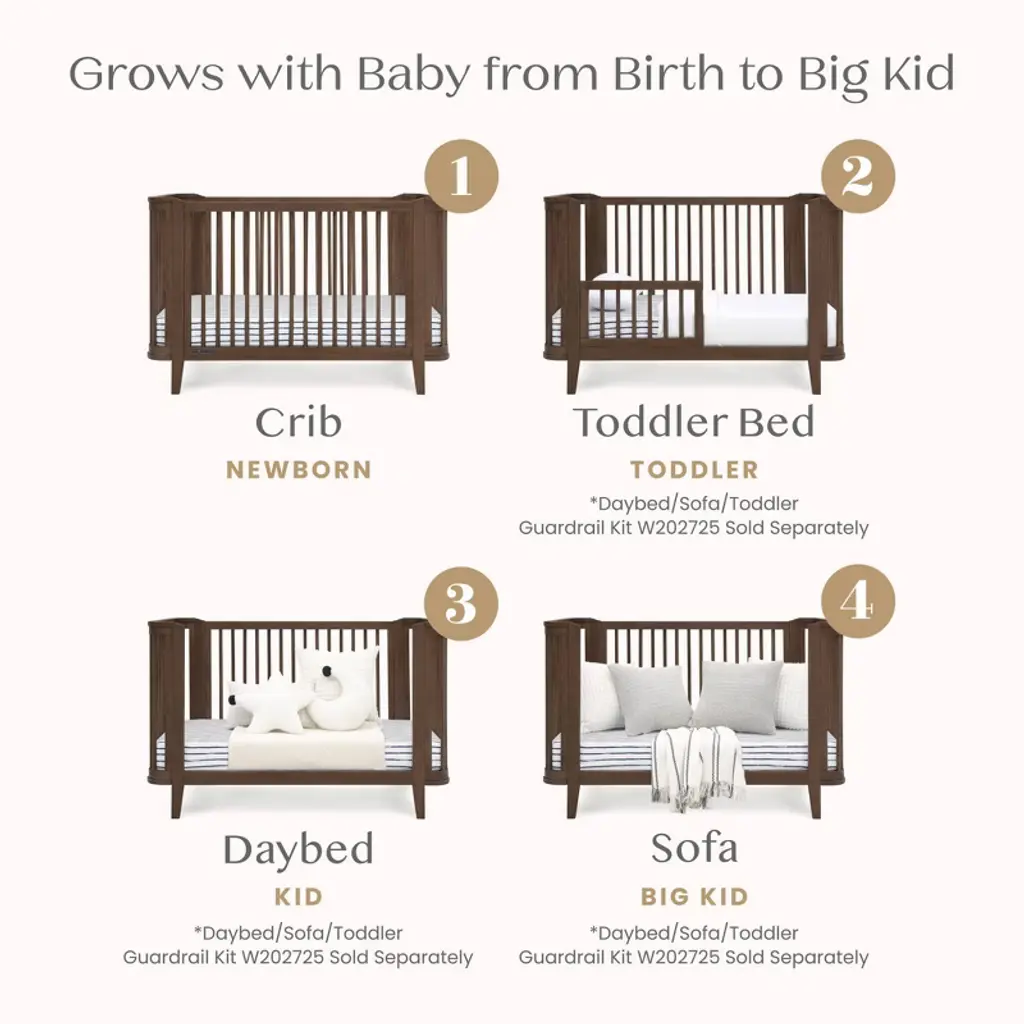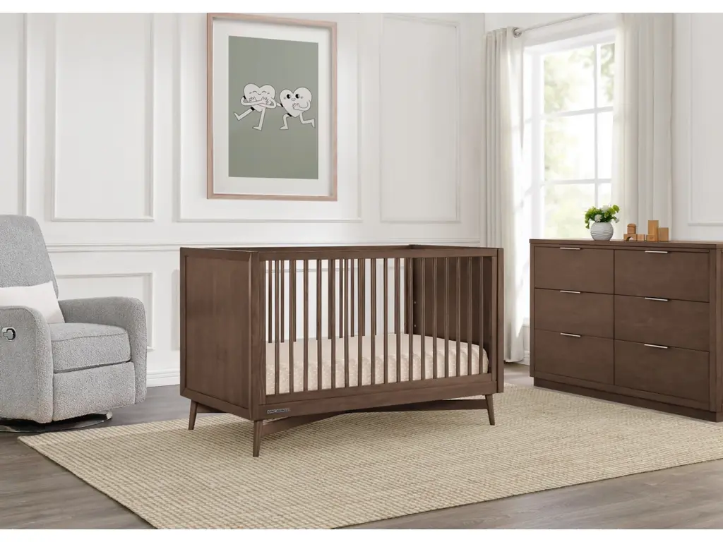A timeless crib with a modern twist, the Noah 4-in-1 Convertible Crib by Delta Children boasts an organically shaped design with rounded corners, spindles and tapered legs. Crafted to last, it features solid pine construction for support and durability. Plus, it can grow with your little one—simply convert this crib into toddler bed, daybed or sofa when your child is ready (Daybed/Sofa/Toddler Guardrail #W202725 sold separately). With three mattress positions that easily lower as your baby begins to sit, pull up and stand, you can find the height that’s best for them at every stage. Plus, it’s GREENGUARD Gold Certified, which means it’s built to contribute to cleaner air for a healthy home. Crib mattress sold separately.