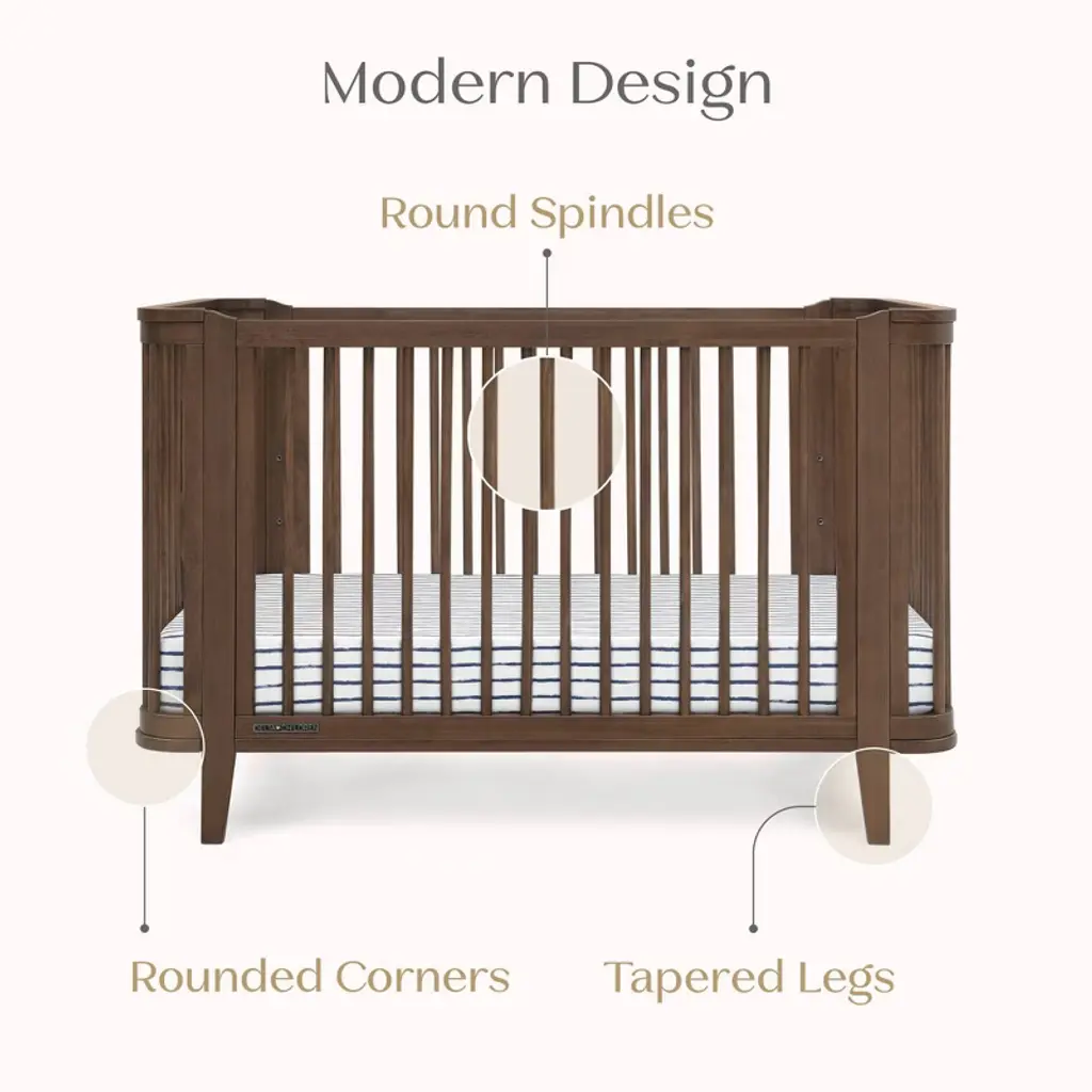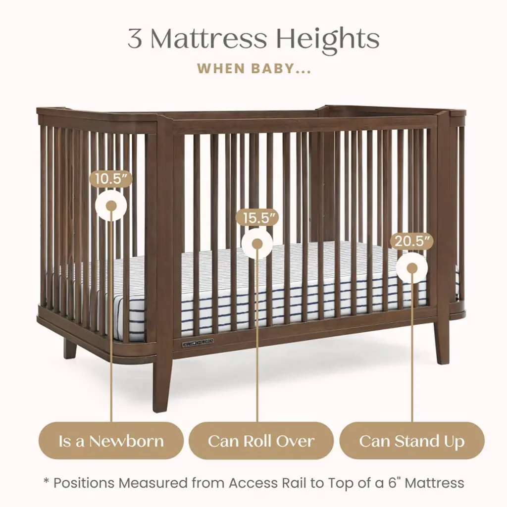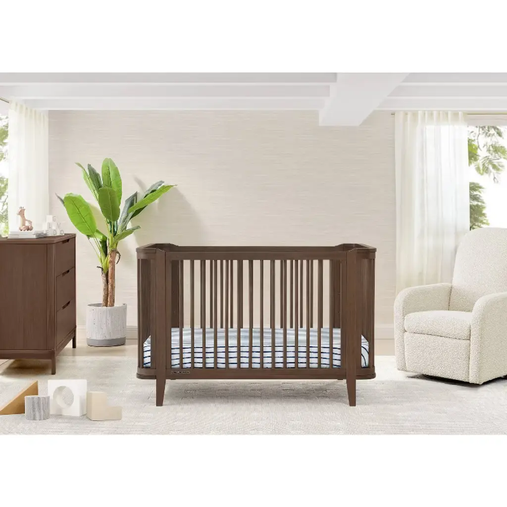 A timeless crib with a modern twist, the Noah 4-in-1 Convertible Crib by Delta Children boasts an organically shaped design with rounded corners, spindles and tapered legs. Crafted to last, it features solid pine construction for support and durability. Plus, it can grow with your little one—simply convert this crib into toddler bed, daybed or sofa when your child is ready (Daybed/Sofa/Toddler Guardrail #W202725 sold separately). With three mattress positions that easily lower as your baby begins to sit, pull up and stand, you can find the height that’s best for them at every stage. Plus, it’s GREENGUARD Gold Certified, which means it’s built to contribute to cleaner air for a healthy home. Crib mattress sold separately.