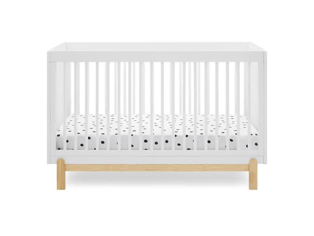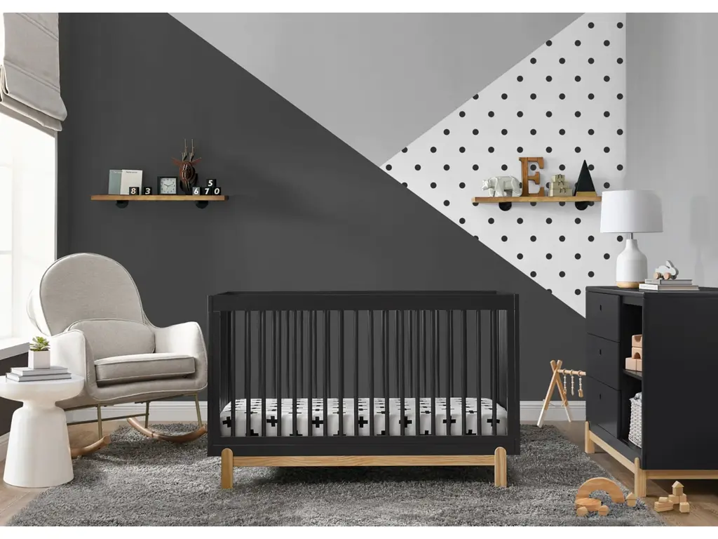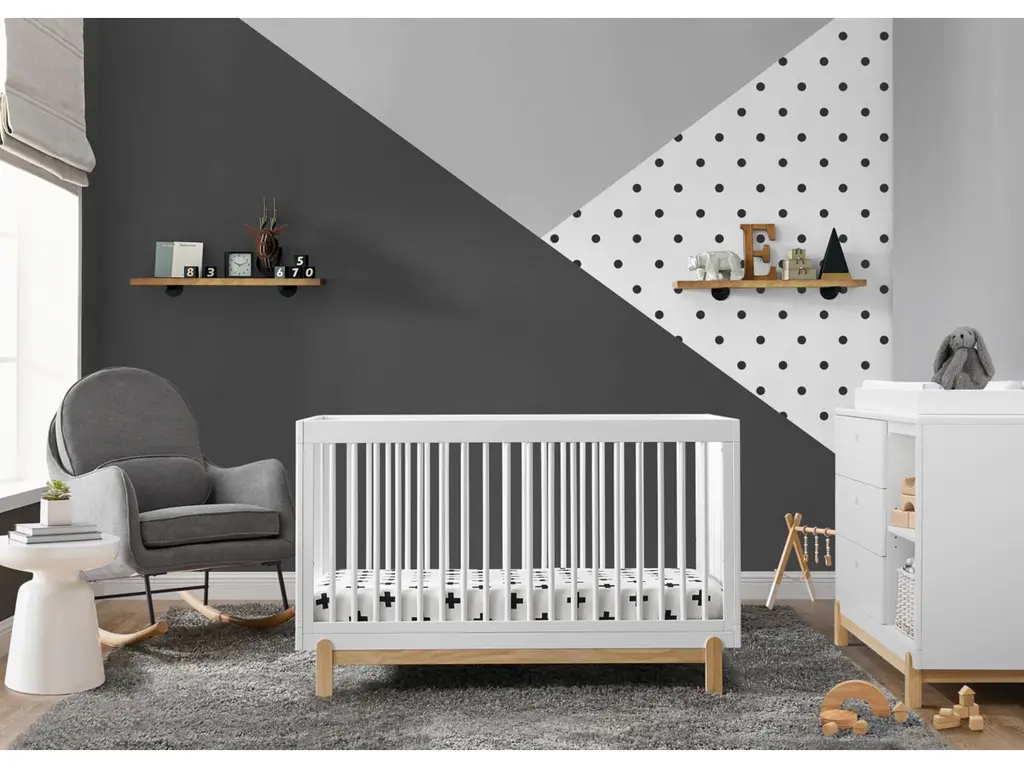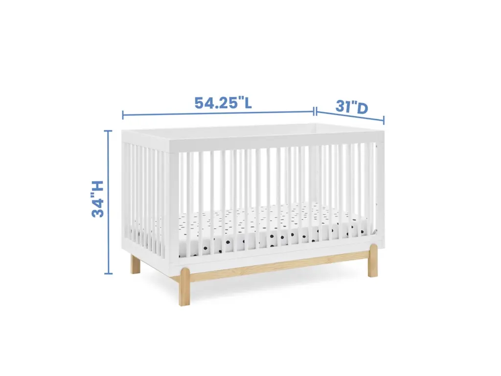 The stylish two-tone Poppy 4-in-1 convertible crib will be the centerpiece of your little one’s bedroom for years to come. The warm, natural wood tone of the base and feet is paired with contrasting round spindles to create a modern, sleek style that adapts to all your child’s sleep needs from baby to big kid. The baby crib converts into a toddler bed, daybed and sofa as your child grows. To complete your nursery, pair it with the Poppy 3-drawer dresser with cubbies.