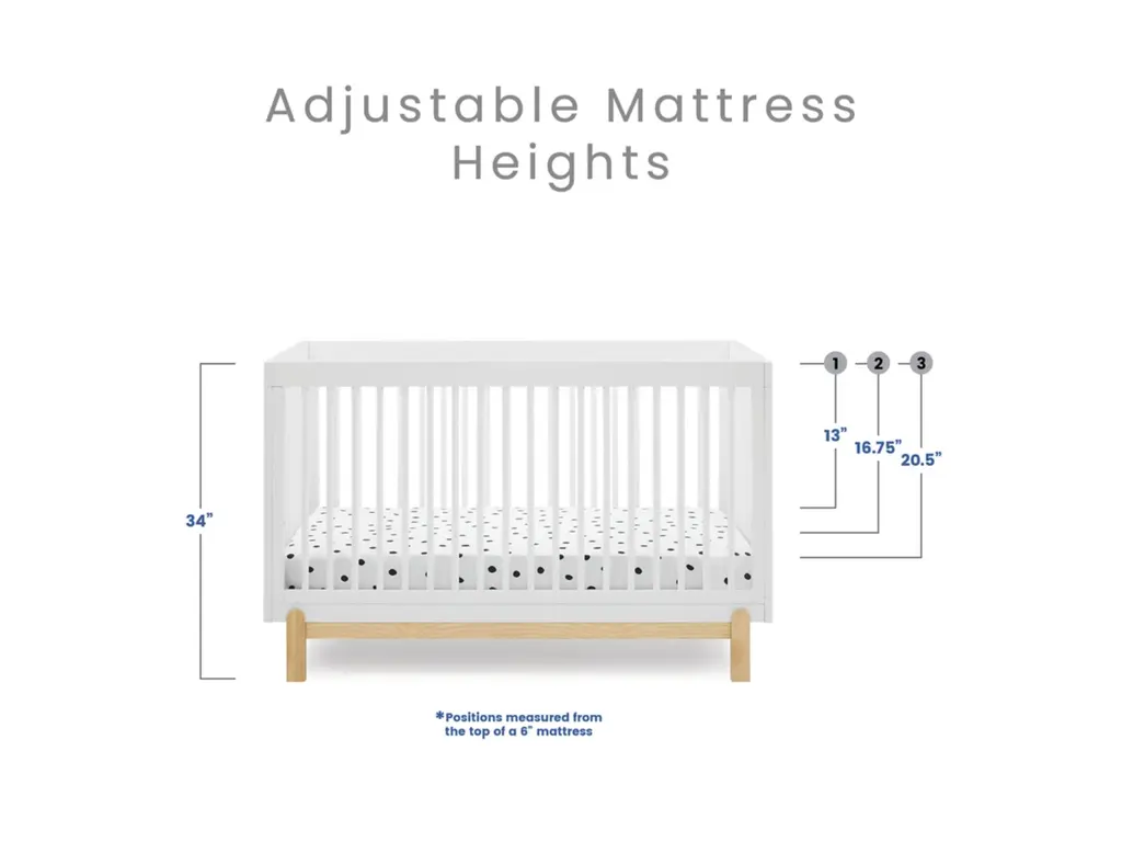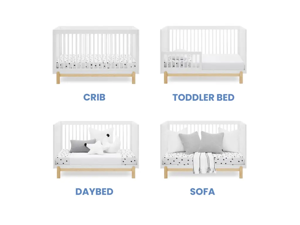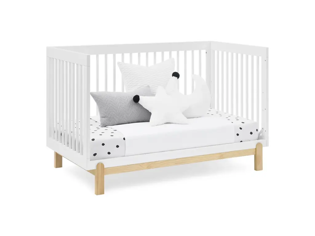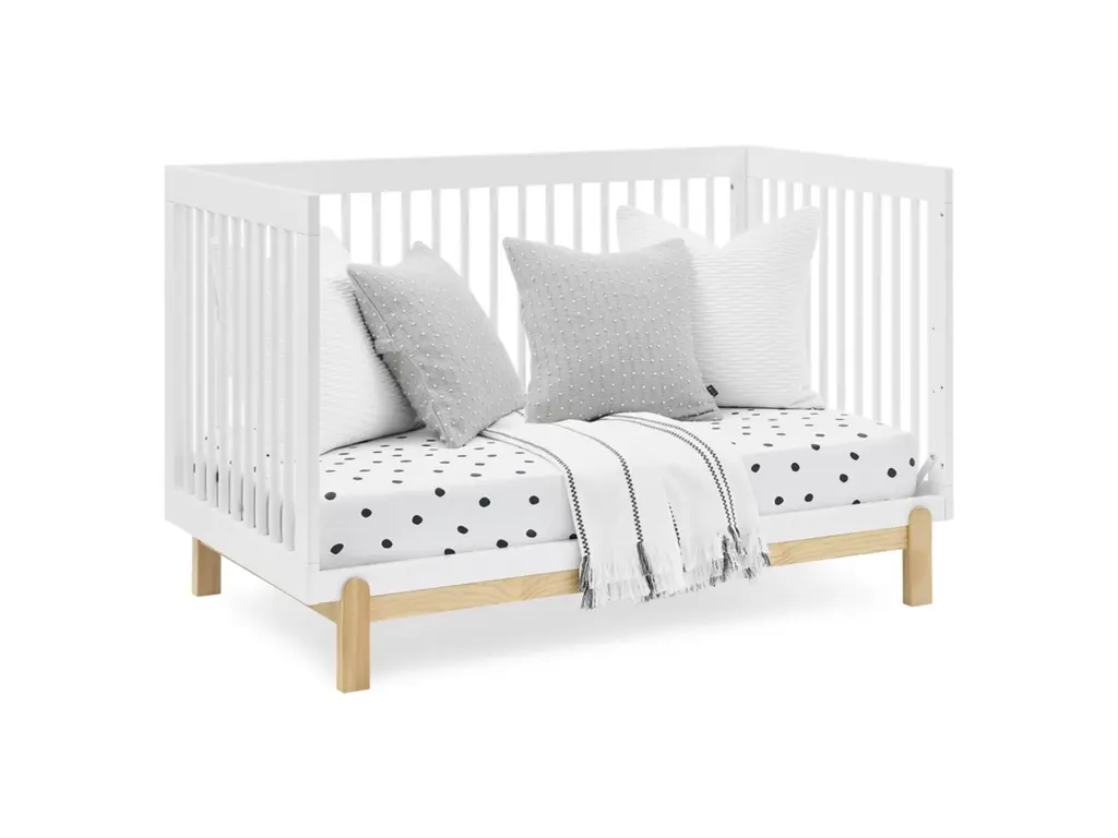 The stylish two-tone Poppy 4-in-1 convertible crib will be the centerpiece of your little one’s bedroom for years to come. The warm, natural wood tone of the base and feet is paired with contrasting round spindles to create a modern, sleek style that adapts to all your child’s sleep needs from baby to big kid. The baby crib converts into a toddler bed, daybed and sofa as your child grows. To complete your nursery, pair it with the Poppy 3-drawer dresser with cubbies.