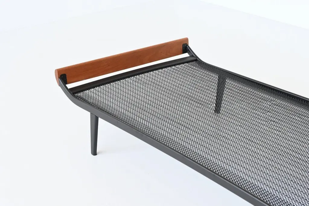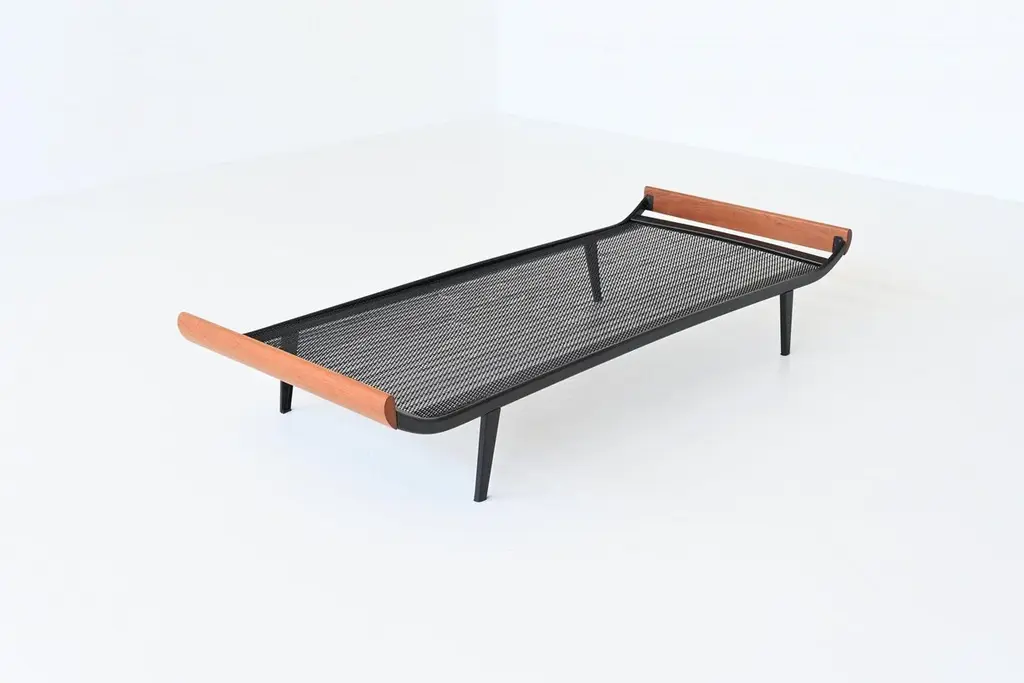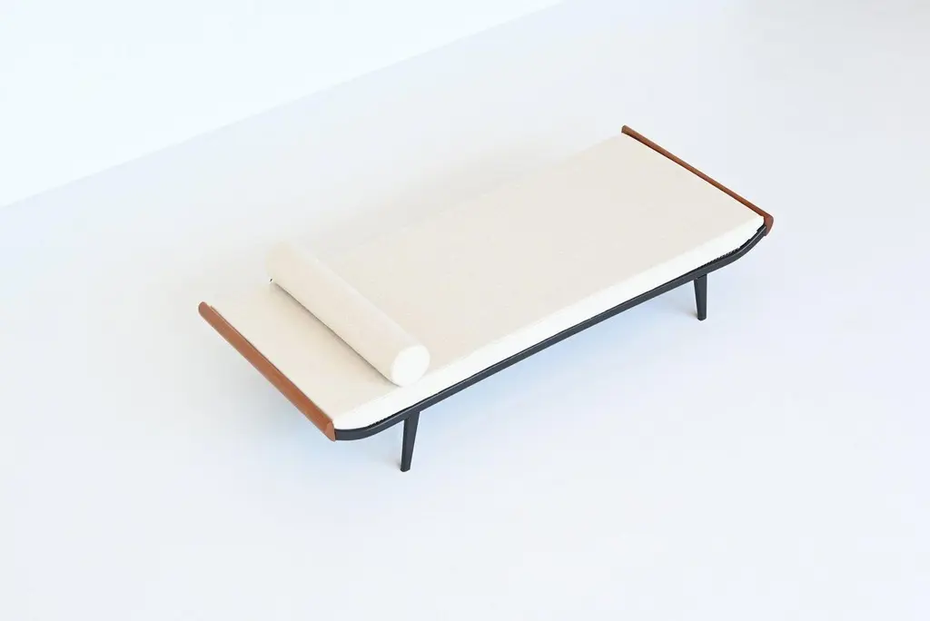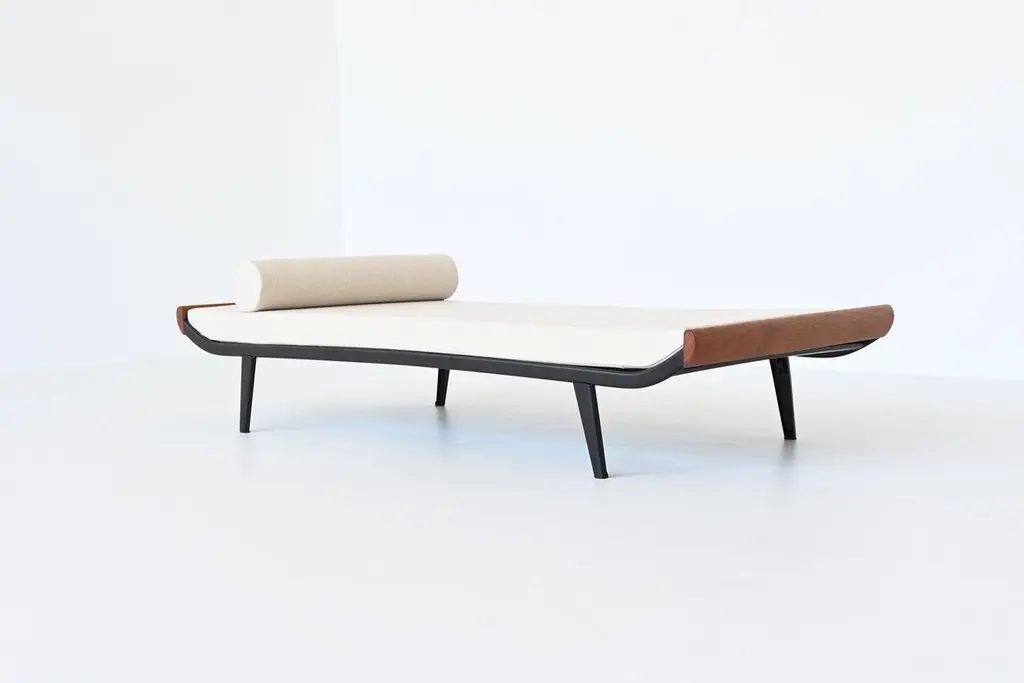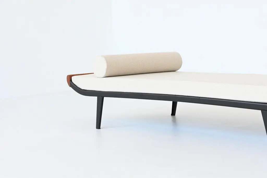 Beautiful and iconic Cleopatra daybed designed by Dick Cordemeijer for Auping, The Netherlands 1954. This timeless daybed is a hallmark of mid-century modern Dutch design, blending functionality with aesthetic appeal. The frame is made of black coated metal and the ends are in solid rich teak wood, highlighting the natural beauty and fine grain of the material. The mattress is upholstered in a high-quality off-white wool fabric, providing both comfort and durability.The sleek, minimalist lines and the warm, inviting texture of the wool make this piece a perfect addition to any modern interior. Typical industrial Dutch design from the 1950s, reflecting an era when simplicity and functionality were paramount. This very nice modernist daybed is in excellent condition.As all of our upholstered pieces, this daybed can also be newly upholstered with any fabric you prefer. We use the best quality foam and materials in combination with the upholstery you choose. For more advices or to get an affordable offer, please contact us at any time.Please contact us for an affordable and non-profit global shipping quote. We also provide express and white gloves delivery service. We will get in touch with you within 24 hours.Estimated shipping costs: Europe: € 50 - € 250 Outside Europe: € 250 - € 750