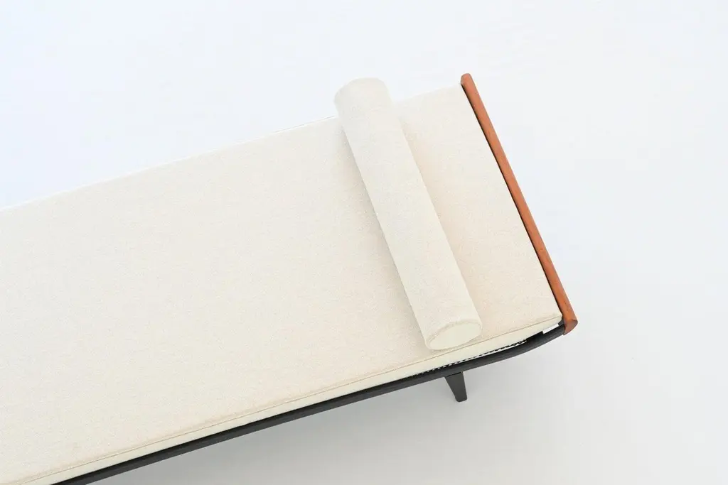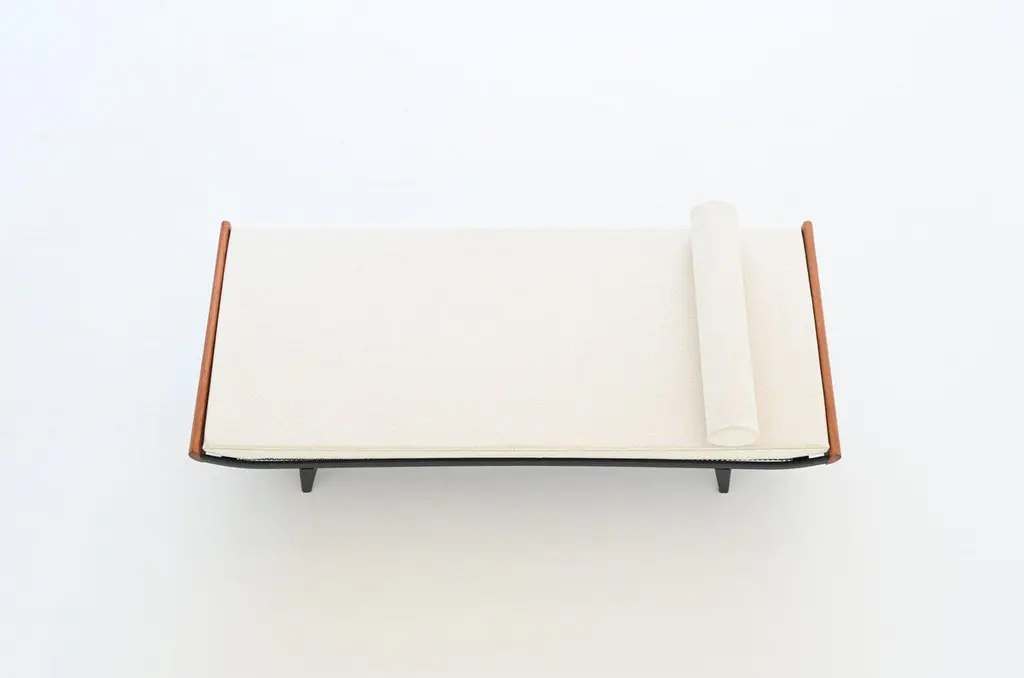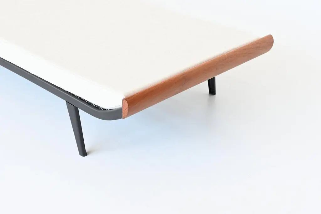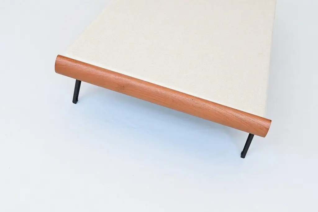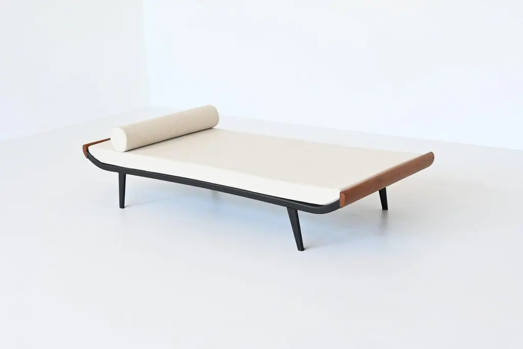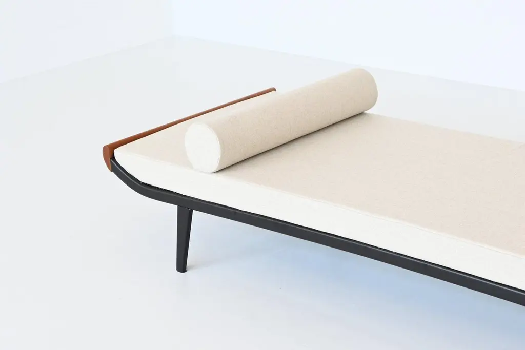 Beautiful and iconic Cleopatra daybed designed by Dick Cordemeijer for Auping, The Netherlands 1954. This timeless daybed is a hallmark of mid-century modern Dutch design, blending functionality with aesthetic appeal. The frame is made of black coated metal and the ends are in solid rich teak wood, highlighting the natural beauty and fine grain of the material. The mattress is upholstered in a high-quality off-white wool fabric, providing both comfort and durability.The sleek, minimalist lines and the warm, inviting texture of the wool make this piece a perfect addition to any modern interior. Typical industrial Dutch design from the 1950s, reflecting an era when simplicity and functionality were paramount. This very nice modernist daybed is in excellent condition.As all of our upholstered pieces, this daybed can also be newly upholstered with any fabric you prefer. We use the best quality foam and materials in combination with the upholstery you choose. For more advices or to get an affordable offer, please contact us at any time.Please contact us for an affordable and non-profit global shipping quote. We also provide express and white gloves delivery service. We will get in touch with you within 24 hours.Estimated shipping costs: Europe: € 50 - € 250 Outside Europe: € 250 - € 750