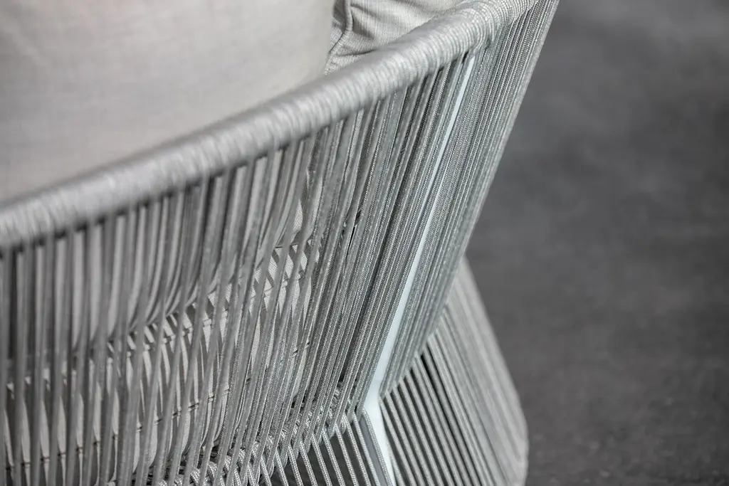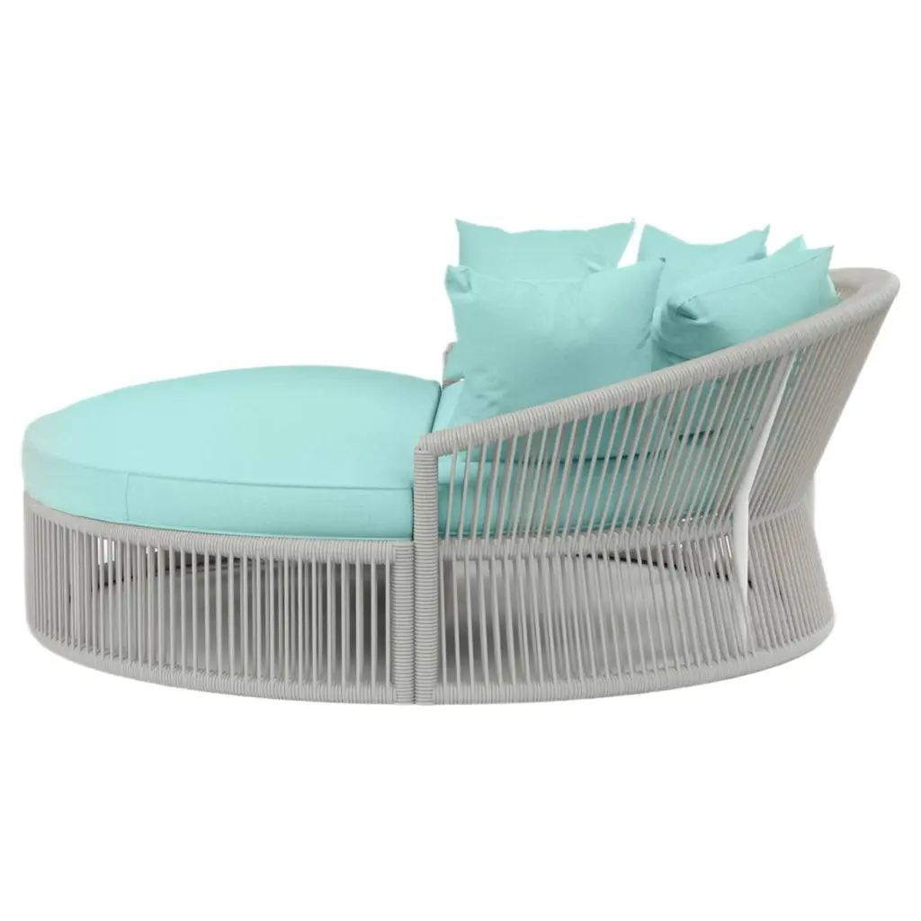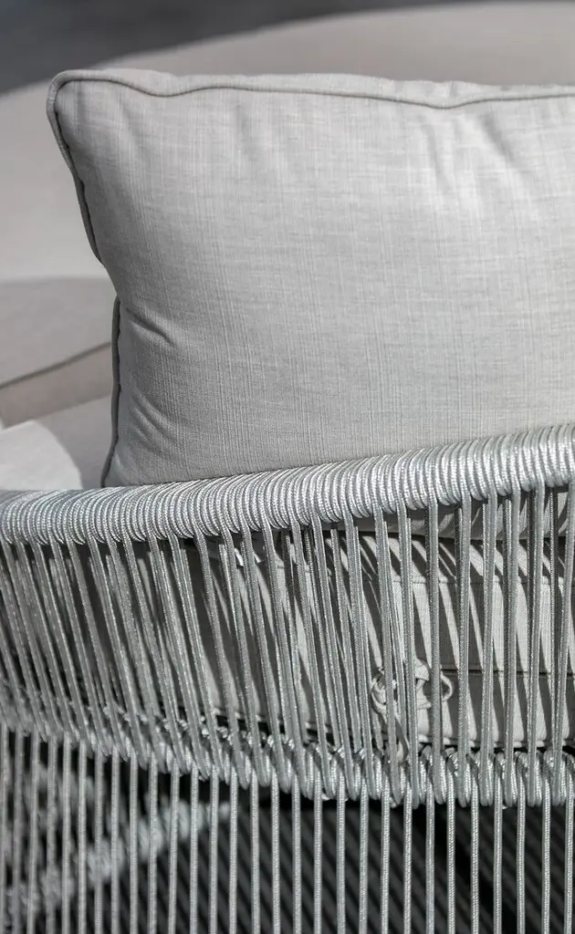 The Dola Daybed embodies clean lines and thoughtful angles with its curved frame and striated rope design. Its rust-free aluminum frame is expertly hand wrapped with premium all-weather olefin rope, with plush 6" cushions and included back throw pillows for ultimate relaxation.
