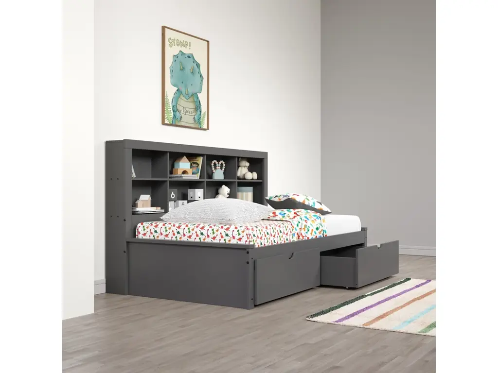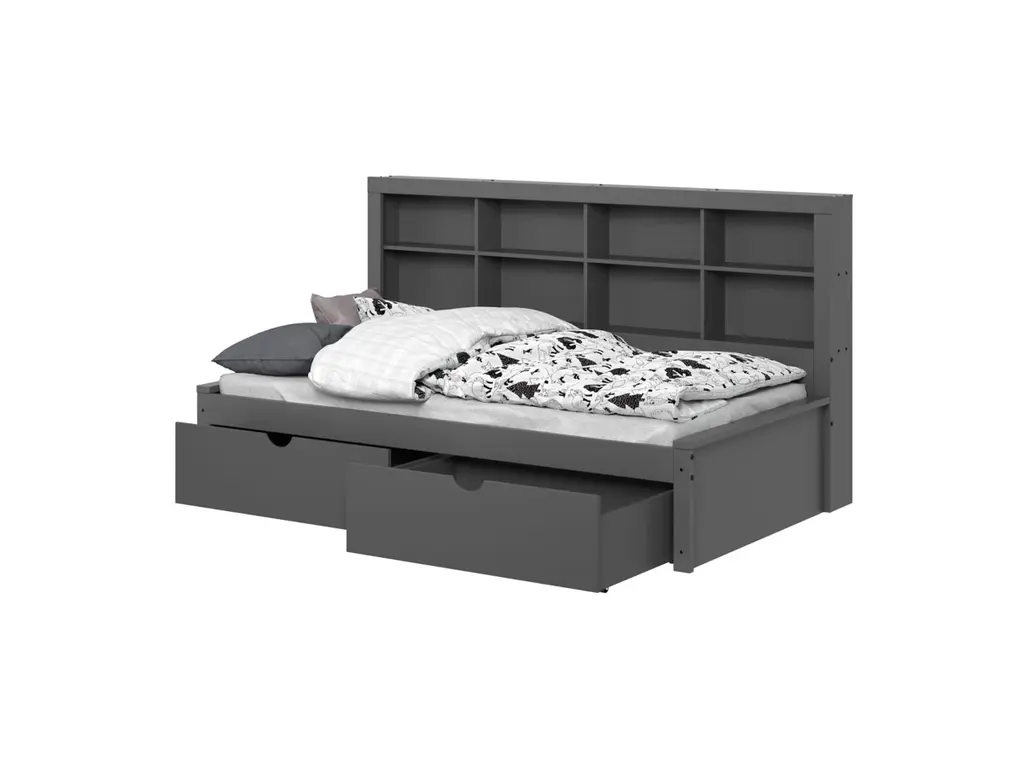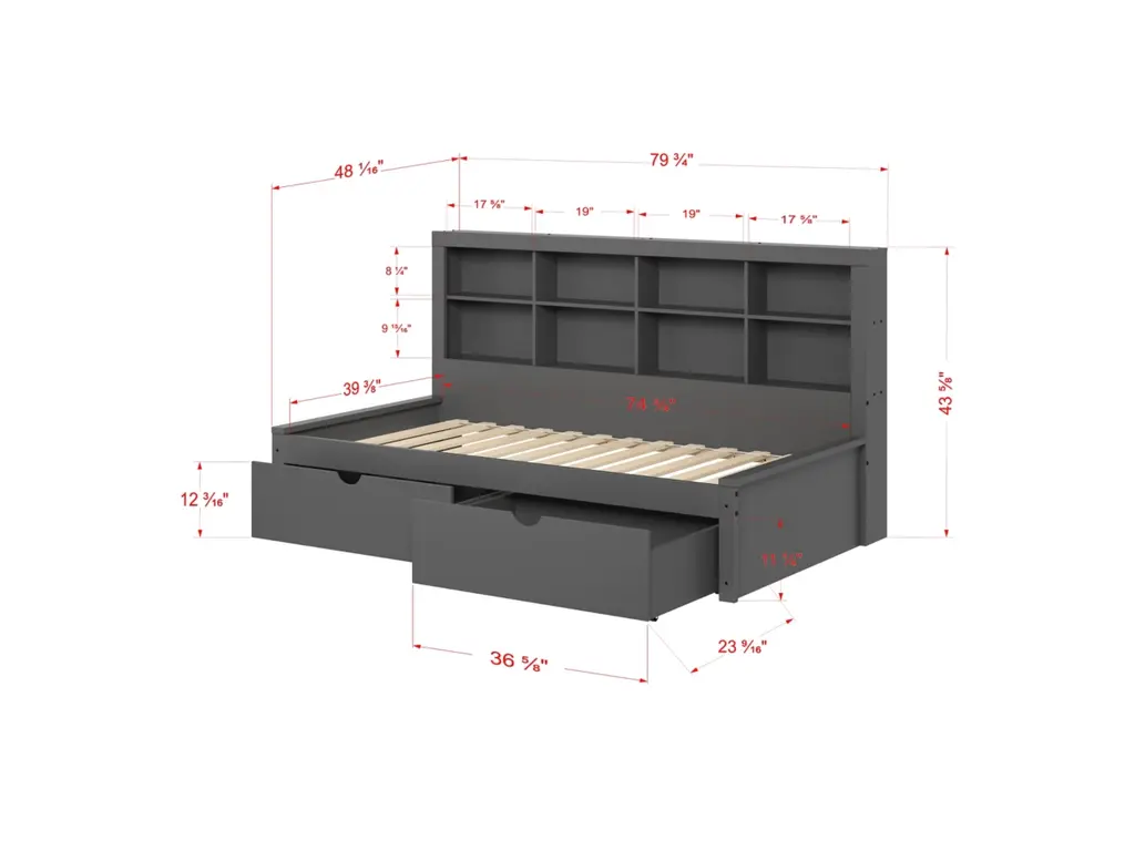 Donco's new twin size Daybed with built in bookshelves is perfect for any child looking for that extra storage space. Great for maximizing space and keeping the room tidy. Dual underbed drawers included for extra organization.