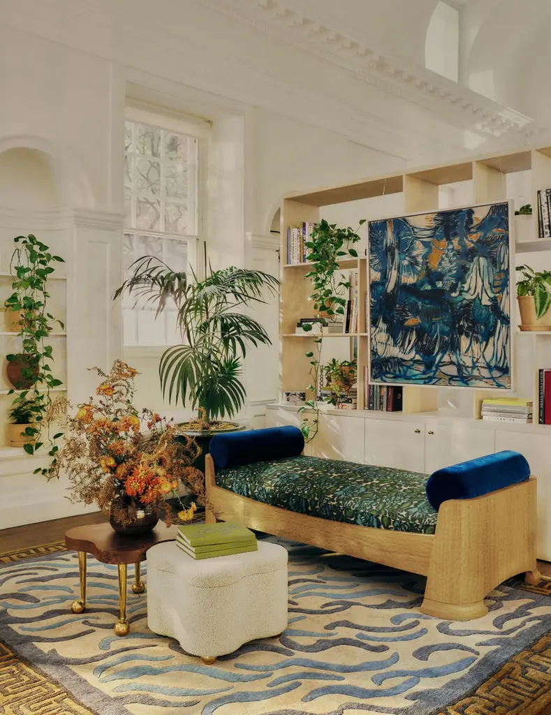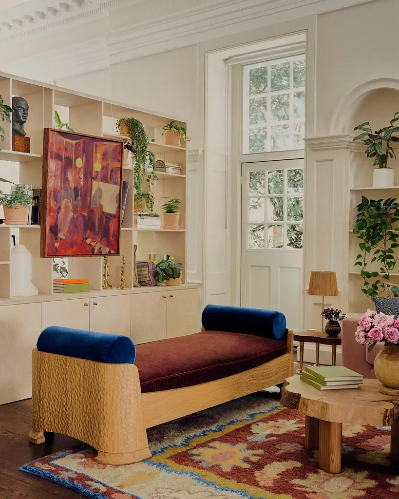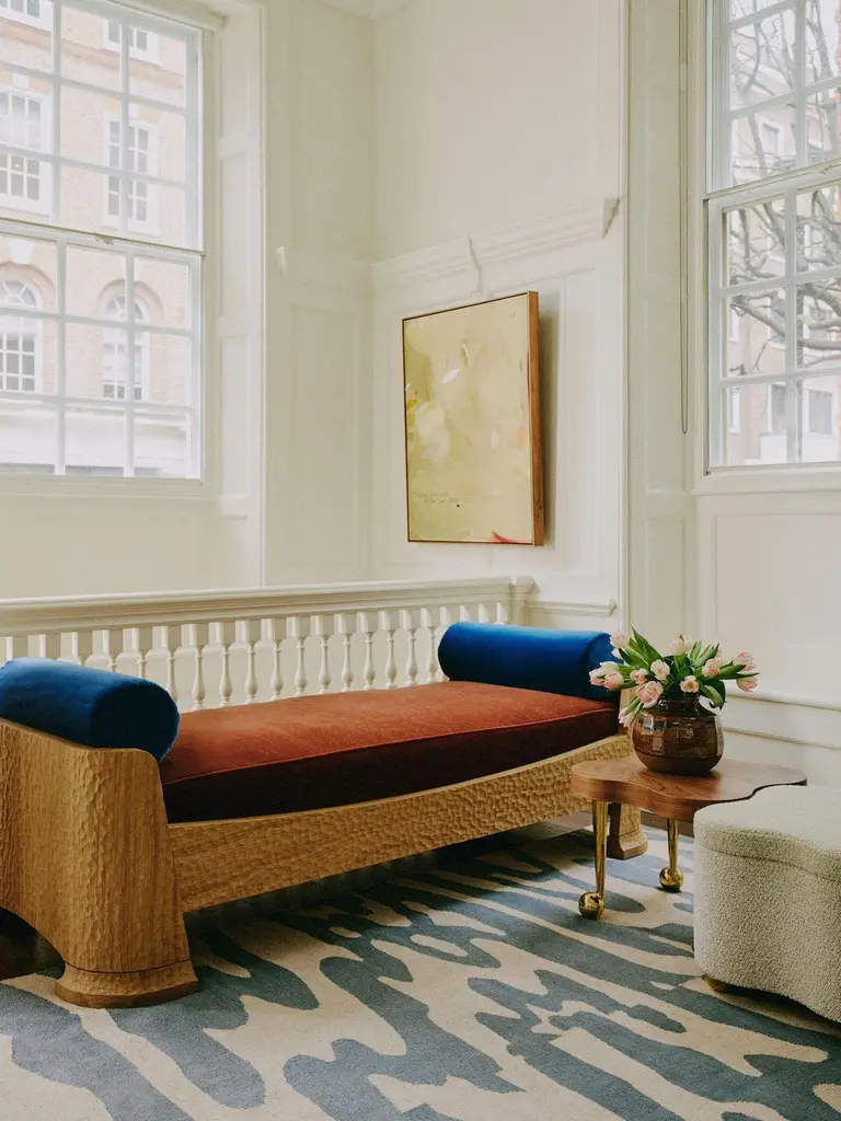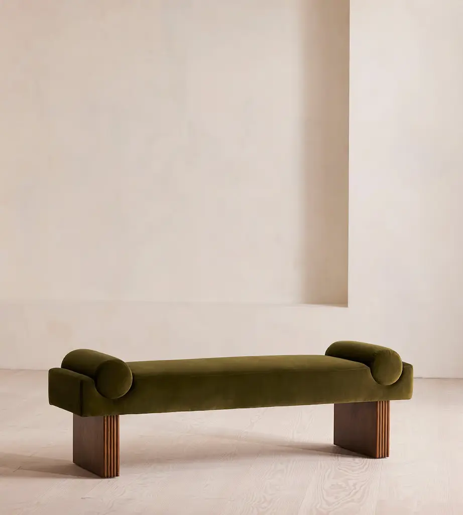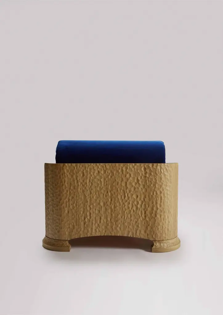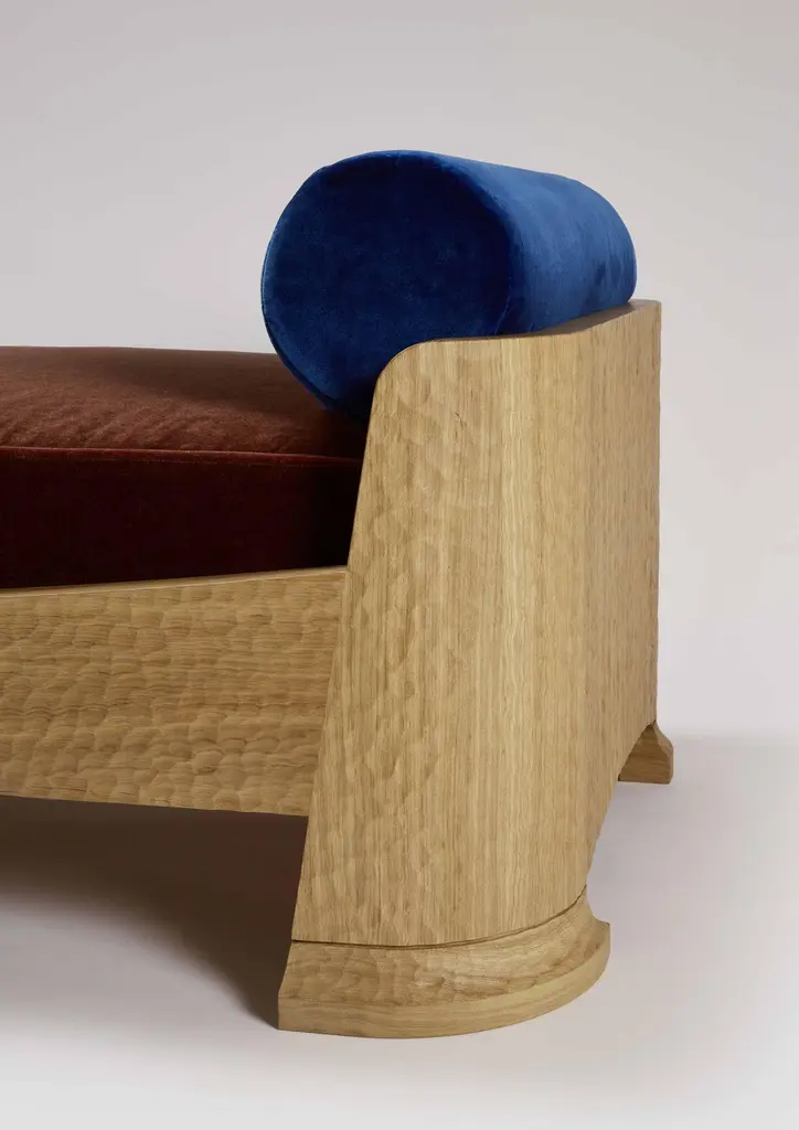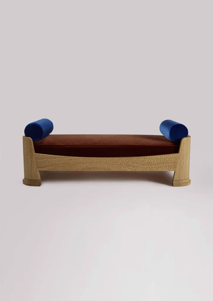 Introducing the Ellie Daybed – a stunning piece of furniture that’s inspired by the majestic African Forest Elephant. Hand carved with an Adze texture from high-quality oak that is burnished and clear oiled.This item is made to order in the UK, so please allow 12-16 weeks for production. If you're looking for something unique, we also provide the option to use Customers Own Material so it is tailored just for you. The Ellie Daybed features a plush feather and foam mattress upholstered in a luxurious burgundy mohair fabric. Soft and inviting, it’s the perfect place to relax and unwind after a long day. For added comfort and style, the bolster cushions are upholstered in a cobalt blue velvet.